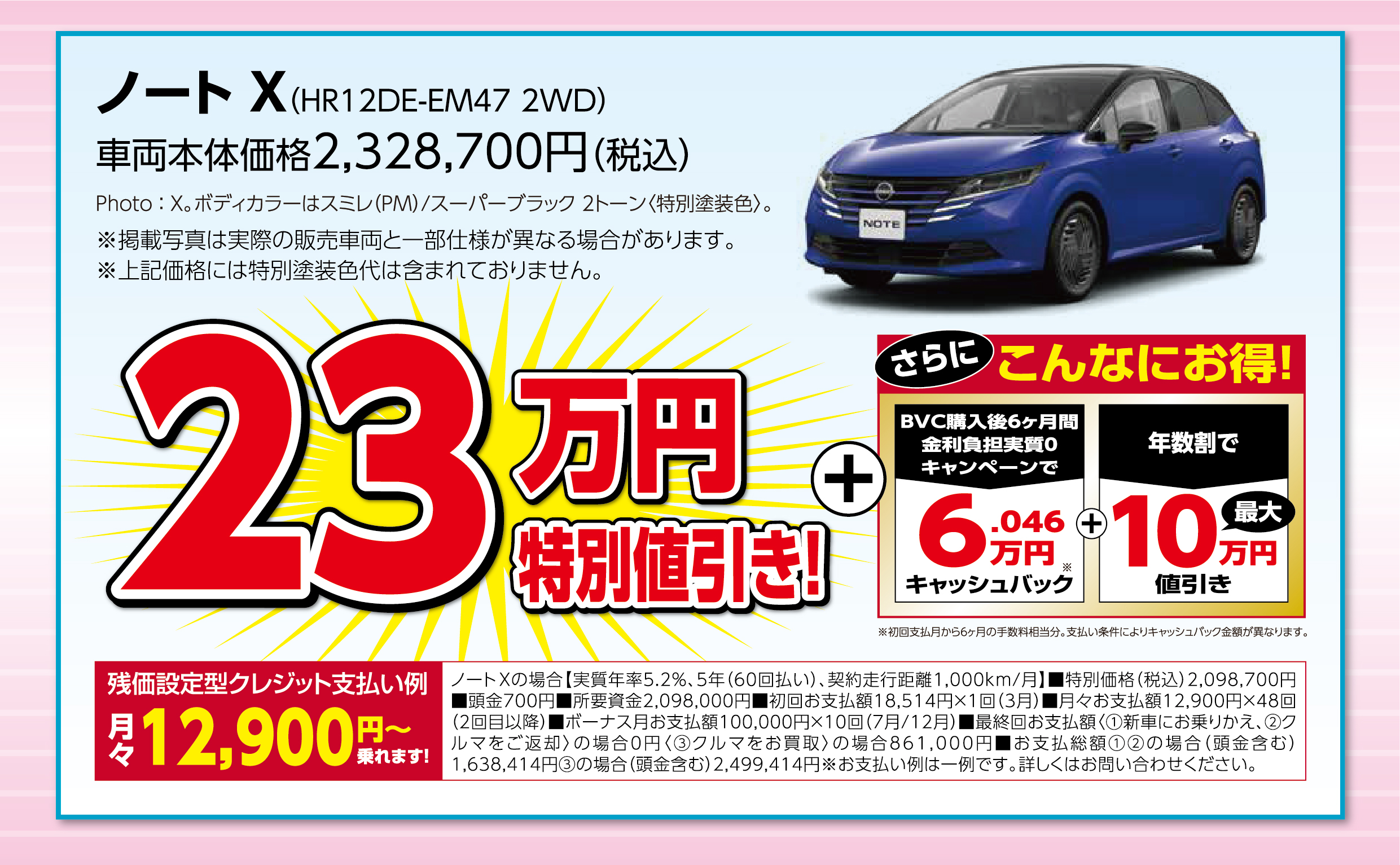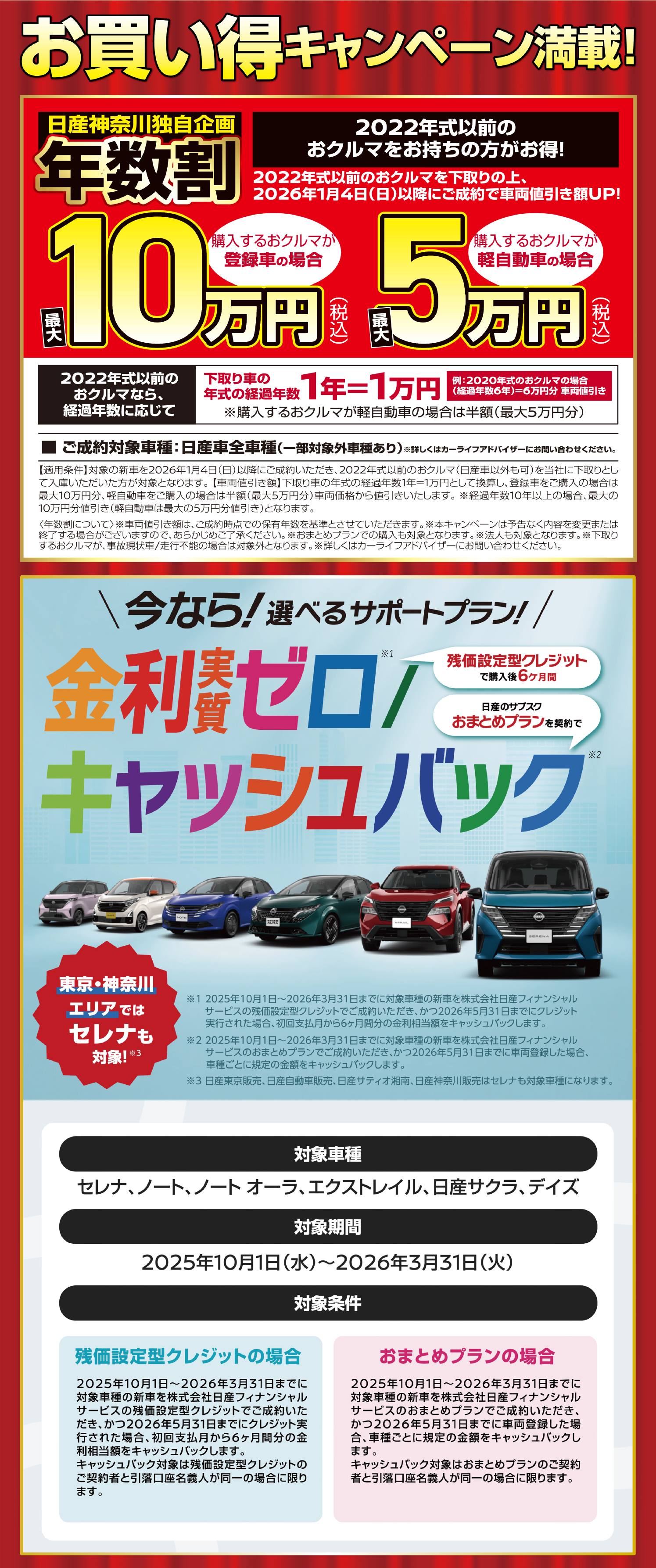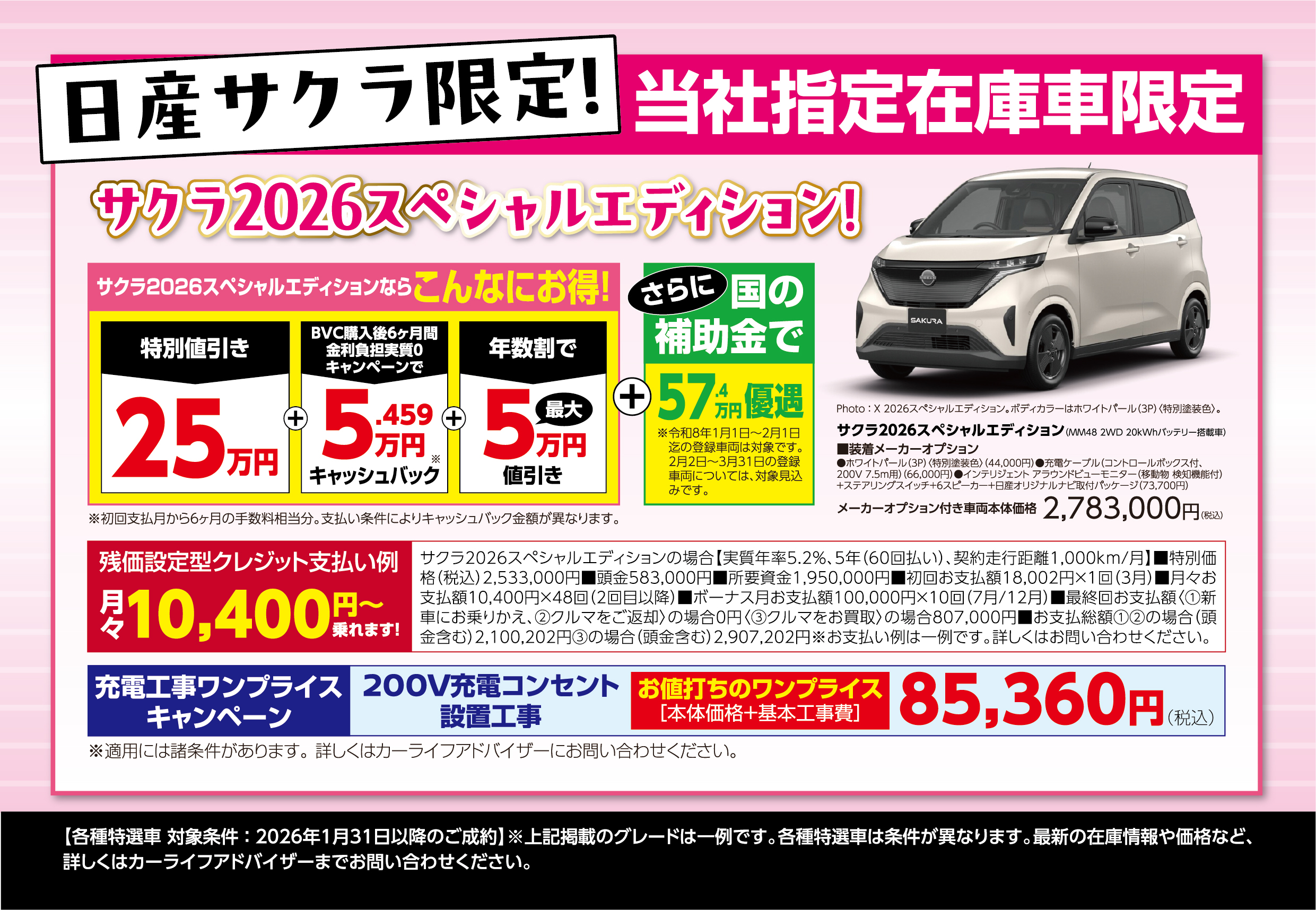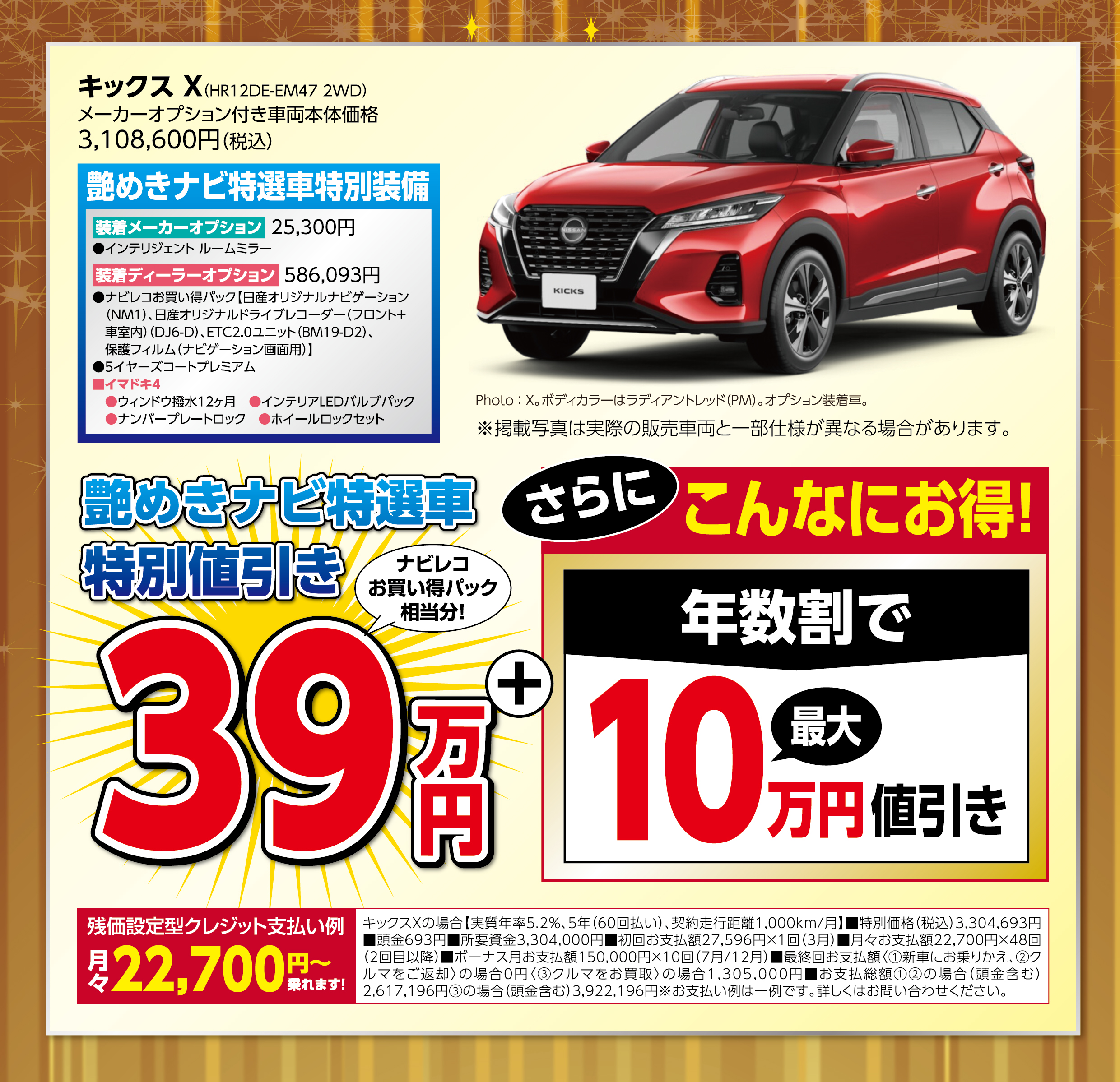 〈残価設定型クレジットについて〉●残価設定型クレジット対象の新車をご成約の方で、㈱日産フィナンシャルサービスをご利用の場合に限らせていただきます。●お支払い回数は3年(36回払い)、4年(48回払い)、5年(60回払い)より、また契約走行距離は1,000km/月、1,500km/月よりそれぞれお選びいただけます。●「日産リーフ」(新車)の場合、お支払い回数は4年(48回払い)、5年(60回払い)、6年(72回払い)よりお選びいただけます。また走行距離は1,000km/月、1,500km/月よりそれぞれお選びいただけますが、6年(72回払い)は1,000km/月のみとなります。●最終回の残価はお支払い回数や契約走行距離により異なります。●本クレジット最終回に新車にお乗りかえ、クルマを返却、クルマをお客さまが買取(残価を現金一括または再クレジットでお支払い)のいずれかをお選びいただけます。なお、車両返却の際、走行距離または内外装減点が「残価保証の条件」に定める基準を超える場合は、査定価格との差額をご負担いただきます。●本クレジットは予告なく終了する場合がございます。あらかじめご了承ください。●お申し込みいただきましても審査の結果お受けできない場合もございます。<価格について>※価格には保険料、税金(消費税を除く)、登録(届出)等に伴う諸費用、リサイル料金、オプション代、特別塗装色代は含まれておりません。別途申し受けます。※表示している価格には消費税が含まれております。※ボディカラー等は実際の色とは異なって見える場合があります。掲載内容は2026年1月9日現在のもので車両等の各情報、内容は予告なく変更または終了する場合があります。詳しくはカーライフアドバイザーにお問い合わせください。