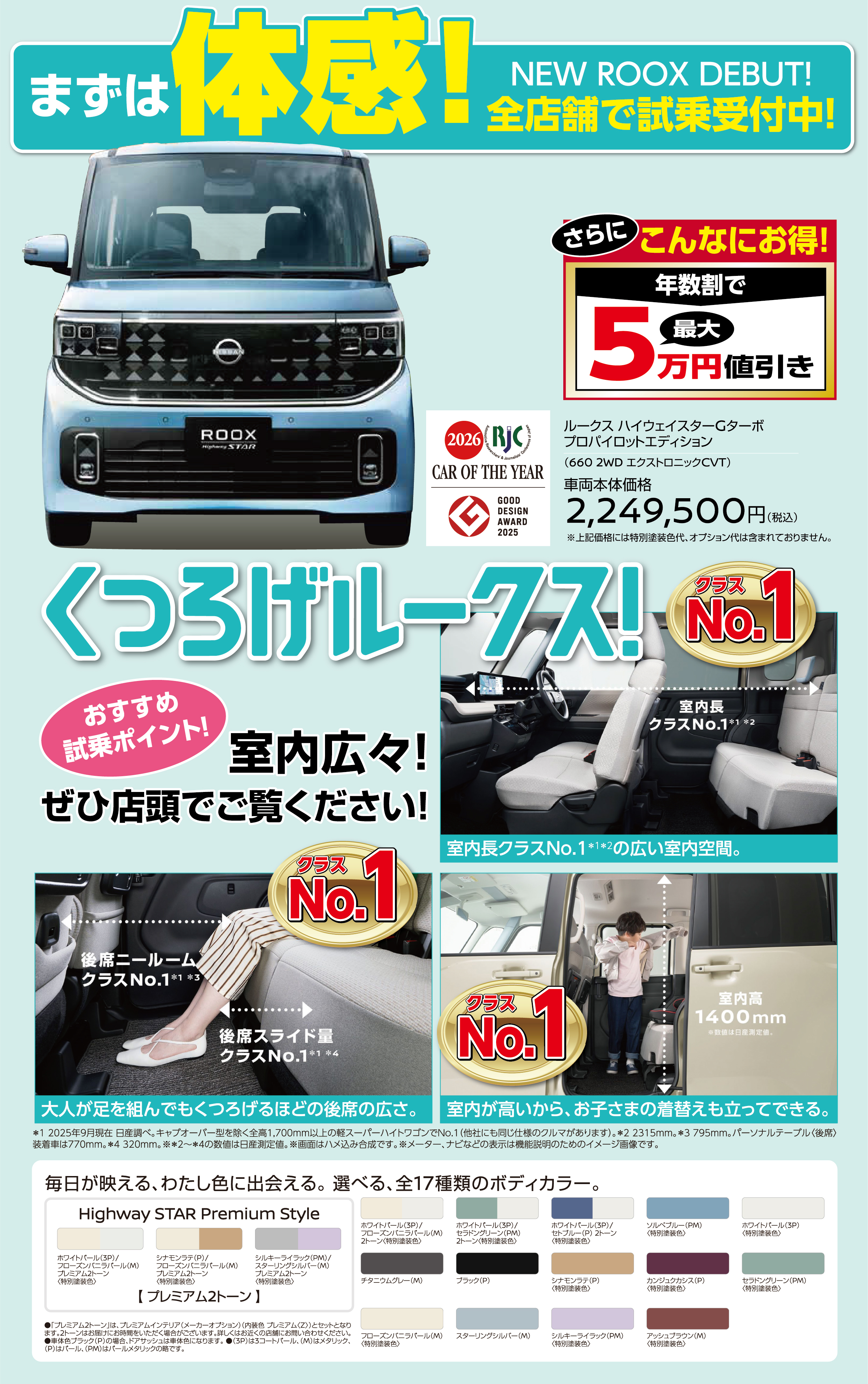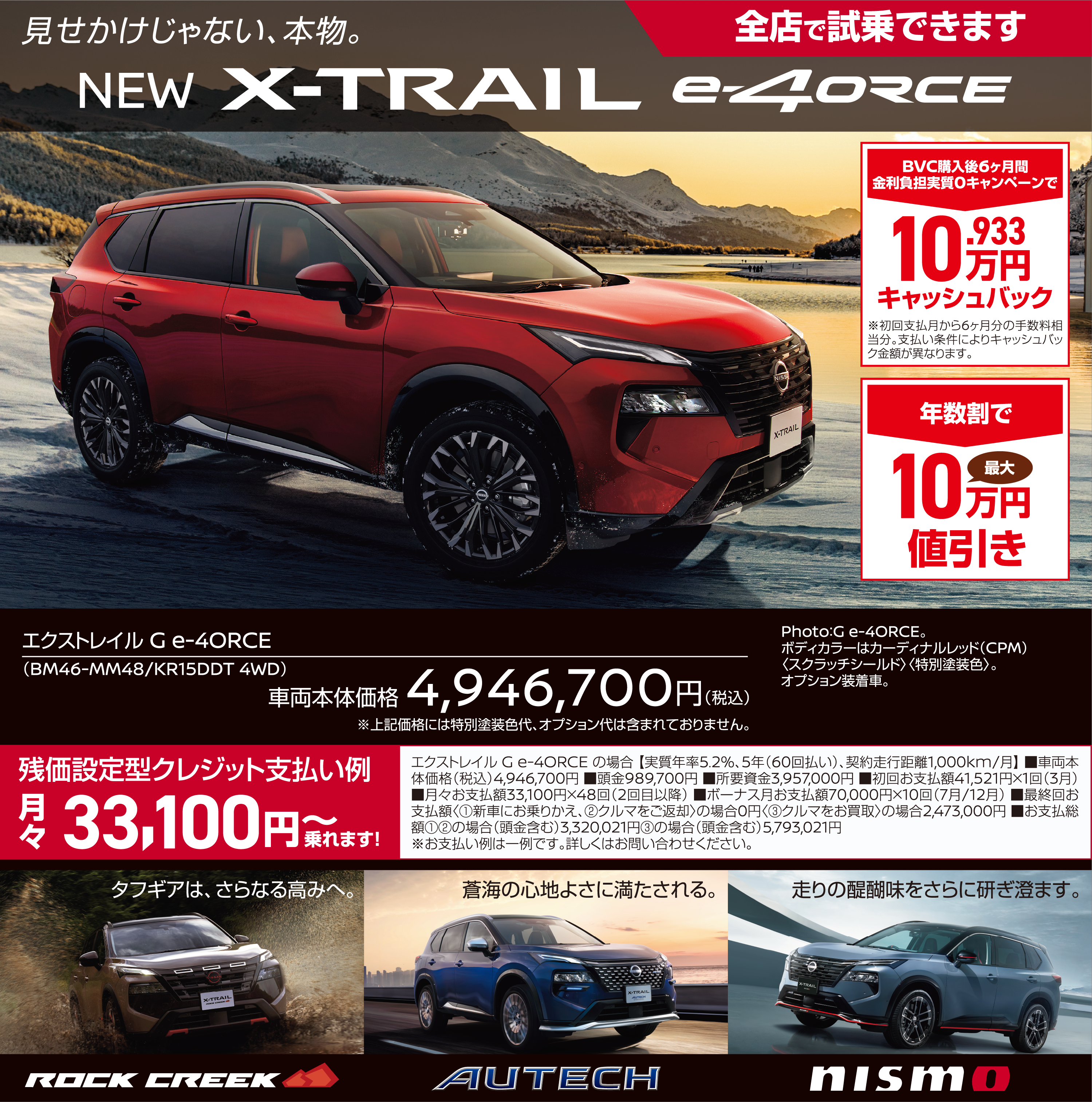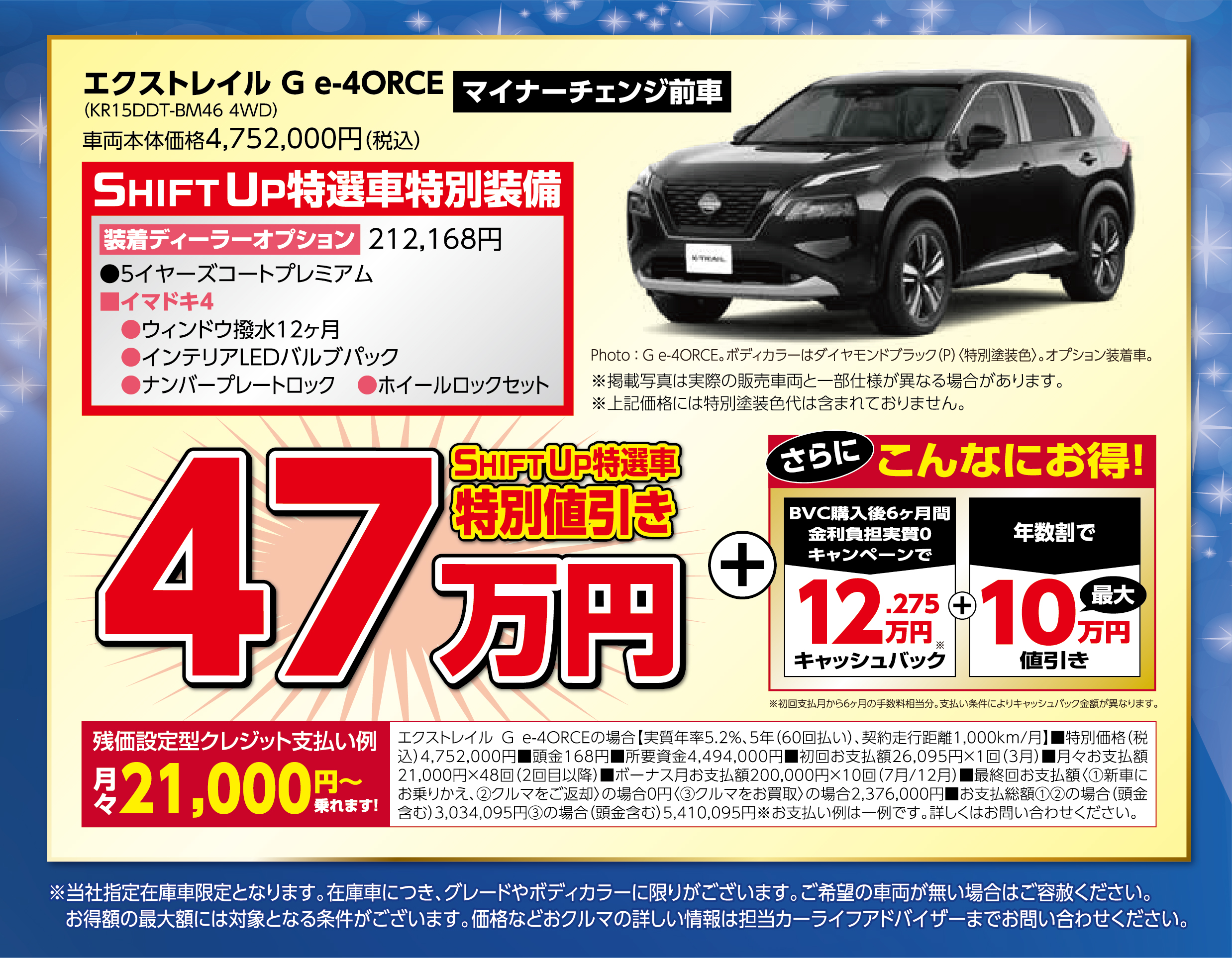 〈残価設定型クレジットについて〉●残価設定型クレジット対象の新車をご成約の方で、㈱日産フィナンシャルサービスをご利用の場合に限らせていただきます。●お支払い回数は3年(36回払い)、4年(48回払い)、5年(60回払い)より、また契約走行距離は1,000km/月、1,500km/月よりそれぞれお選びいただけます。●「日産リーフ」(新車)の場合、お支払い回数は4年(48回払い)、5年(60回払い)、6年(72回払い)よりお選びいただけます。また走行距離は1,000km/月、1,500km/月よりそれぞれお選びいただけますが、6年(72回払い)は1,000km/月のみとなります。●最終回の残価はお支払い回数や契約走行距離により異なります。●本クレジット最終回に新車にお乗りかえ、クルマを返却、クルマをお客さまが買取(残価を現金一括または再クレジットでお支払い)のいずれかをお選びいただけます。なお、車両返却の際、走行距離または内外装減点が「残価保証の条件」に定める基準を超える場合は、査定価格との差額をご負担いただきます。●本クレジットは予告なく終了する場合がございます。あらかじめご了承ください。●お申し込みいただきましても審査の結果お受けできない場合もございます。<価格について>※価格には保険料、税金(消費税を除く)、登録(届出)等に伴う諸費用、リサイル料金、オプション代、特別塗装色代は含まれておりません。別途申し受けます。※表示している価格には消費税が含まれております。※ボディカラー等は実際の色とは異なって見える場合があります。掲載内容は2026年1月9日現在のもので車両等の各情報、内容は予告なく変更または終了する場合があります。詳しくはカーライフアドバイザーにお問い合わせください。