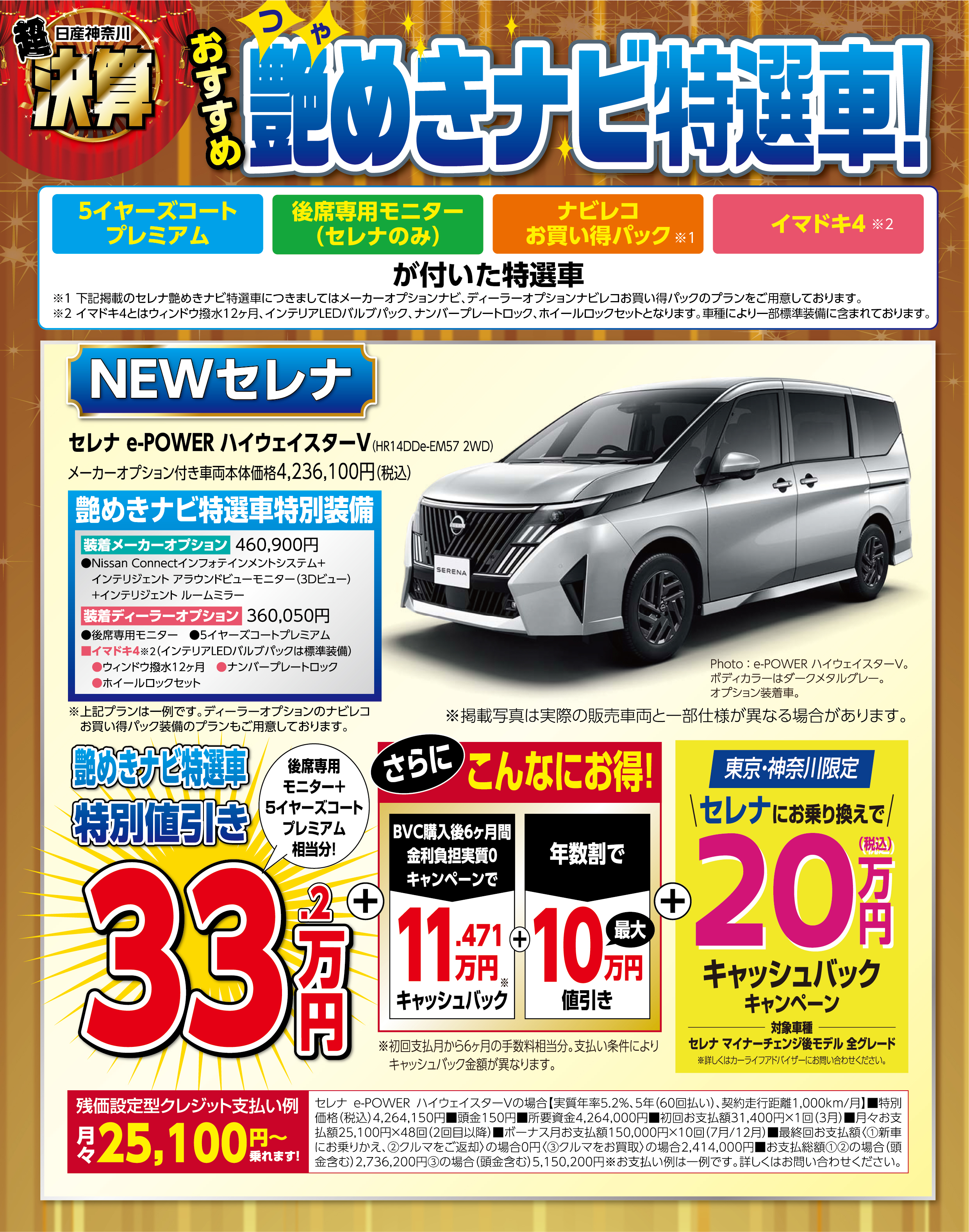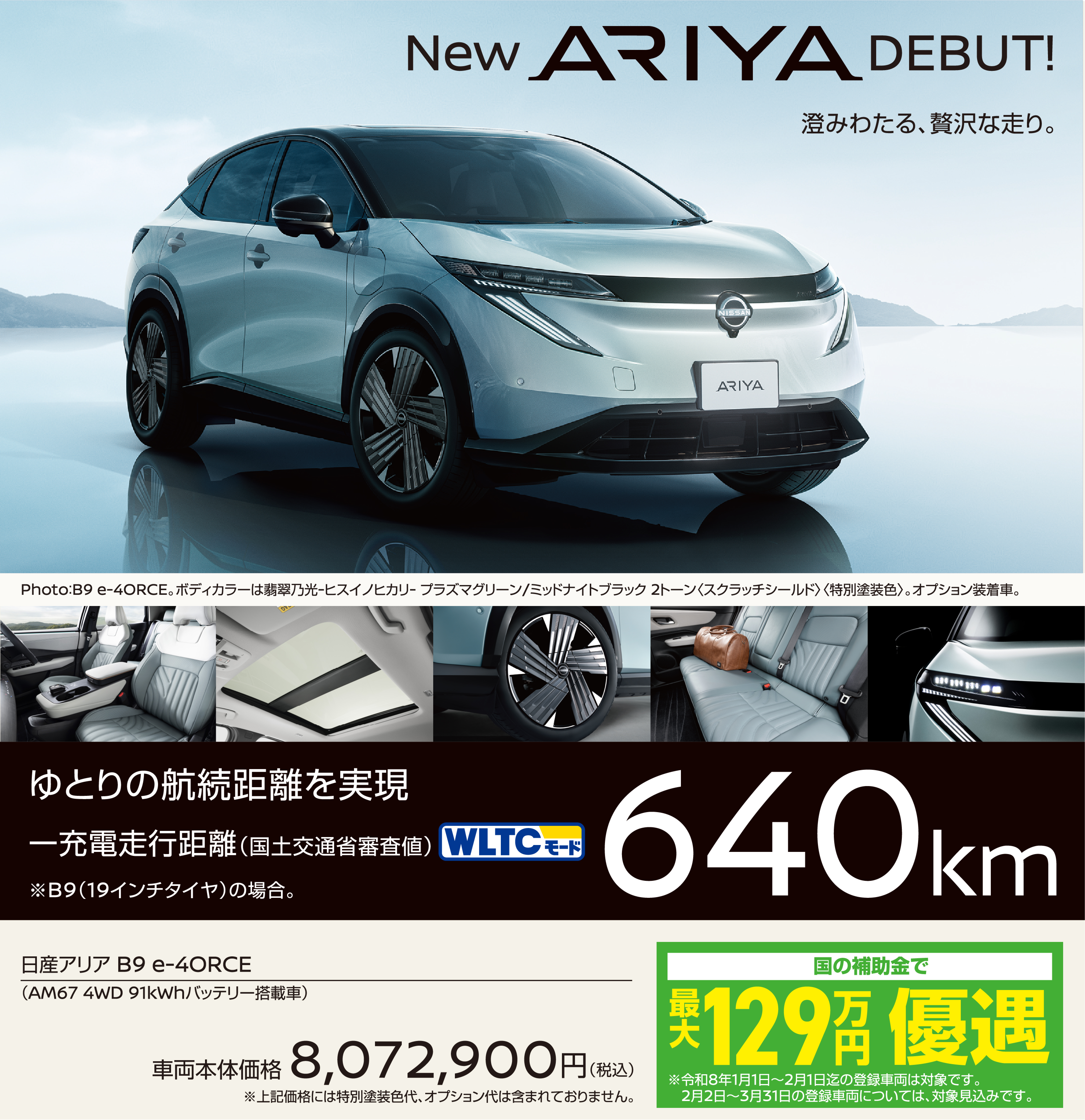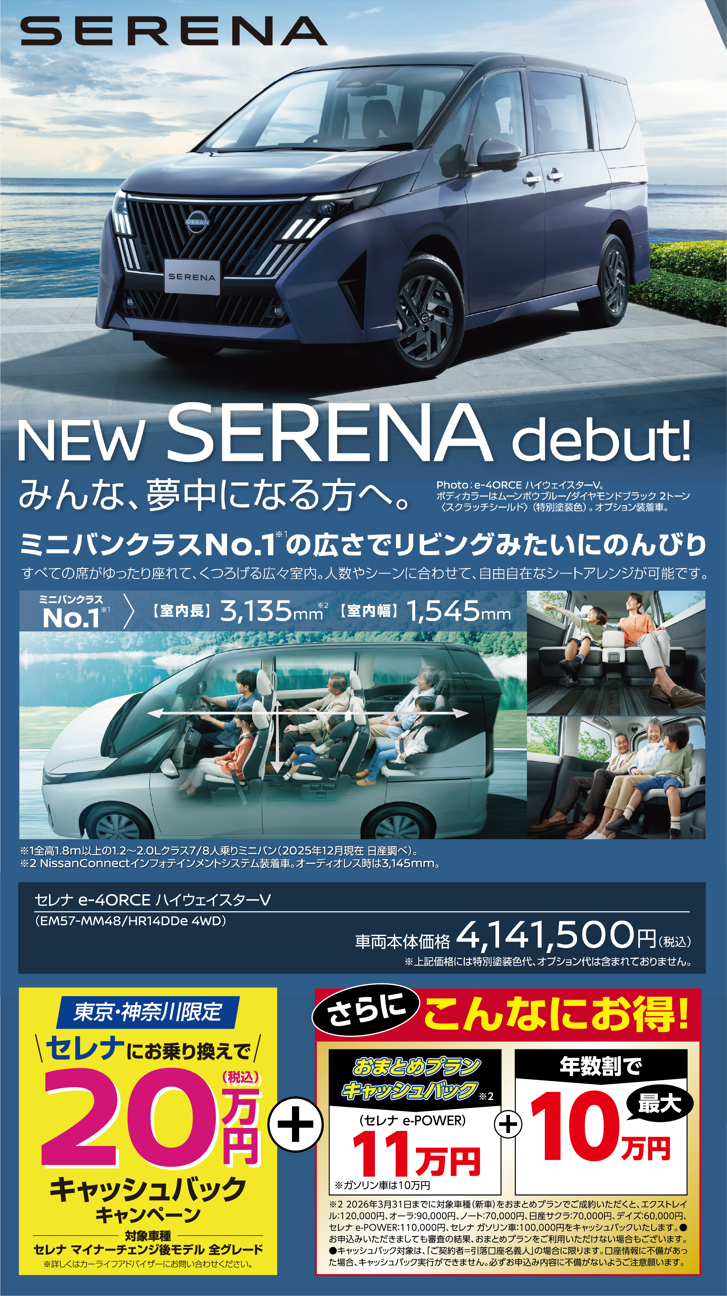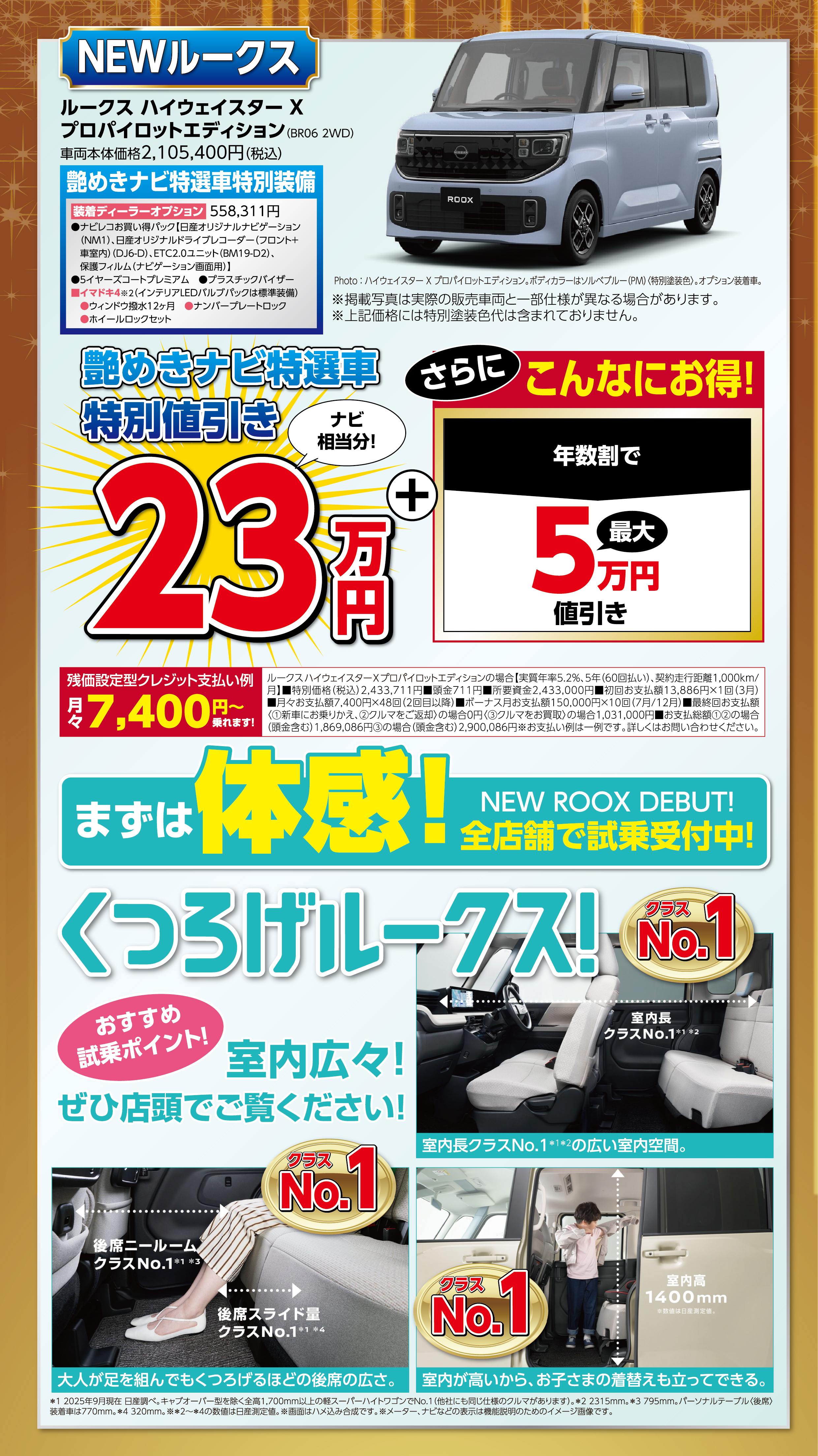 〈残価設定型クレジットについて〉●残価設定型クレジット対象の新車をご成約の方で、㈱日産フィナンシャルサービスをご利用の場合に限らせていただきます。●お支払い回数は3年(36回払い)、4年(48回払い)、5年(60回払い)より、また契約走行距離は1,000km/月、1,500km/月よりそれぞれお選びいただけます。●「日産リーフ」(新車)の場合、お支払い回数は4年(48回払い)、5年(60回払い)、6年(72回払い)よりお選びいただけます。また走行距離は1,000km/月、1,500km/月よりそれぞれお選びいただけますが、6年(72回払い)は1,000km/月のみとなります。●最終回の残価はお支払い回数や契約走行距離により異なります。●本クレジット最終回に新車にお乗りかえ、クルマを返却、クルマをお客さまが買取(残価を現金一括または再クレジットでお支払い)のいずれかをお選びいただけます。なお、車両返却の際、走行距離または内外装減点が「残価保証の条件」に定める基準を超える場合は、査定価格との差額をご負担いただきます。●本クレジットは予告なく終了する場合がございます。あらかじめご了承ください。●お申し込みいただきましても審査の結果お受けできない場合もございます。<価格について>※価格には保険料、税金(消費税を除く)、登録(届出)等に伴う諸費用、リサイル料金、オプション代、特別塗装色代は含まれておりません。別途申し受けます。※表示している価格には消費税が含まれております。※ボディカラー等は実際の色とは異なって見える場合があります。掲載内容は2026年1月9日現在のもので車両等の各情報、内容は予告なく変更または終了する場合があります。詳しくはカーライフアドバイザーにお問い合わせください。