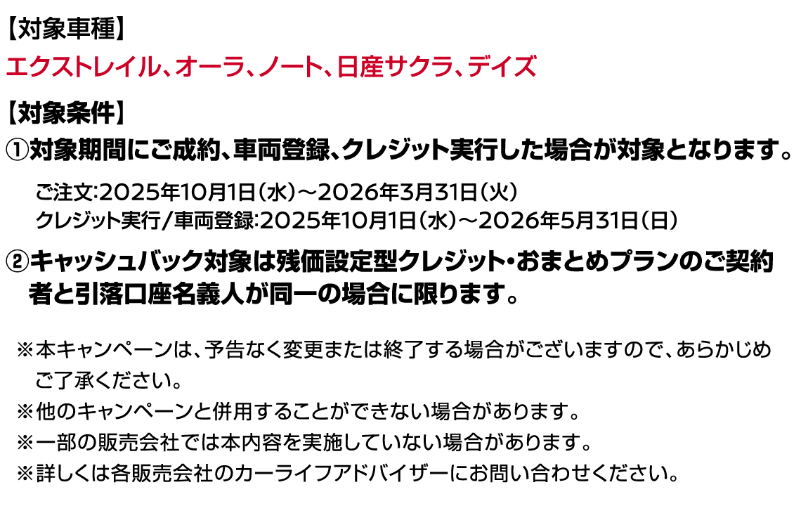 (2)キャンペーン応募後、2025年10月27日(月)~2026年3月31日(火)に対象車種をご注文かつ2026年4月30日(木)までに車両登録いただいた方。