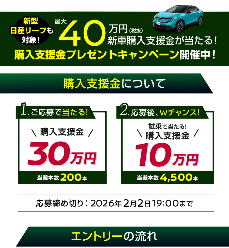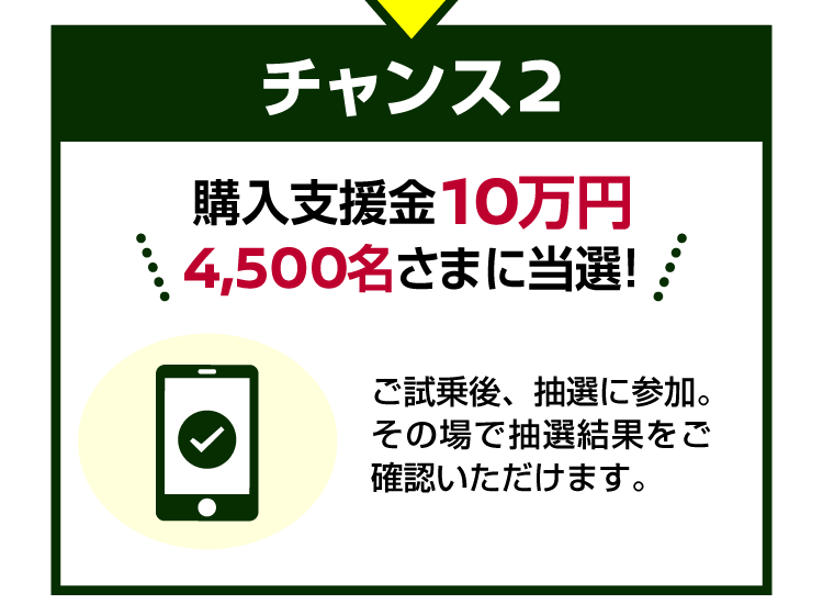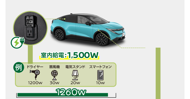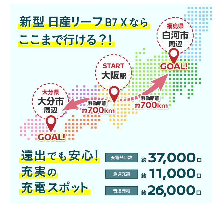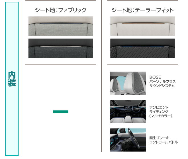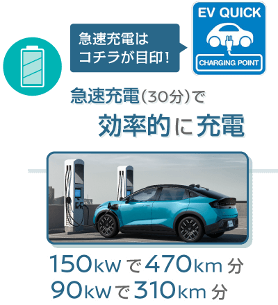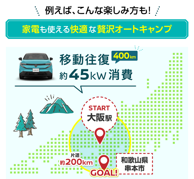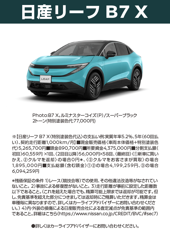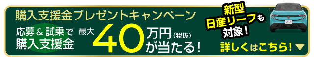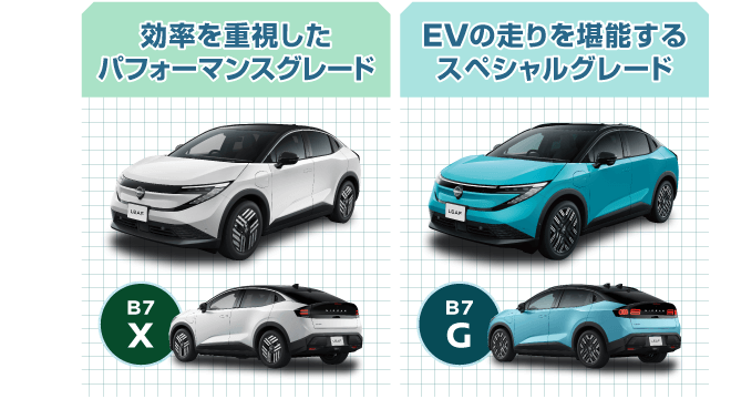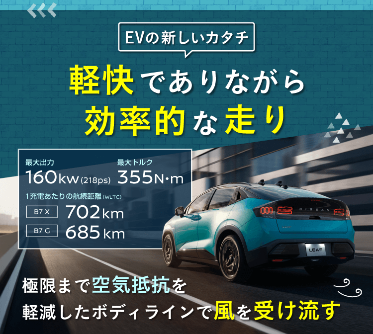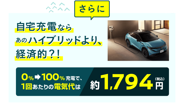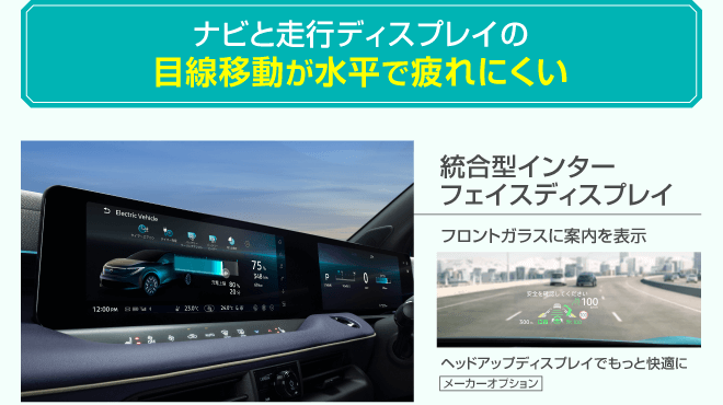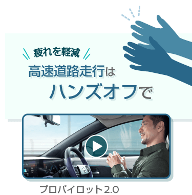 ●交流電力量消費率および一充電走行距離は定められた試験条件での値です。お客さまの使用環境(気象、渋滞等)や運転方法(急発進、エアコン使用等)、整備状況(タイヤの空気圧等)に応じて値は異なります。電気自動車は、走り方や使い方、使用環境等によって航続可能距離が大きく異なります。●一充電走行距離の表示は、「WLTCモード(国土交通省審査値)」です。●WLTCモードは、「市街地」「郊外」「高速道路」の各走行モードを平均的な使用時間配分で構成した国際的な走行モードです。