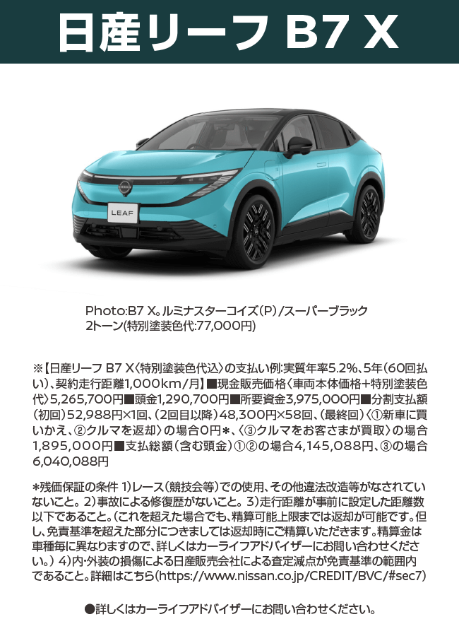 ●交流電力量消費率および一充電走行距離は定められた試験条件での値です。お客さまの使用環境(気象、渋滞等)や運転方法(急発進、エアコン使用等)、整備状況(タイヤの空気圧等)に応じて値は異なります。電気自動車は、走り方や使い方、使用環境等によって航続可能距離が大きく異なります。●一充電走行距離の表示は、「WLTCモード(国土交通省審査値)」です。●WLTCモードは、「市街地」「郊外」「高速道路」の各走行モードを平均的な使用時間配分で構成した国際的な走行モードです。