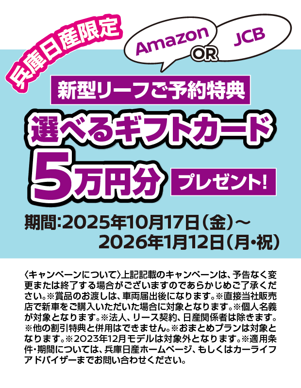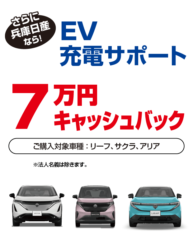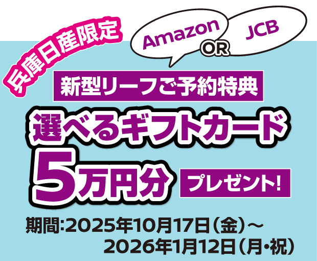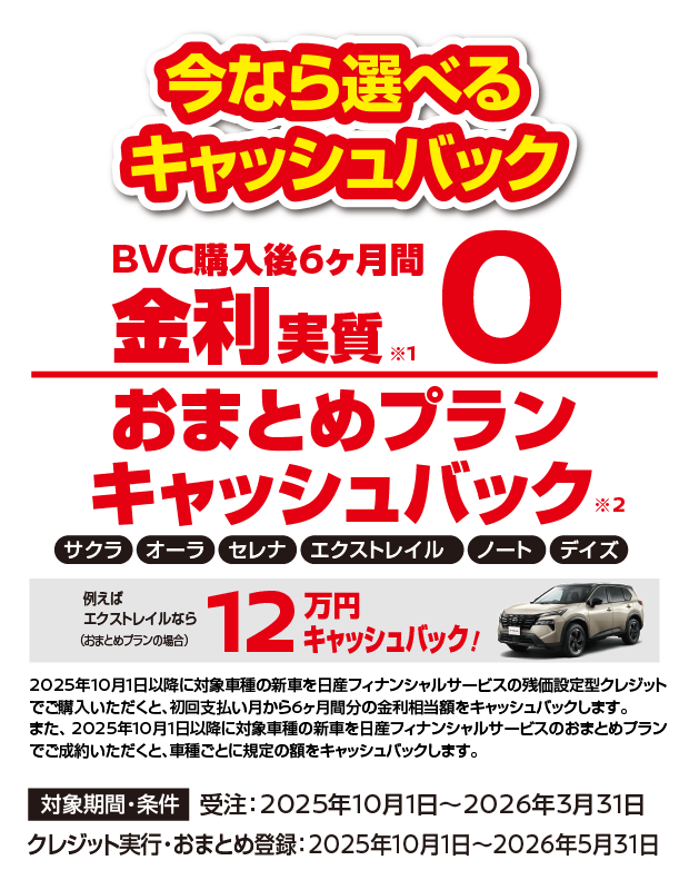 ※1:2025年10月1日以降に対象車種の新車を株式会社日産フィナンシャルサービスの残価設定型クレジットでご成約いただくと、初回支払月から6ヶ月間分の金利相当額をキャッシュバックします。●お申込みいただきましても審査の結果、残価設定型クレジットをご利用いただけない場合もございます。●キャッシュバック対象は、「ご契約者=引落口座名義人」の場合に限ります。口座情報に不備があった場合、キャッシュバック実行ができません。必ずお申込み内容に不備がないようご注意願います。