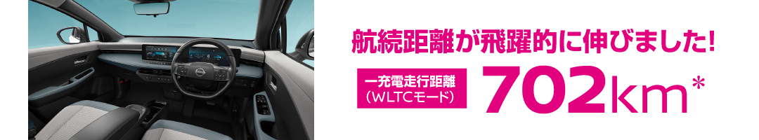 *〈WLTCモード 一充電走行距離について〉一充電走行距離は定められた試験条件での値です。お客さまの使用環境(気象、渋滞等)や運転方法(急発進、エアコン使用等)、整備状況(タイヤの空気圧等)に応じて値は異なります。電気自動車は、走り方や使い方、使用環境等によって航続可能距離が大きく異なります。●一充電走行距離の表示は、「WLTCモード(国土交通省審査値)」です。●WLTCモードは、「市街地」「郊外」「高速道路」の各走行モードを平均的な使用時間配分で構成した国際的な走行モードです。詳しくはカーライフアドバイザーにお問い合わせください。