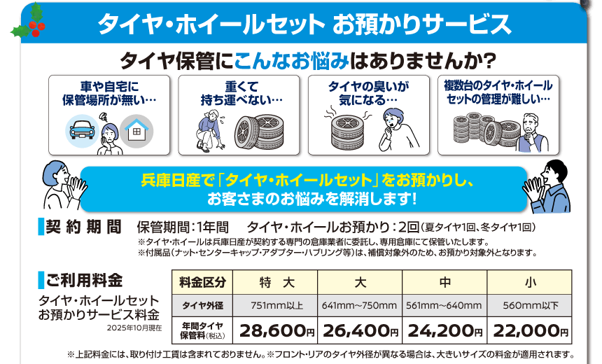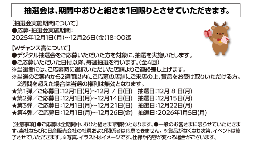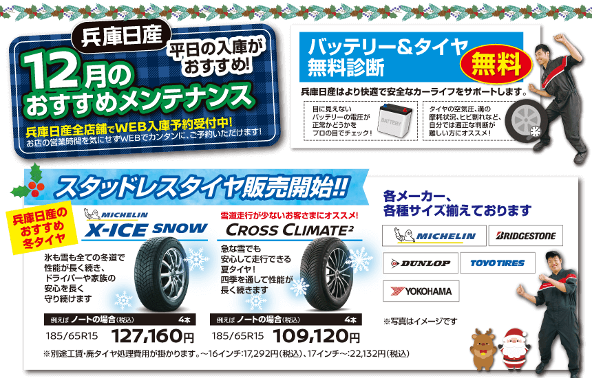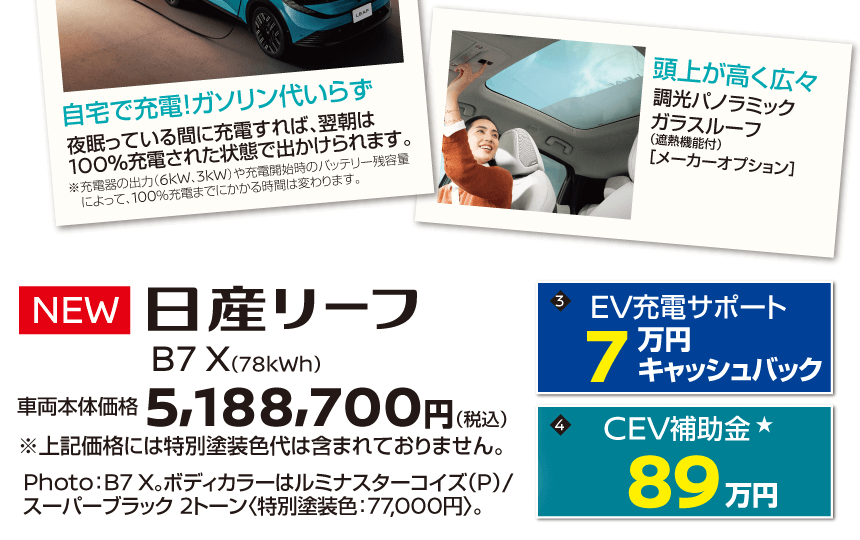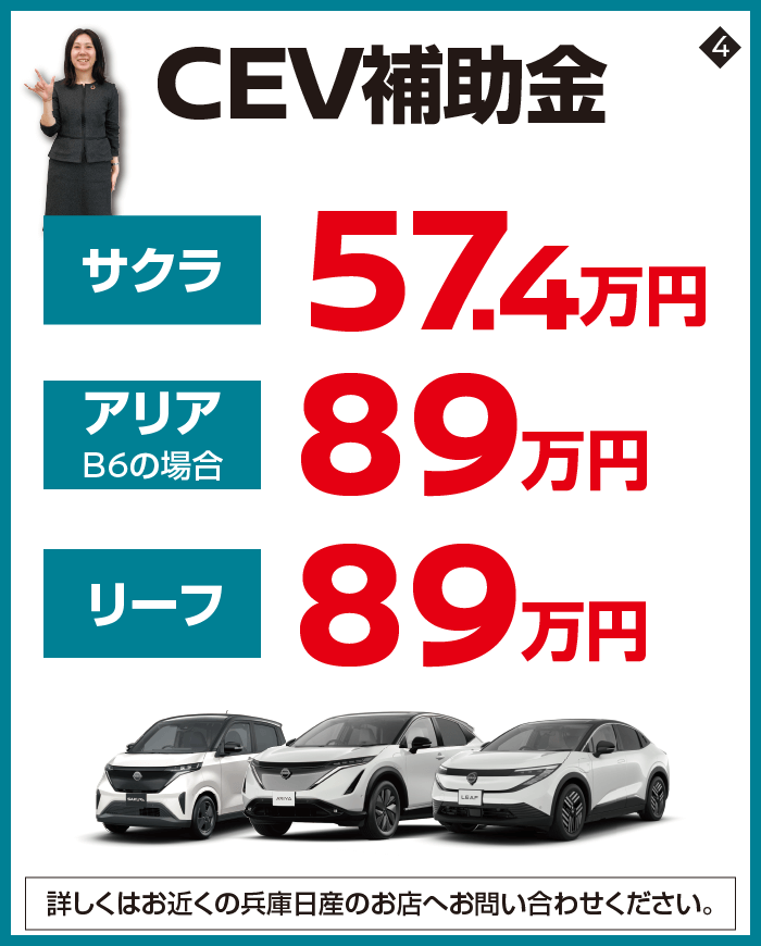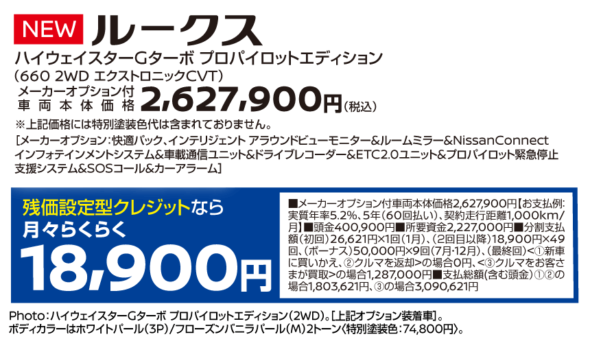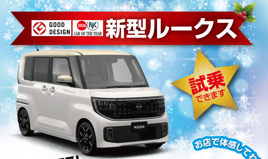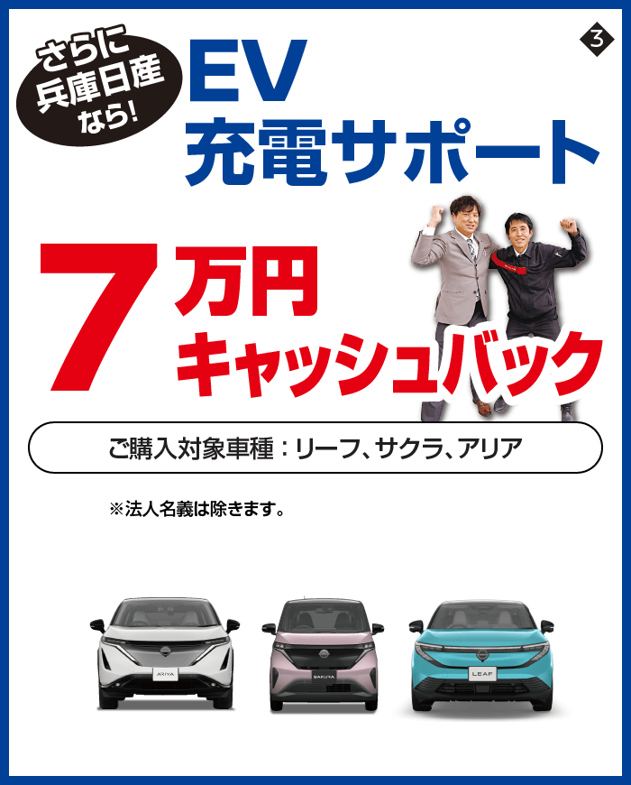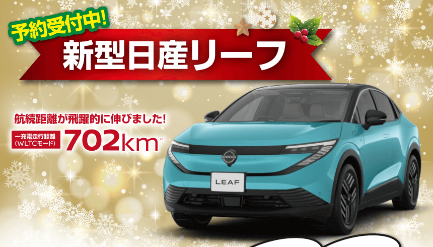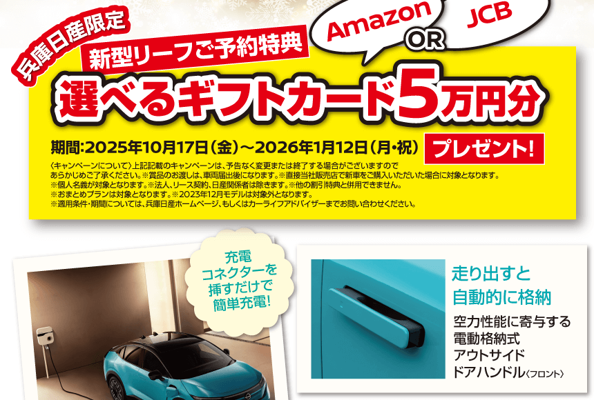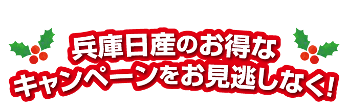 〈キャンペーンについて〉上記記載のキャンペーンは、予告なく変更または終了する場合がございますのであらかじめご了承ください。※直接当社販売店で新車をご購入いただいた場合に対象となります。※法人リース契約、日産関係者は除きます。特典の権利を他人に譲渡したり、現金または他の商品と交換することはできません。※適用条件・期間については、兵庫日産ホームページ、もしくはカーライフアドバイザーまでお問い合わせください。