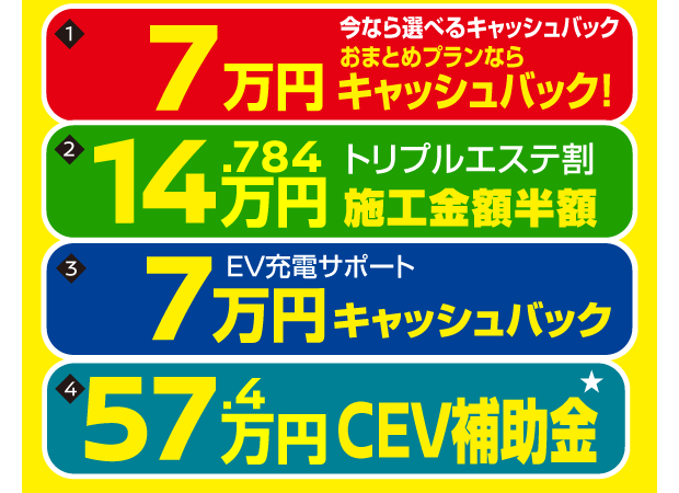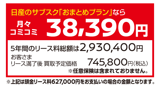 ※2:2025年10月1日以降に対象車種(新車)をおまとめプランでご成約いただくと、エクストレイル:120,000円 セレナ(e-POWER車):110,000円 セレナ(ガソリン車):100,000円 オーラ:90,000円 ノート:70,000円 日産サクラ:70,000円 デイズ:60,000円をキャッシュバックいたします。●お申込みいただきましても審査の結果、おまとめプランをご利用いただけない場合もございます。 ●キャッシュバック対象は、「ご契約者=引落口座名義人」の場合に限ります。口座情報に不備があった場合、キャッシュバック実行ができません。必ずお申込み内容に不備がないようご注意願います。●詳しくはカーライフアドバイザーにお問い合わせください。