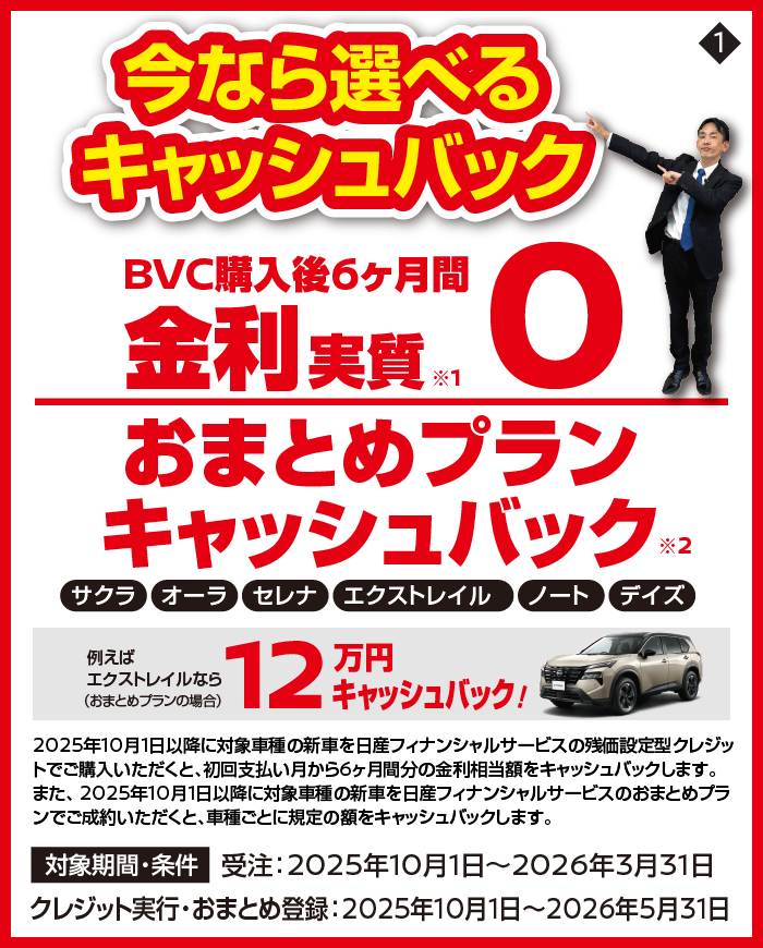 ※1:2025年10月1日以降に対象車種の新車を株式会社日産フィナンシャルサービスの残価設定型クレジットでご成約いただくと、初回支払月から6ヶ月間分の金利相当額をキャッシュバックします。●お申込みいただきましても審査の結果、残価設定型クレジットをご利用いただけない場合もございます。●キャッシュバック対象は、「ご契約者=引落口座名義人」の場合に限ります。口座情報に不備があった場合、キャッシュバック実行ができません。必ずお申込み内容に不備がないようご注意願います。