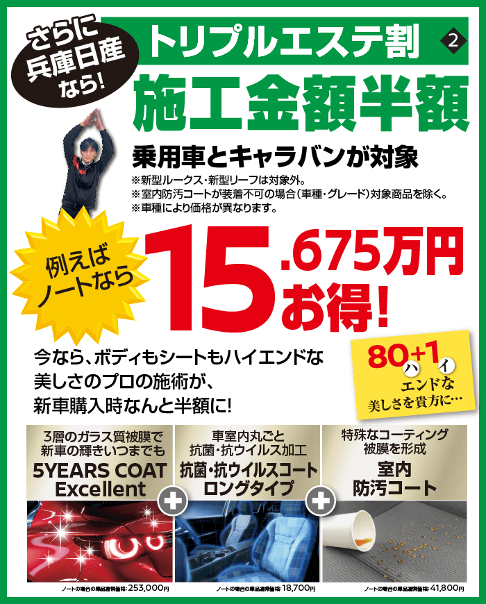 ※写真・イラストはイメージです。※おクルマをお持ち込み、お持ち帰りのお客さまに限ります。※状況によりお待ちいただく場合がございますのでご了承ください。※効果持続時間は目安です。おクルマの使用環境により、若干異なる場合があります。※キャンペーンは予告なく変更または終了する場合がございますのであらかじめご了承ください。※詳しくはテクニカルアドバイザーにお問い合わせください。