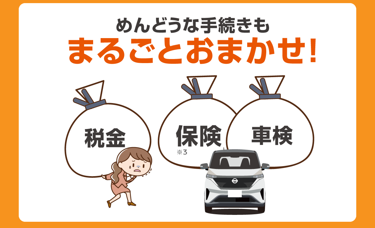 ※おまとめプランは株式会社日産フィナンシャルサービスのリース商品です。※お申し込みは個人のお客さまのみとなります。法人・個人事業主のお客さまはご利用いただけません。※ご契約につきましては審査が必要です。審査の結果お受けできない場合がございますので、あらかじめご了承ください。※税率10%に基づく税込価格を表示しています。※掲載料金は契約月間走行距離 1,000km/月、頭金なしでの参考価格で、特別塗装色やオプション代は含まれておりません。詳細はカーライフアドバイザーにお問い合わせください。※車両本体、環境性能割、登録諸費用、契約期間中の自動車税、重量税、自賠責保険料、契約期間中のメンテナンス料金を含みます。※任意保険は含まれていません。※この見積は電気自動車補助金の交付を前提としており、交付されない場合はリース料が変わります。補助金がリース料に還元される場合は、5年契約3年乗りかえプランはご利用できません。また中途解約時は補助金の返金が必要な場合があります。