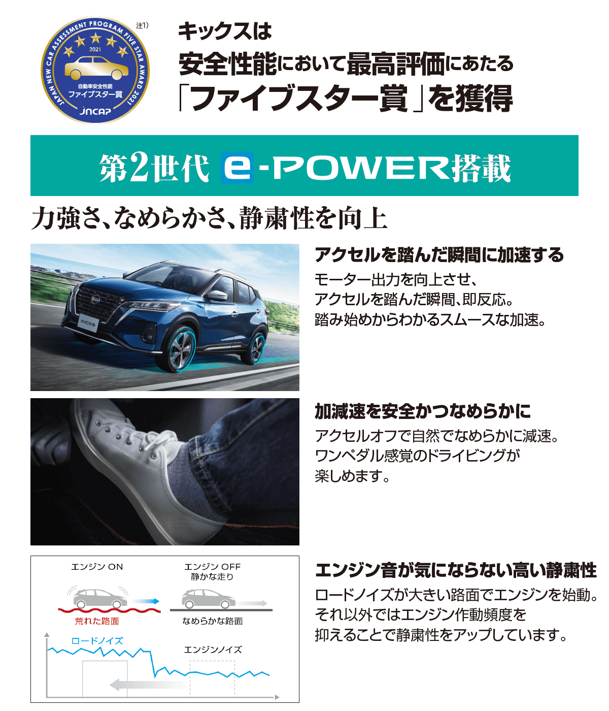 注1) 国土交通省及び(独)自動車事故対策機構による安全性能評価。キックス試験車両: X 2WD。インテリジェント アラウンドビューモニター(移動物 検知機能付)+インテリジェント ルームミラー、日産オリジナルナビゲーション装着車。2022年3月現在。