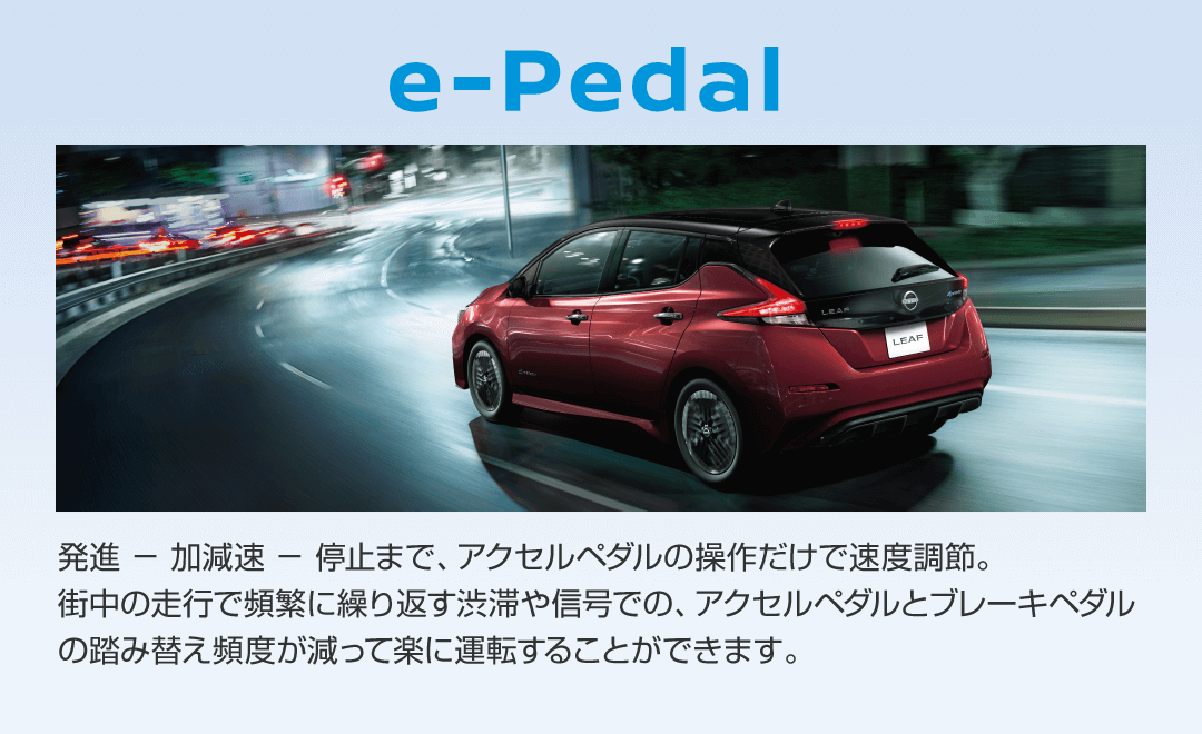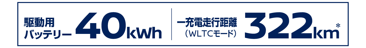 *〈WLTCモード 一充電走行距離について〉一充電走行距離は定められた試験条件での値です。お客さまの使用環境(気象、渋滞等)や運転方法(急発進、エアコン使用等)、整備状況(タイヤの空気圧等)に応じて値は異なります。電気自動車は、走り方や使い方、使用環境等によって航続可能距離が大きく異なります。●一充電走行距離の表示は、「WLTCモード(国土交通省審査値)」です。●WLTCモードは、「市街地」「郊外」「高速道路」の各走行モードを平均的な使用時間配分で構成した国際的な走行モードです。詳しくはカーライフアドバイザーにお問い合わせください。