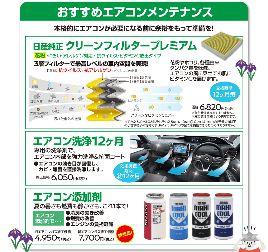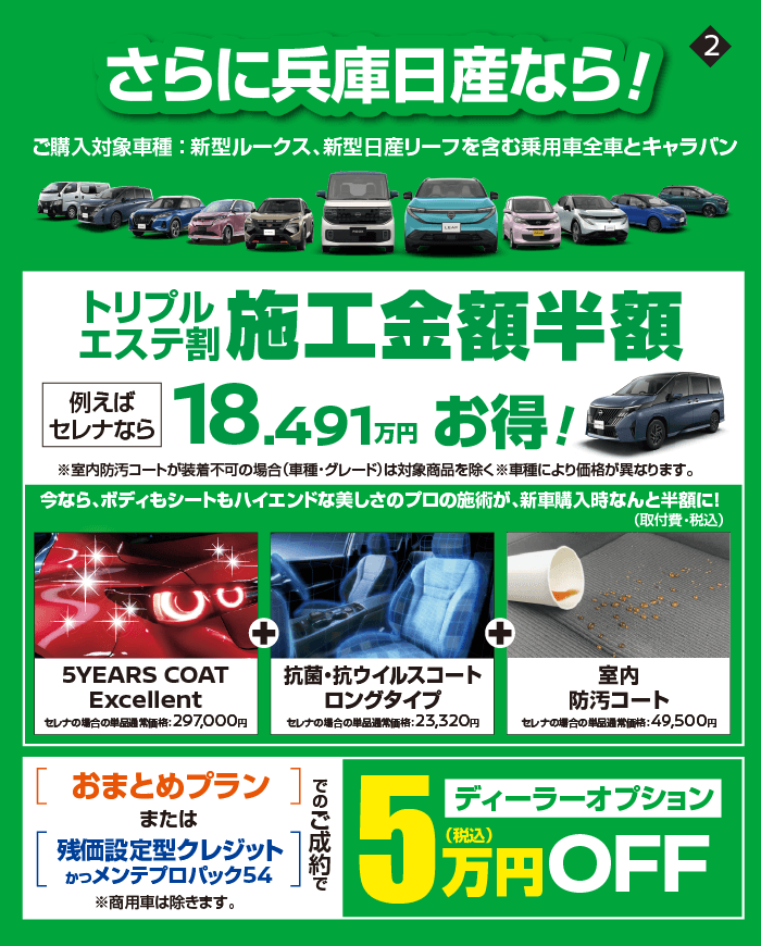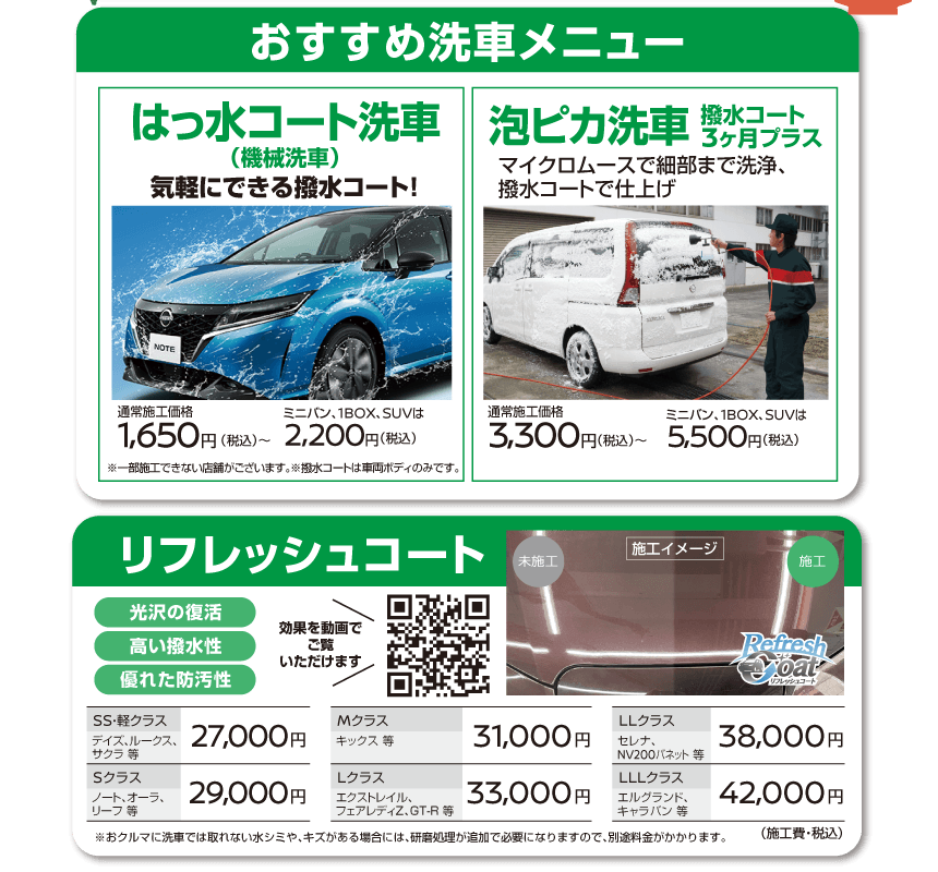 ※写真・イラストはイメージです。※おクルマをお持ち込み、お持ち帰りのお客さまに限ります。※状況によりお待ちいただく場合がございますのでご了承ください。※効果持続時間は目安です。おクルマの使用環境により、若干異なる場合があります。※キャンペーンは予告なく変更または終了する場合がございますのであらかじめご了承ください。※詳しくはテクニカルアドバイザーにお問い合わせください。