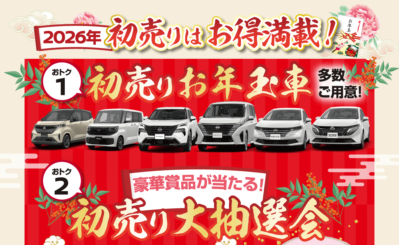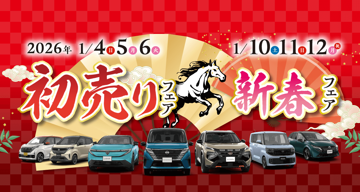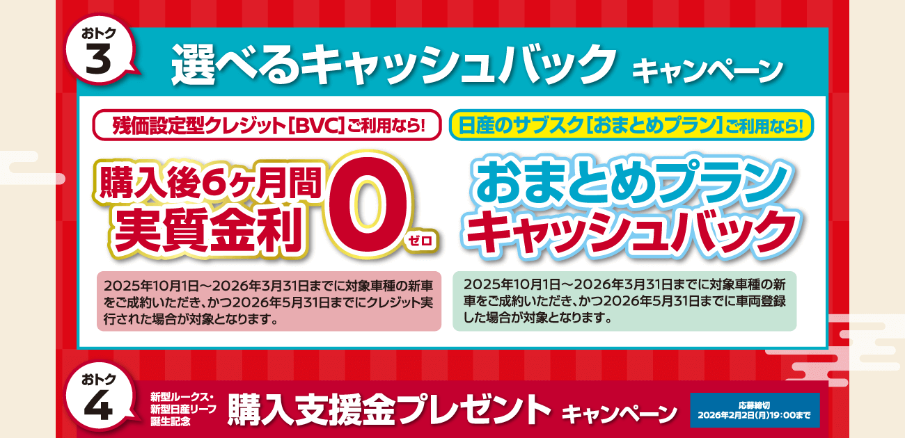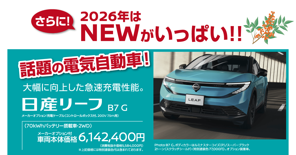 *1 補助金には申請期限があります。申請額が予算額に達した場合は受付終了となりますのでご注意ください。* 詳しくは、カーライフアドバイザーもしくは、経済産業省のWEBサイト【https://www.meti.go.jp/policy/mono_info_service/mono/automobile/cev/r6hosei_cev.html】をご確認ください。〈残価設定型クレジットについて〉●残価設定型クレジット対象車種の新車をご成約の方で、㈱日産フィナンシャルサービスをご利用の場合に限らせていただきます。●価格には付属品、保険料、税金(除く消費税)、登録等に伴う諸費用、リサイクル料金、オプション代を含みます。●お支払い回数は3年(36回払い)、4年(48回払い)、5年(60回払い)、6年(72回払い)より、また契約走行距離は1,000km/月、1,500km/月よりそれぞれお選びいただけます。●「日産リーフ」「日産サクラ」のお支払い回数は4年(48回払い)、5年(60回払い)、6年(72回払い)よりお選びいただけます。また契約走行距離は6年(72回払い)の場合、1,000km/月のみとなります(最終回の残価はお支払い回数や契約走行距離により異なります)。〈おまとめプランについて〉おまとめプランは株式会社⽇産フィナンシャルサービスのリース商品です。※税率10%に基づく税込価格を表⺬しています。※掲載料⾦は契約⽉間⾛⾏距離1,000km/⽉、頭⾦ありでの参考価格で、特別塗装⾊やオプション代を含みます。詳細は⽇産の販売店にお問い合わせください。※掲載料⾦は2025年12⽉現在のものです。※⾞両本体、環境性能割、登録諸費⽤、契約期間中の⾃動⾞税、重量税、⾃賠責保険料、契約期間中のメンテナンス料⾦を含みます。※任意保険は含まれていません。<重量税の減税について>【適用期間】2026年4月30日までの登録(届出)車。車種・グレード・車両重量、オプション装着等によって減税措置の適用内容が異なります。<自動車税・軽自動車税について>【適用期間】自動車税:2026年3月末までの登録車、軽自動車税:2026年3月末までの届出車(それぞれ登録(届出)翌年度から1年間適用)。車種・グレード・排気量等によって減税措置の適用内容が異なります。●詳しくは、日産自動車ホームページ(http://www2.nissan.co.jp/EVENT/TAX/index.html)、または、カーライフアドバイザーまでお問い合わせください。<エコカー減税について>【適用期間】自動車重量税:2026年3月末までの登録(届出)車。車種・グレード・車両重量、オプション装着等によって減税措置の適用内容が異なります。