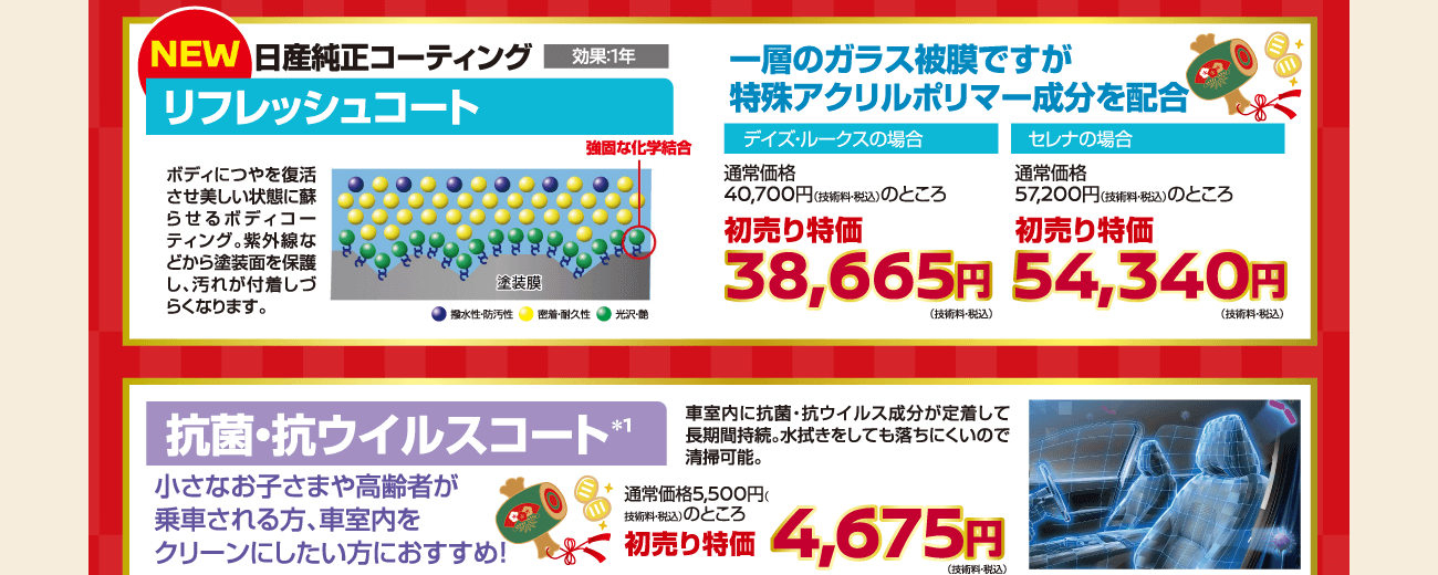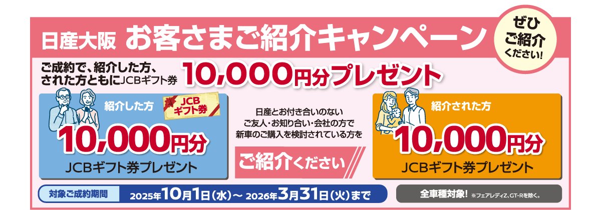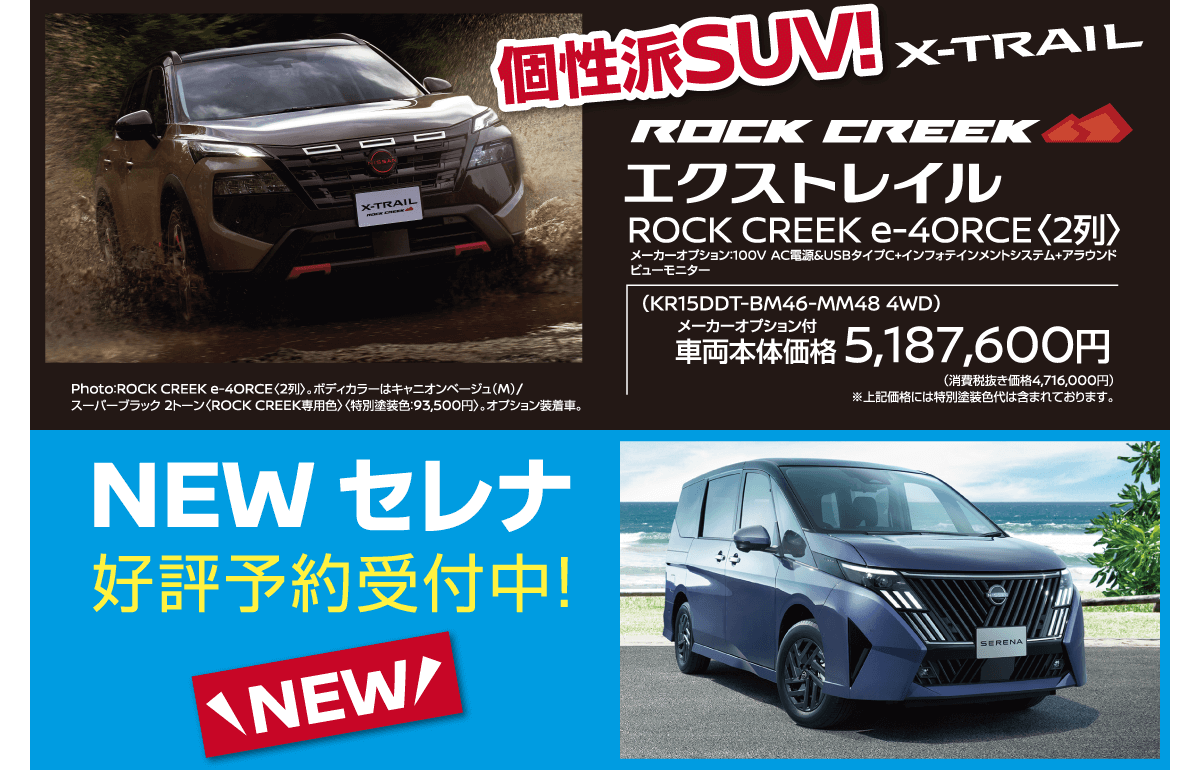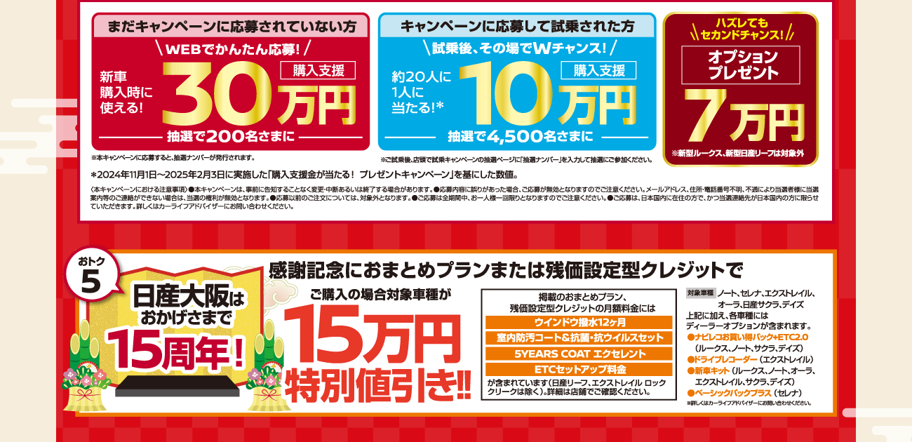*1 補助金には申請期限があります。申請額が予算額に達した場合は受付終了となりますのでご注意ください。* 詳しくは、カーライフアドバイザーもしくは、経済産業省のWEBサイト【https://www.meti.go.jp/policy/mono_info_service/mono/automobile/cev/r6hosei_cev.html】をご確認ください。〈残価設定型クレジットについて〉●残価設定型クレジット対象車種の新車をご成約の方で、㈱日産フィナンシャルサービスをご利用の場合に限らせていただきます。●価格には付属品、保険料、税金(除く消費税)、登録等に伴う諸費用、リサイクル料金、オプション代を含みます。●お支払い回数は3年(36回払い)、4年(48回払い)、5年(60回払い)、6年(72回払い)より、また契約走行距離は1,000km/月、1,500km/月よりそれぞれお選びいただけます。●「日産リーフ」「日産サクラ」のお支払い回数は4年(48回払い)、5年(60回払い)、6年(72回払い)よりお選びいただけます。また契約走行距離は6年(72回払い)の場合、1,000km/月のみとなります(最終回の残価はお支払い回数や契約走行距離により異なります)。〈おまとめプランについて〉おまとめプランは株式会社⽇産フィナンシャルサービスのリース商品です。※税率10%に基づく税込価格を表⺬しています。※掲載料⾦は契約⽉間⾛⾏距離1,000km/⽉、頭⾦ありでの参考価格で、特別塗装⾊やオプション代を含みます。詳細は⽇産の販売店にお問い合わせください。※掲載料⾦は2025年12⽉現在のものです。※⾞両本体、環境性能割、登録諸費⽤、契約期間中の⾃動⾞税、重量税、⾃賠責保険料、契約期間中のメンテナンス料⾦を含みます。※任意保険は含まれていません。<重量税の減税について>【適用期間】2026年4月30日までの登録(届出)車。車種・グレード・車両重量、オプション装着等によって減税措置の適用内容が異なります。<自動車税・軽自動車税について>【適用期間】自動車税:2026年3月末までの登録車、軽自動車税:2026年3月末までの届出車(それぞれ登録(届出)翌年度から1年間適用)。車種・グレード・排気量等によって減税措置の適用内容が異なります。●詳しくは、日産自動車ホームページ(http://www2.nissan.co.jp/EVENT/TAX/index.html)、または、カーライフアドバイザーまでお問い合わせください。<エコカー減税について>【適用期間】自動車重量税:2026年3月末までの登録(届出)車。車種・グレード・車両重量、オプション装着等によって減税措置の適用内容が異なります。