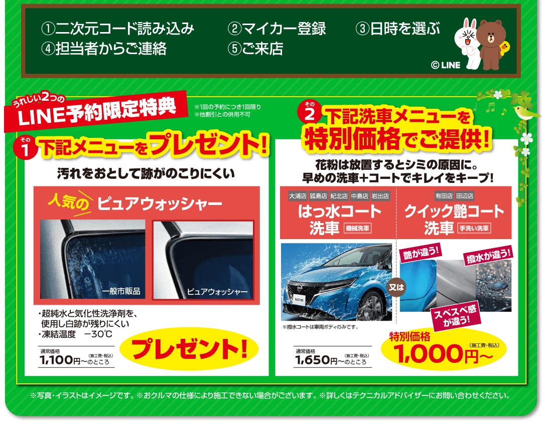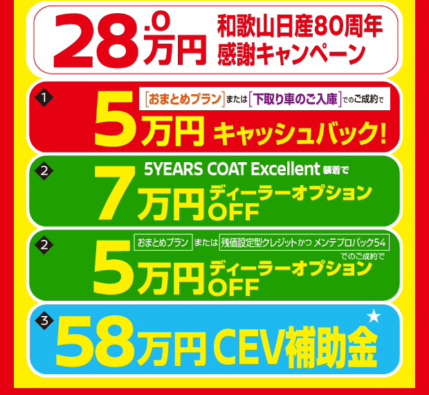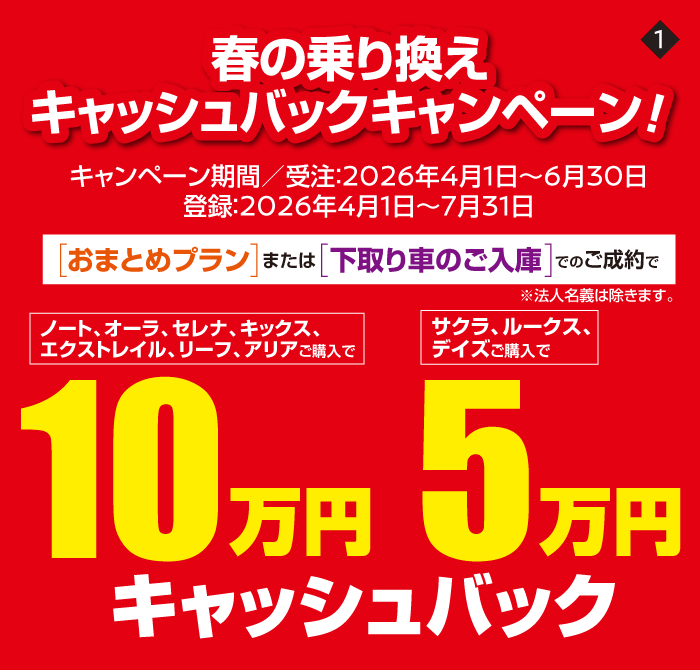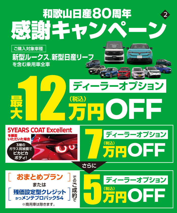 ※キャンペーンは、予告なく変更または終了する場合がございますのであらかじめご了承ください。※直接当社販売店で新車をご購入いただいた場合に対象となります。※法人リース契約、日産関係者は除きます。※プレゼントの権利を他人に譲渡したり、現金または他の商品と交換することはできません。※適用条件・期間については、和歌山日産ホームページ、もしくはカーライフアドバイザーまでお問い合わせください。