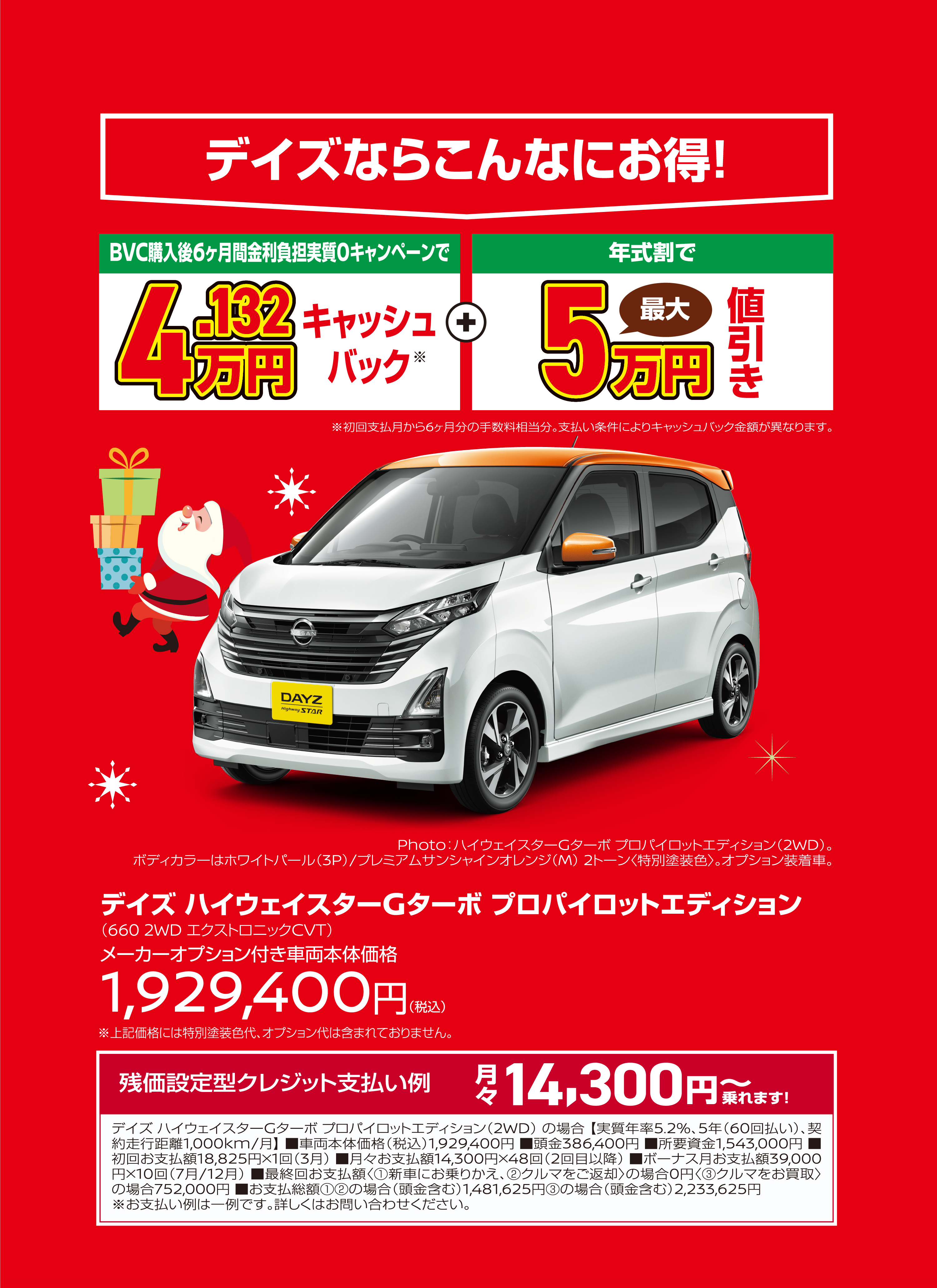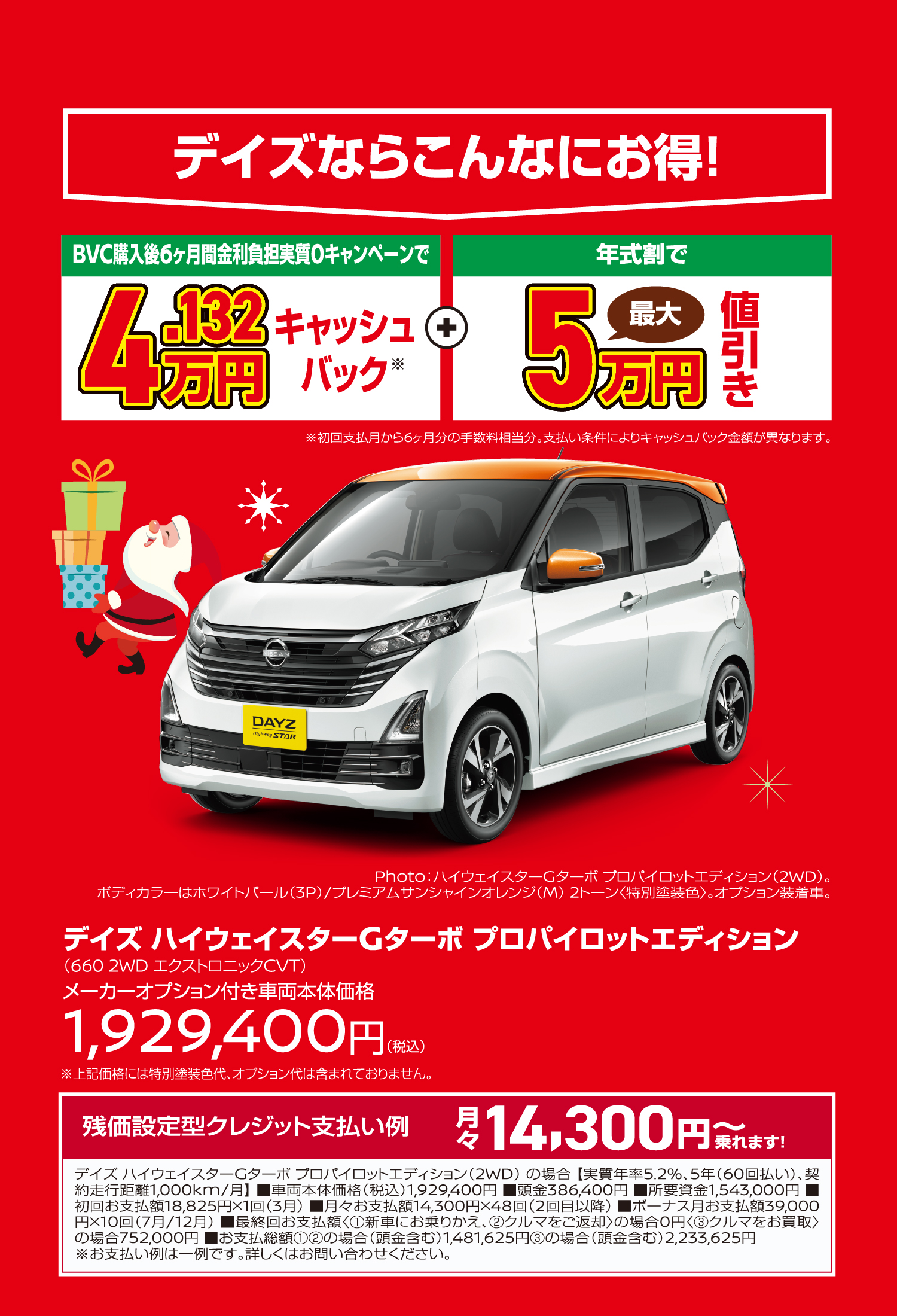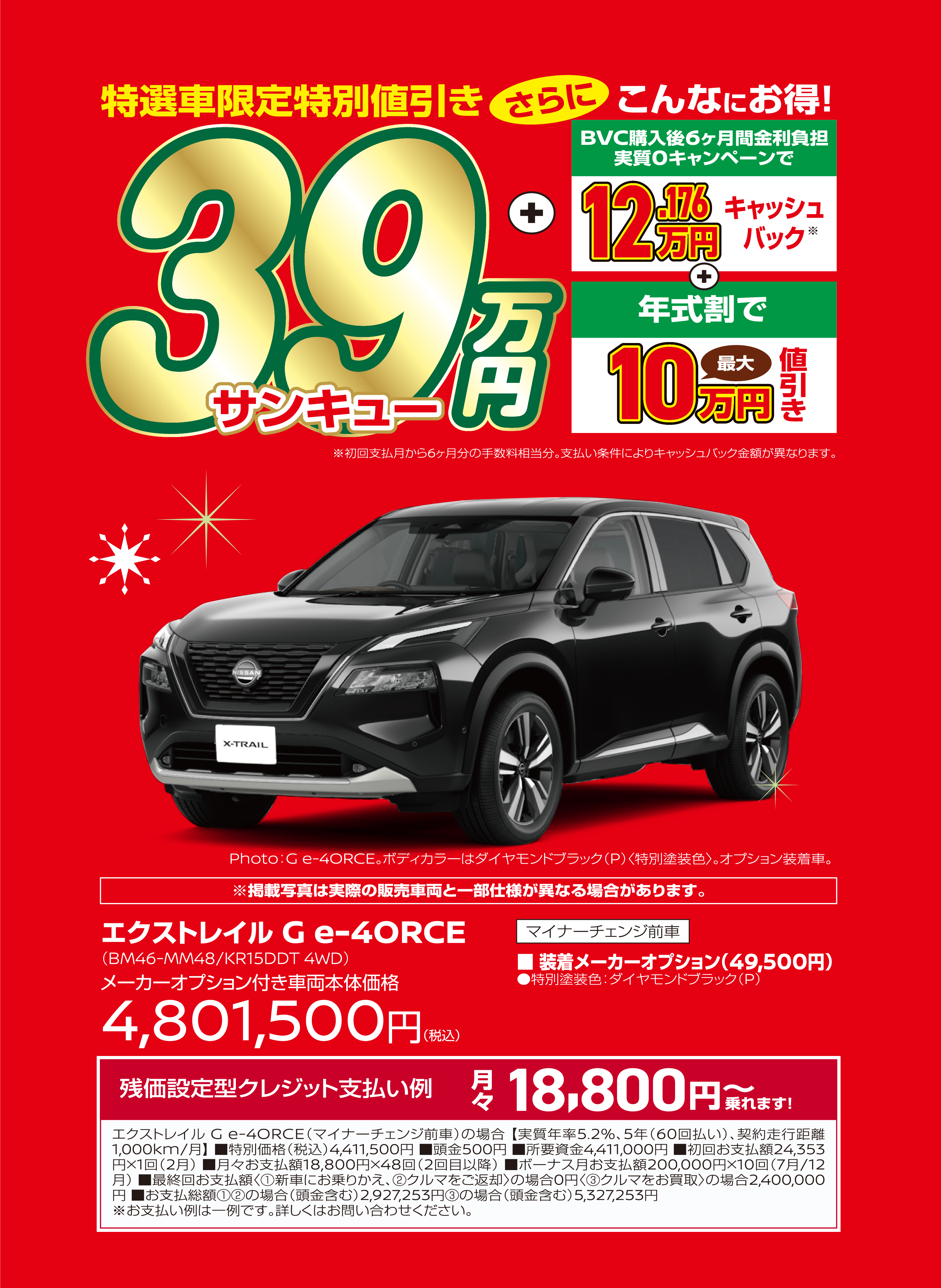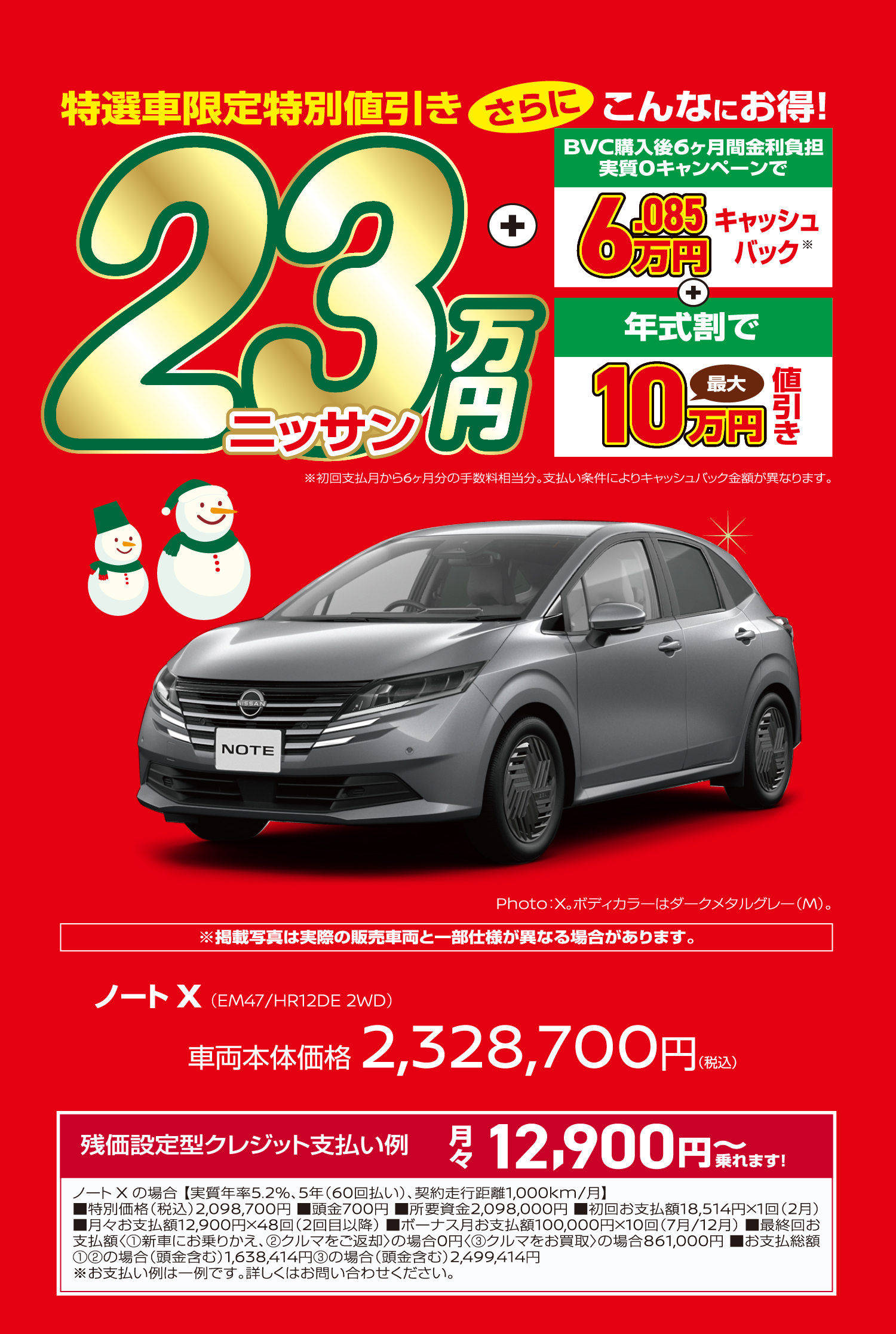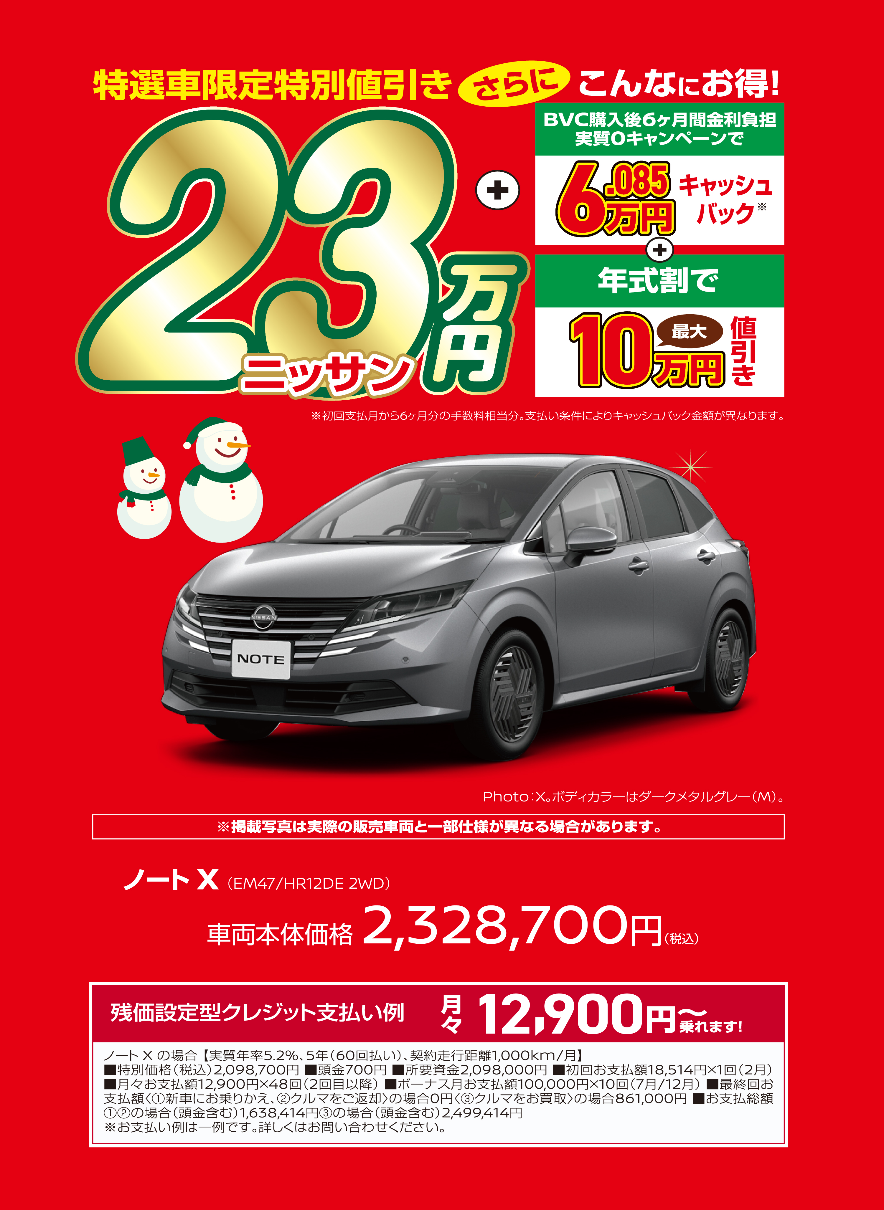 〈残価設定型クレジットについて〉●残価設定型クレジット対象の新車をご成約の方で、㈱日産フィナンシャルサービスをご利用の場合に限らせていただきます。●お支払い回数は3年(36回払い)、4年(48回払い)、5年(60回払い)より、また契約走行距離は1,000km/月、1,500km/月よりそれぞれお選びいただけます。●「日産リーフ」(新車)の場合、お支払い回数は4年(48回払い)、5年(60回払い)、6年(72回払い)よりお選びいただけます。また走行距離は1,000km/月、1,500km/月よりそれぞれお選びいただけますが、6年(72回払い)は1,000km/月のみとなります。●最終回の残価はお支払い回数や契約走行距離により異なります。●本クレジット最終回に新車にお乗りかえ、クルマを返却、クルマをお客さまが買取(残価を現金一括または再クレジットでお支払い)のいずれかをお選びいただけます。なお、車両返却の際、走行距離または内外装減点が「残価保証の条件」に定める基準を超える場合は、査定価格との差額をご負担いただきます。●本クレジットは予告なく終了する場合がございます。あらかじめご了承ください。●お申し込みいただきましても審査の結果お受けできない場合もございます。<価格について>※価格には保険料、税金(消費税を除く)、登録(届出)等に伴う諸費用、リサイル料金、オプション代、特別塗装色代は含まれておりません。別途申し受けます。※表示している価格には消費税が含まれております。※ボディカラー等は実際の色とは異なって見える場合があります。掲載内容は2025年11月21日現在のもので車両等の各情報、内容は予告なく変更または終了する場合があります。詳しくはカーライフアドバイザーにお問い合わせください。