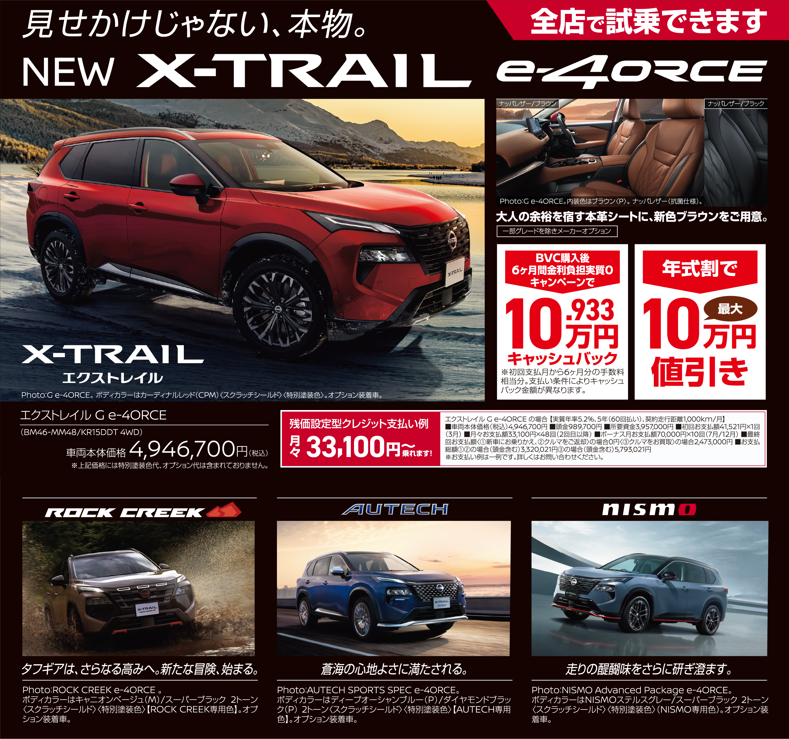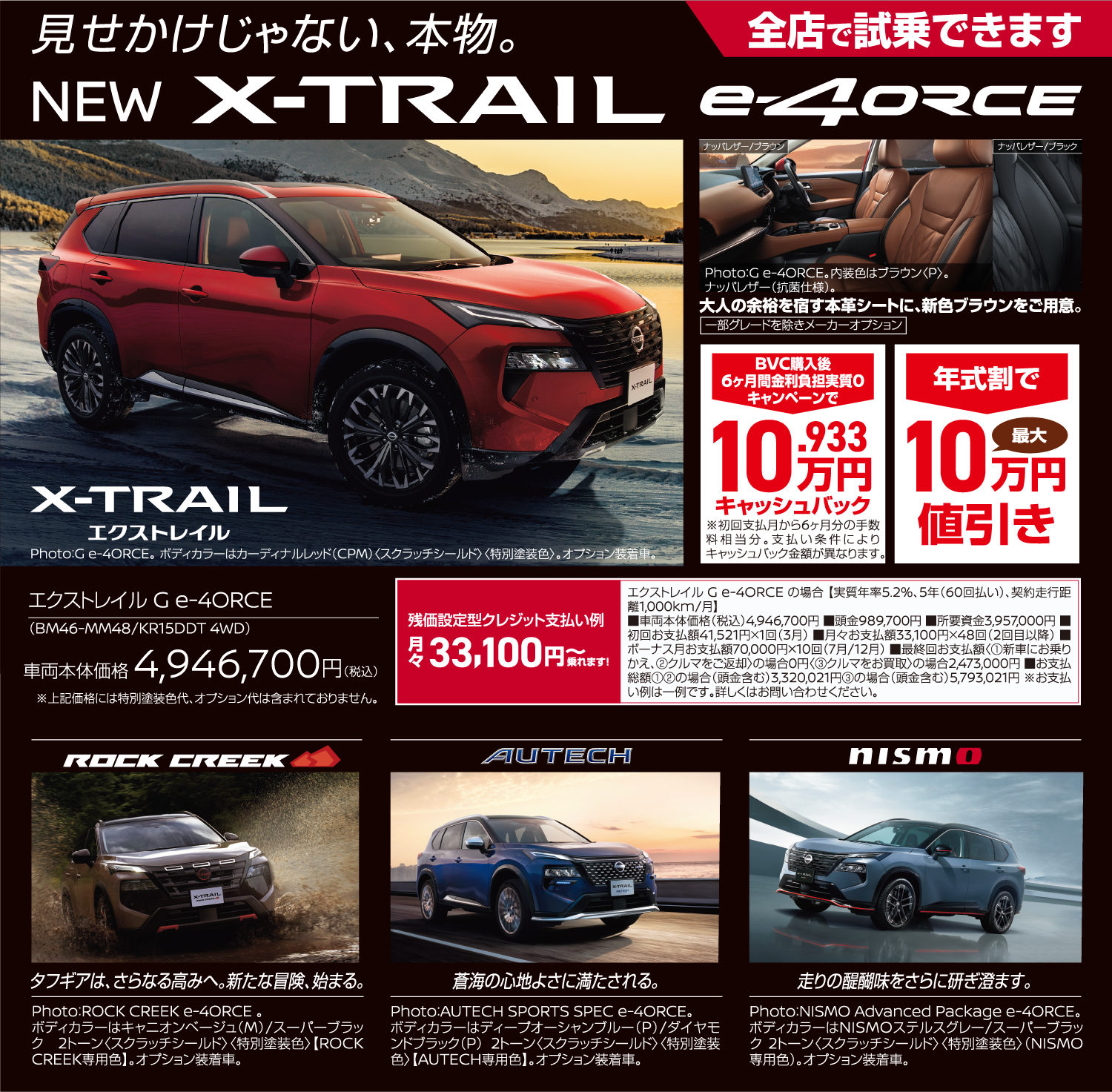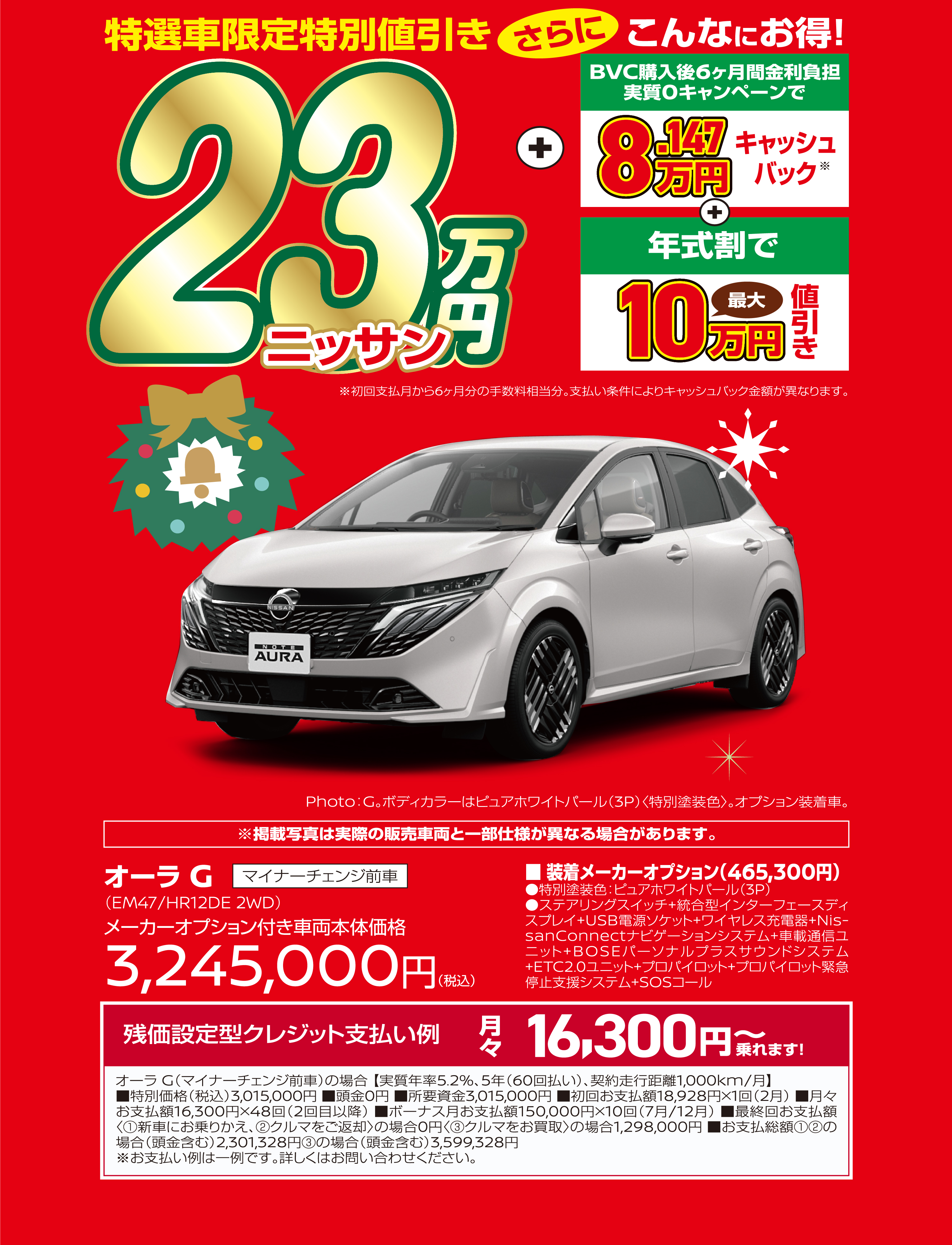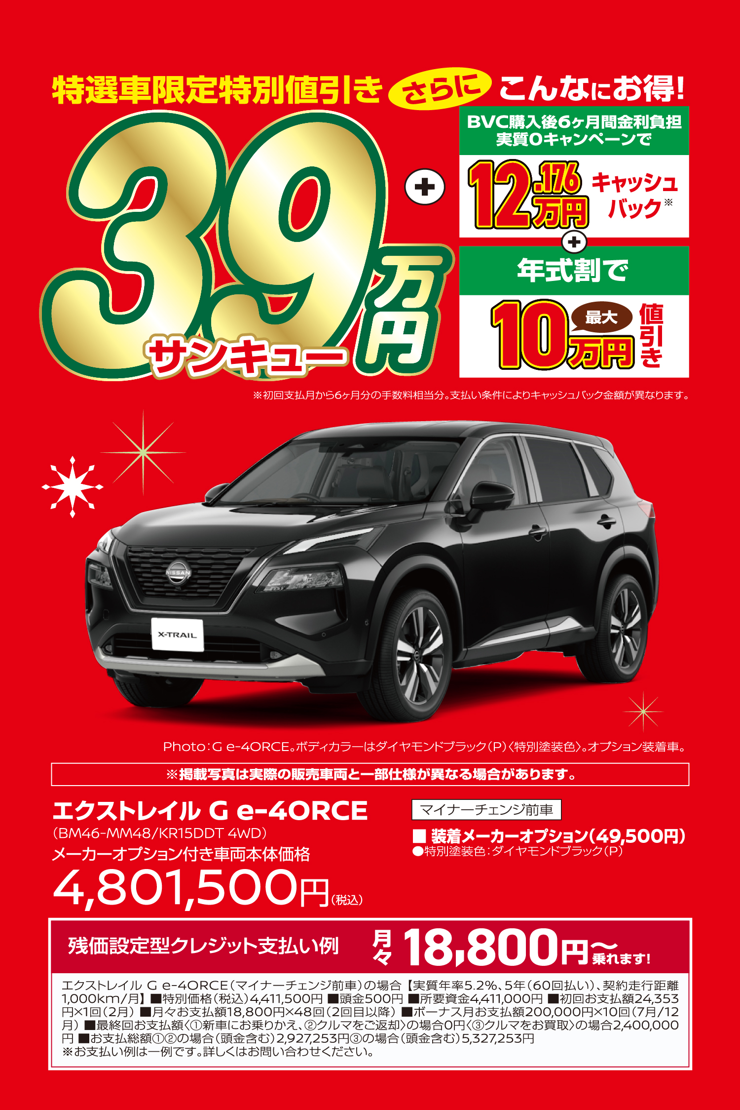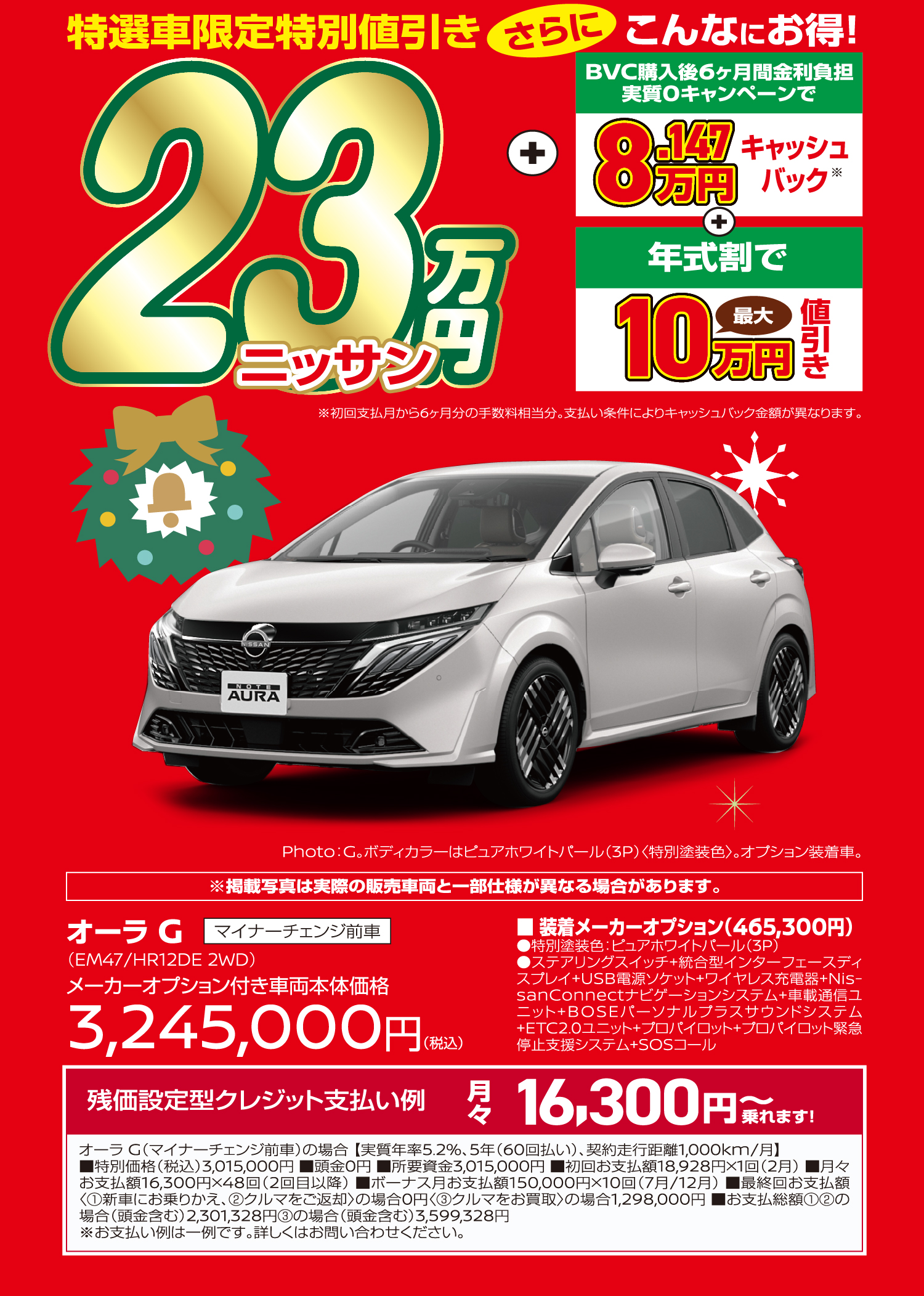 〈残価設定型クレジットについて〉●残価設定型クレジット対象の新車をご成約の方で、㈱日産フィナンシャルサービスをご利用の場合に限らせていただきます。●お支払い回数は3年(36回払い)、4年(48回払い)、5年(60回払い)より、また契約走行距離は1,000km/月、1,500km/月よりそれぞれお選びいただけます。●「日産リーフ」(新車)の場合、お支払い回数は4年(48回払い)、5年(60回払い)、6年(72回払い)よりお選びいただけます。また走行距離は1,000km/月、1,500km/月よりそれぞれお選びいただけますが、6年(72回払い)は1,000km/月のみとなります。●最終回の残価はお支払い回数や契約走行距離により異なります。●本クレジット最終回に新車にお乗りかえ、クルマを返却、クルマをお客さまが買取(残価を現金一括または再クレジットでお支払い)のいずれかをお選びいただけます。なお、車両返却の際、走行距離または内外装減点が「残価保証の条件」に定める基準を超える場合は、査定価格との差額をご負担いただきます。●本クレジットは予告なく終了する場合がございます。あらかじめご了承ください。●お申し込みいただきましても審査の結果お受けできない場合もございます。<価格について>※価格には保険料、税金(消費税を除く)、登録(届出)等に伴う諸費用、リサイル料金、オプション代、特別塗装色代は含まれておりません。別途申し受けます。※表示している価格には消費税が含まれております。※ボディカラー等は実際の色とは異なって見える場合があります。掲載内容は2025年11月21日現在のもので車両等の各情報、内容は予告なく変更または終了する場合があります。詳しくはカーライフアドバイザーにお問い合わせください。