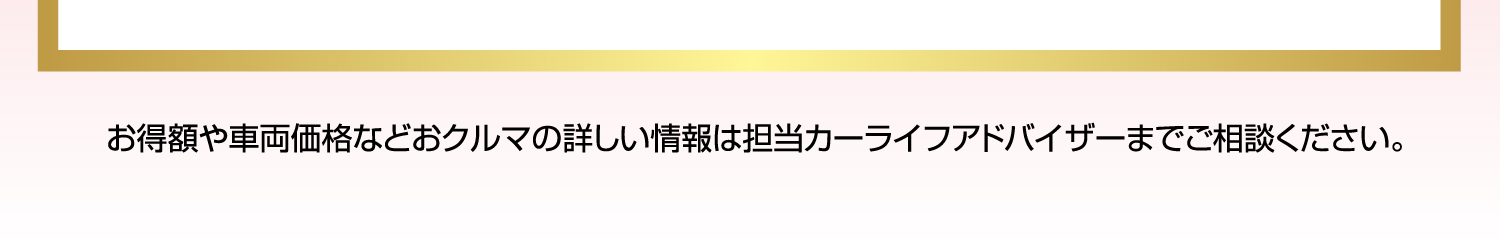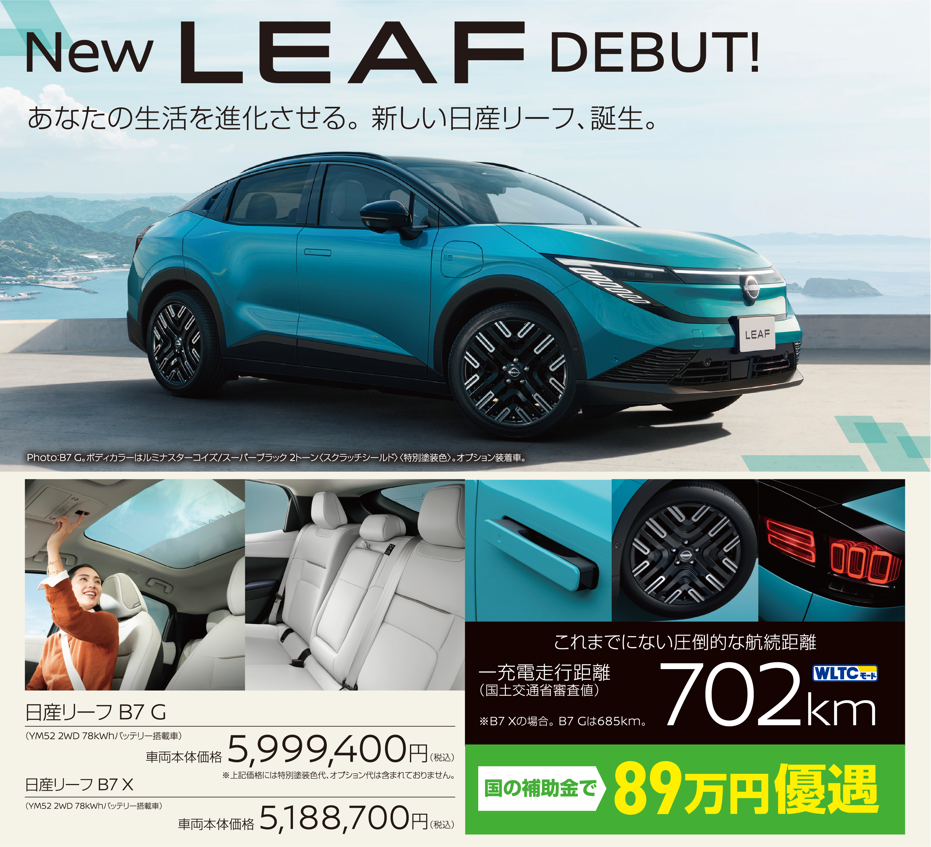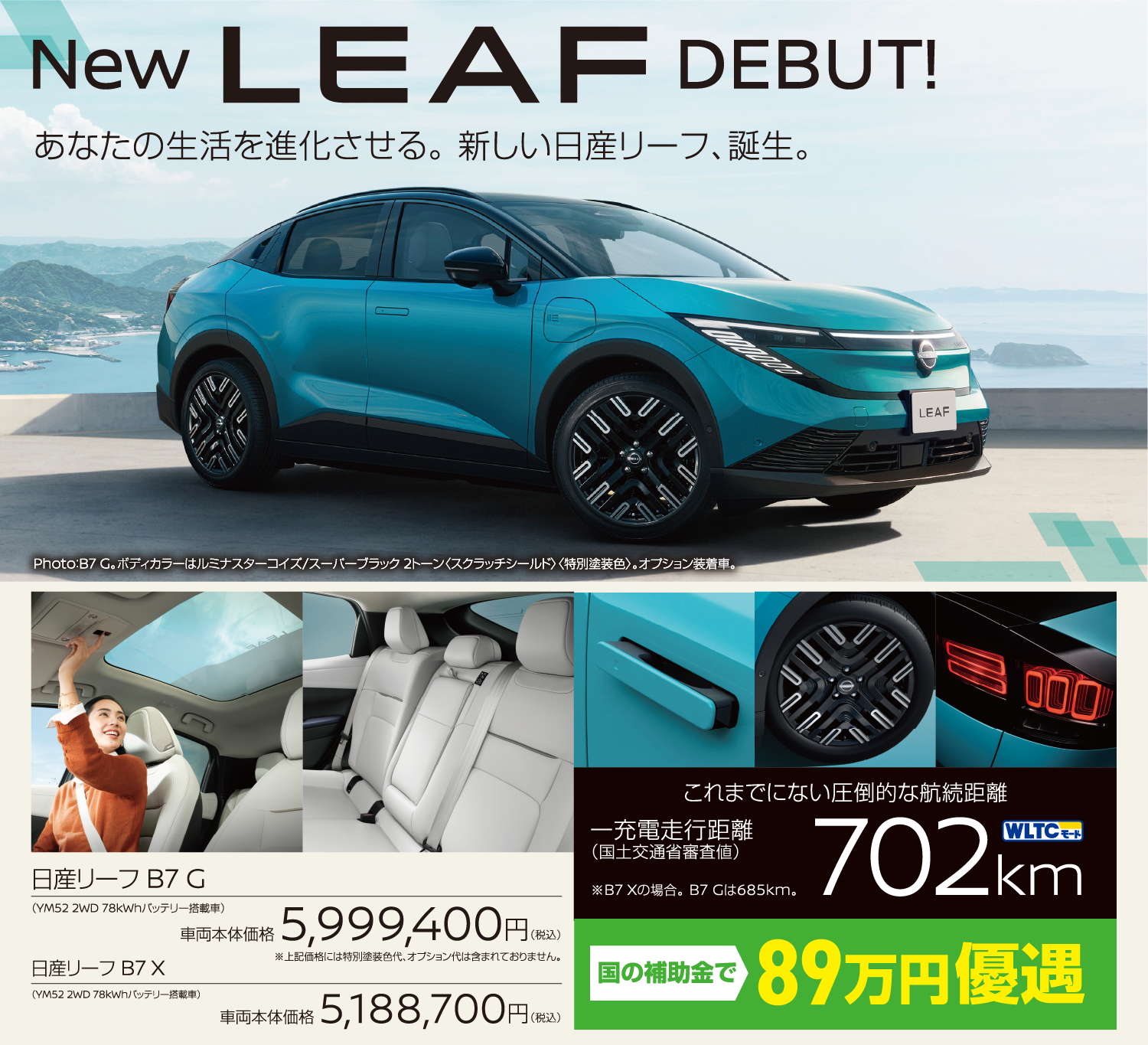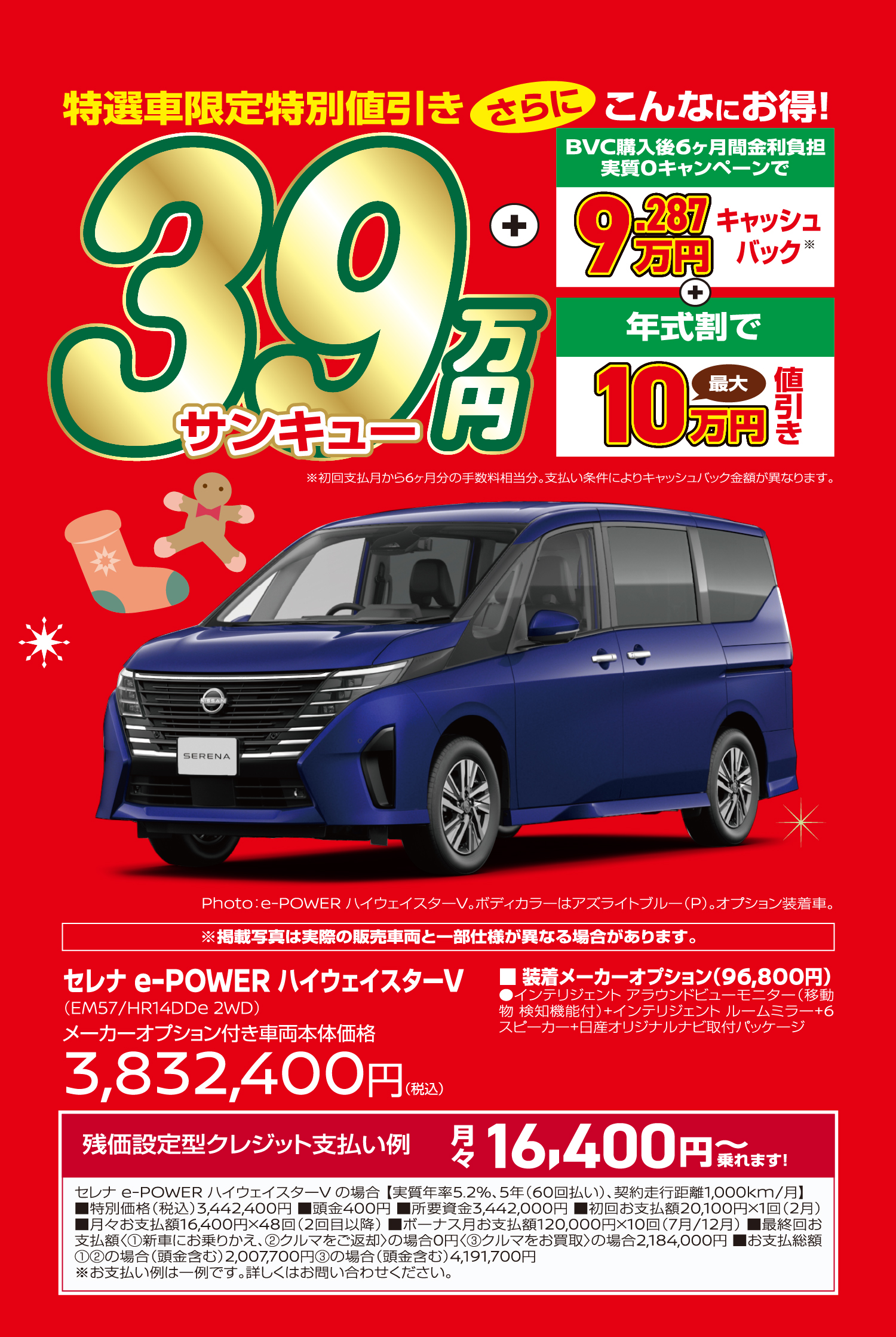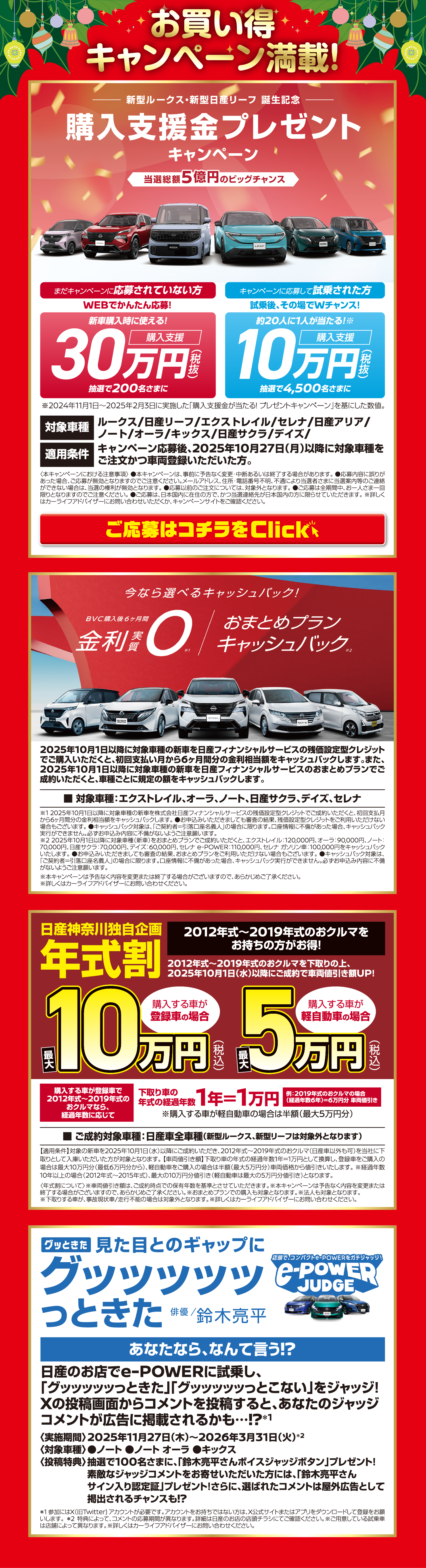 〈残価設定型クレジットについて〉●残価設定型クレジット対象の新車をご成約の方で、㈱日産フィナンシャルサービスをご利用の場合に限らせていただきます。●お支払い回数は3年(36回払い)、4年(48回払い)、5年(60回払い)より、また契約走行距離は1,000km/月、1,500km/月よりそれぞれお選びいただけます。●「日産リーフ」(新車)の場合、お支払い回数は4年(48回払い)、5年(60回払い)、6年(72回払い)よりお選びいただけます。また走行距離は1,000km/月、1,500km/月よりそれぞれお選びいただけますが、6年(72回払い)は1,000km/月のみとなります。●最終回の残価はお支払い回数や契約走行距離により異なります。●本クレジット最終回に新車にお乗りかえ、クルマを返却、クルマをお客さまが買取(残価を現金一括または再クレジットでお支払い)のいずれかをお選びいただけます。なお、車両返却の際、走行距離または内外装減点が「残価保証の条件」に定める基準を超える場合は、査定価格との差額をご負担いただきます。●本クレジットは予告なく終了する場合がございます。あらかじめご了承ください。●お申し込みいただきましても審査の結果お受けできない場合もございます。<価格について>※価格には保険料、税金(消費税を除く)、登録(届出)等に伴う諸費用、リサイル料金、オプション代、特別塗装色代は含まれておりません。別途申し受けます。※表示している価格には消費税が含まれております。※ボディカラー等は実際の色とは異なって見える場合があります。掲載内容は2025年11月21日現在のもので車両等の各情報、内容は予告なく変更または終了する場合があります。詳しくはカーライフアドバイザーにお問い合わせください。