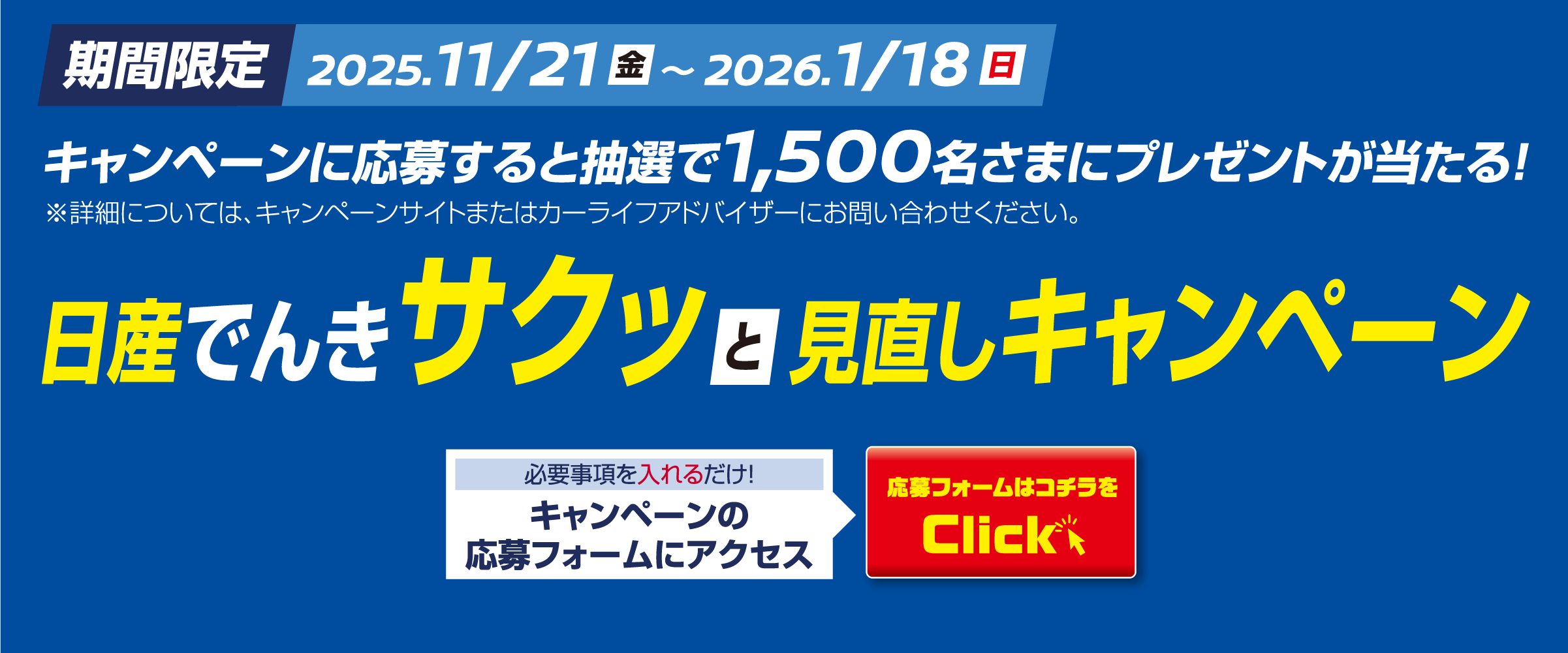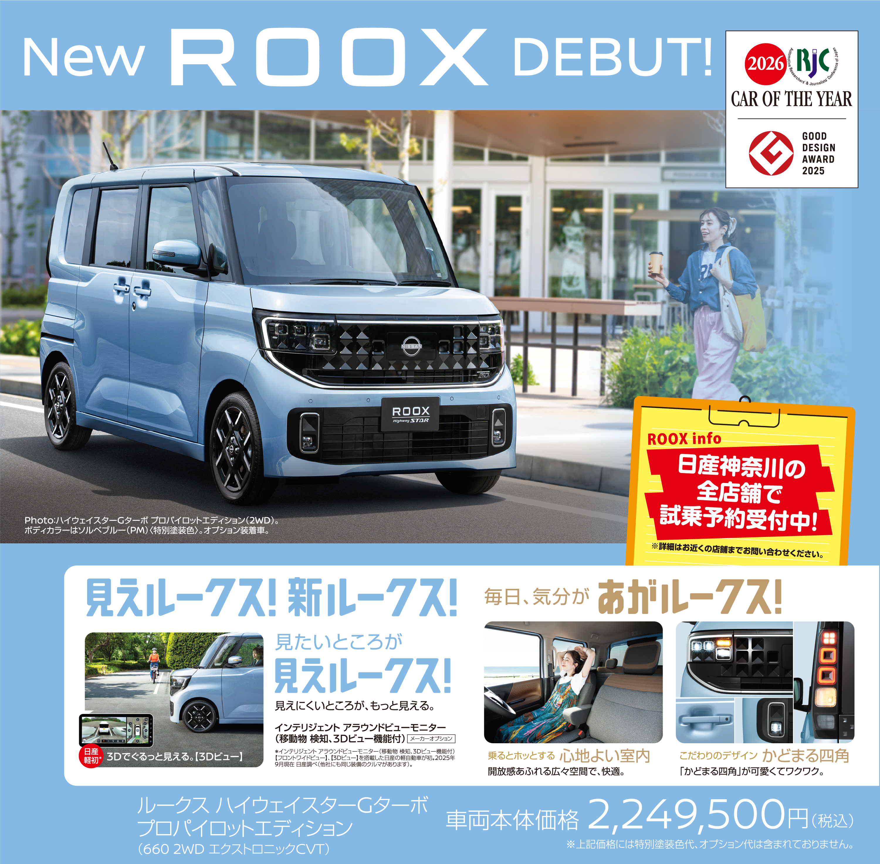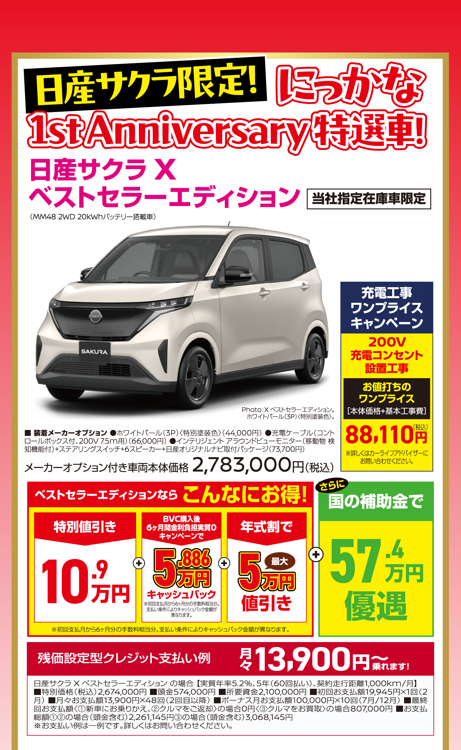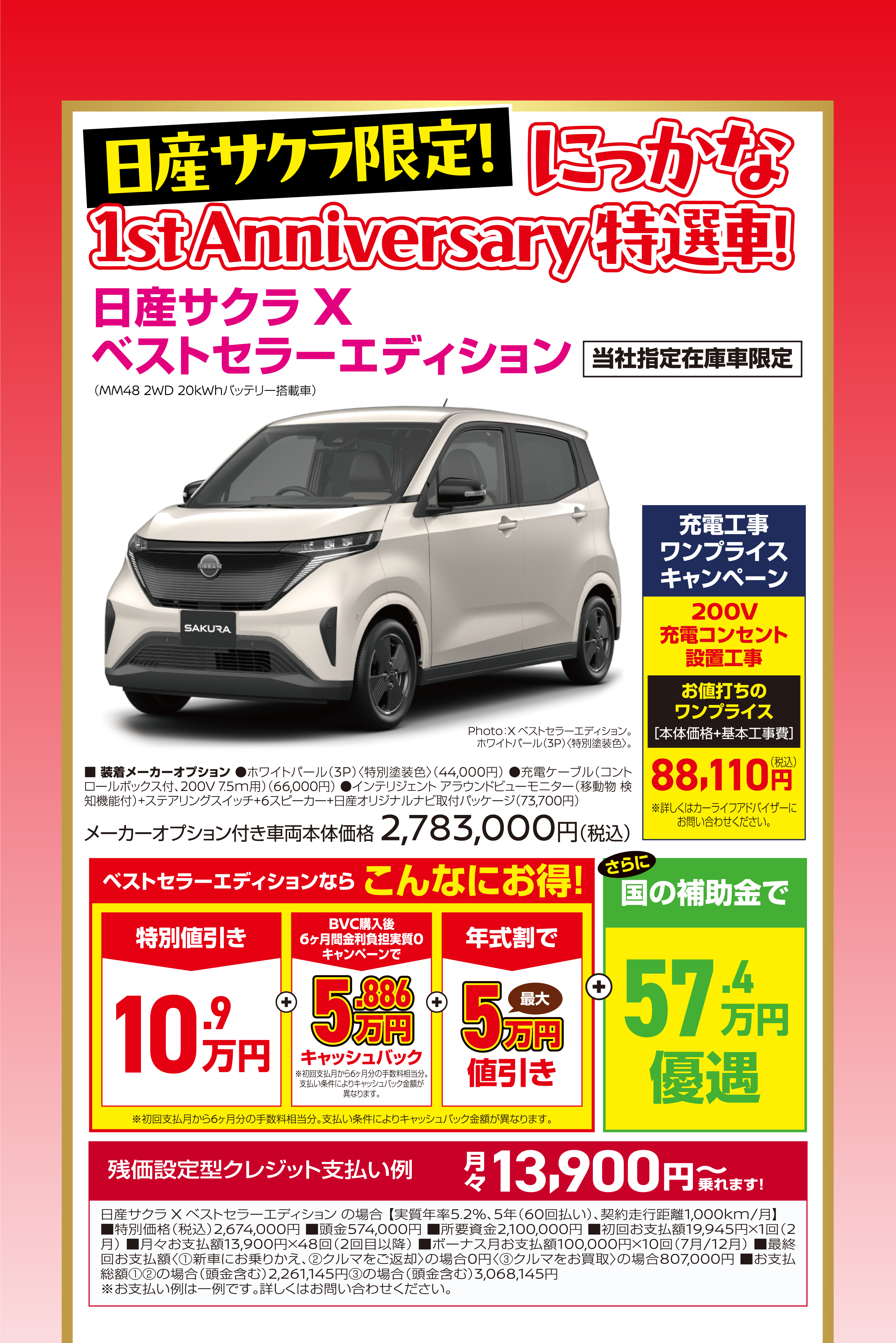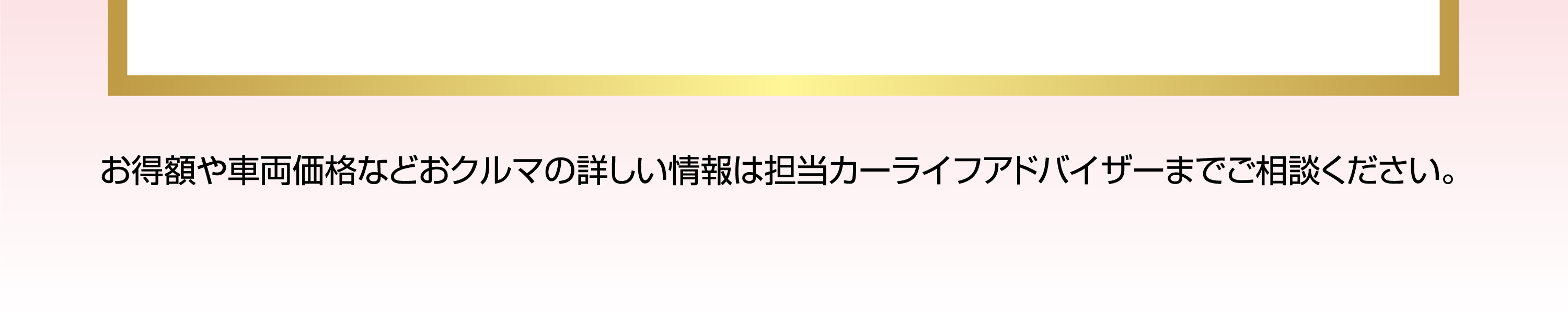 〈残価設定型クレジットについて〉●残価設定型クレジット対象の新車をご成約の方で、㈱日産フィナンシャルサービスをご利用の場合に限らせていただきます。●お支払い回数は3年(36回払い)、4年(48回払い)、5年(60回払い)より、また契約走行距離は1,000km/月、1,500km/月よりそれぞれお選びいただけます。●「日産リーフ」(新車)の場合、お支払い回数は4年(48回払い)、5年(60回払い)、6年(72回払い)よりお選びいただけます。また走行距離は1,000km/月、1,500km/月よりそれぞれお選びいただけますが、6年(72回払い)は1,000km/月のみとなります。●最終回の残価はお支払い回数や契約走行距離により異なります。●本クレジット最終回に新車にお乗りかえ、クルマを返却、クルマをお客さまが買取(残価を現金一括または再クレジットでお支払い)のいずれかをお選びいただけます。なお、車両返却の際、走行距離または内外装減点が「残価保証の条件」に定める基準を超える場合は、査定価格との差額をご負担いただきます。●本クレジットは予告なく終了する場合がございます。あらかじめご了承ください。●お申し込みいただきましても審査の結果お受けできない場合もございます。<価格について>※価格には保険料、税金(消費税を除く)、登録(届出)等に伴う諸費用、リサイル料金、オプション代、特別塗装色代は含まれておりません。別途申し受けます。※表示している価格には消費税が含まれております。※ボディカラー等は実際の色とは異なって見える場合があります。掲載内容は2025年11月21日現在のもので車両等の各情報、内容は予告なく変更または終了する場合があります。詳しくはカーライフアドバイザーにお問い合わせください。