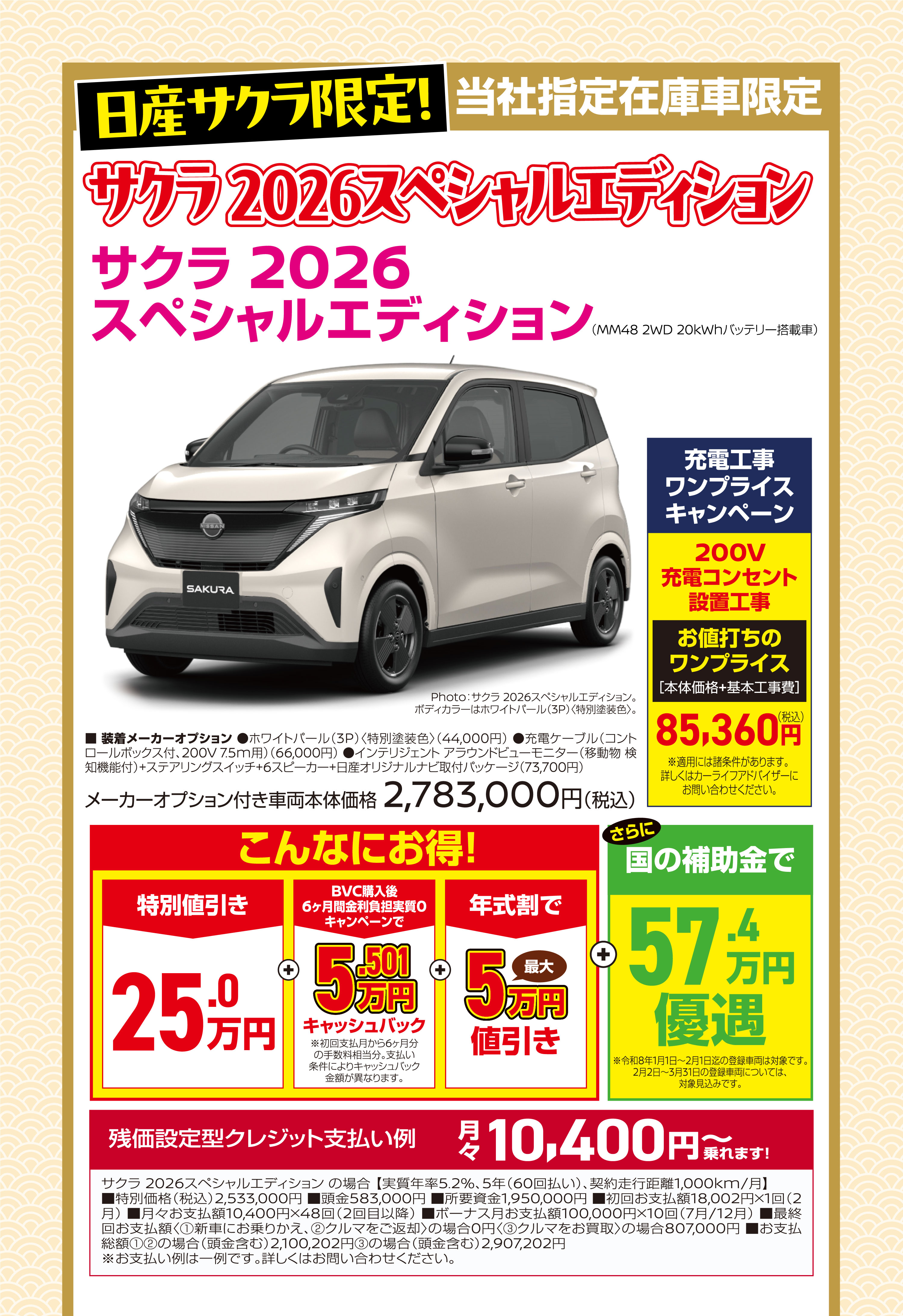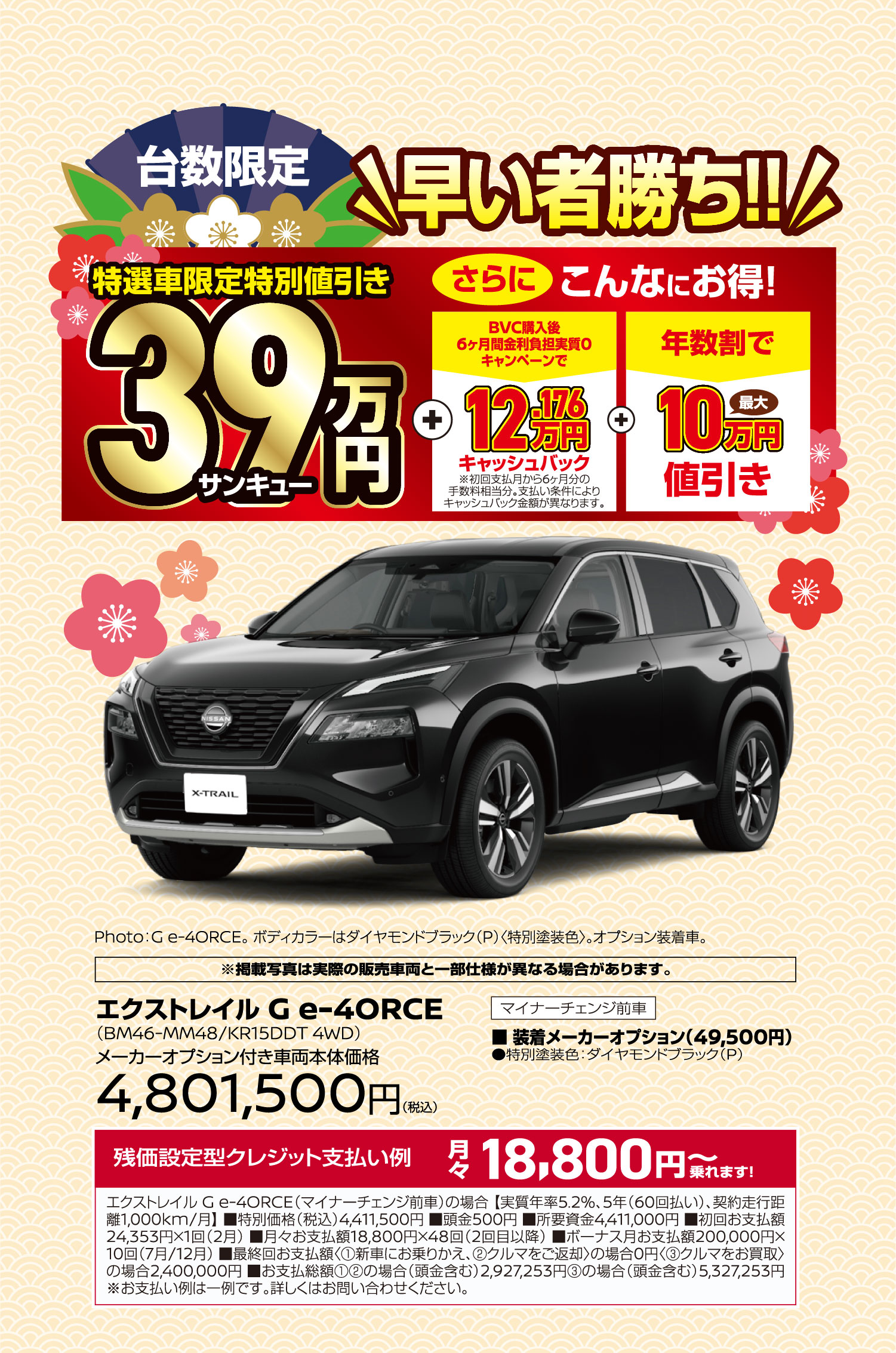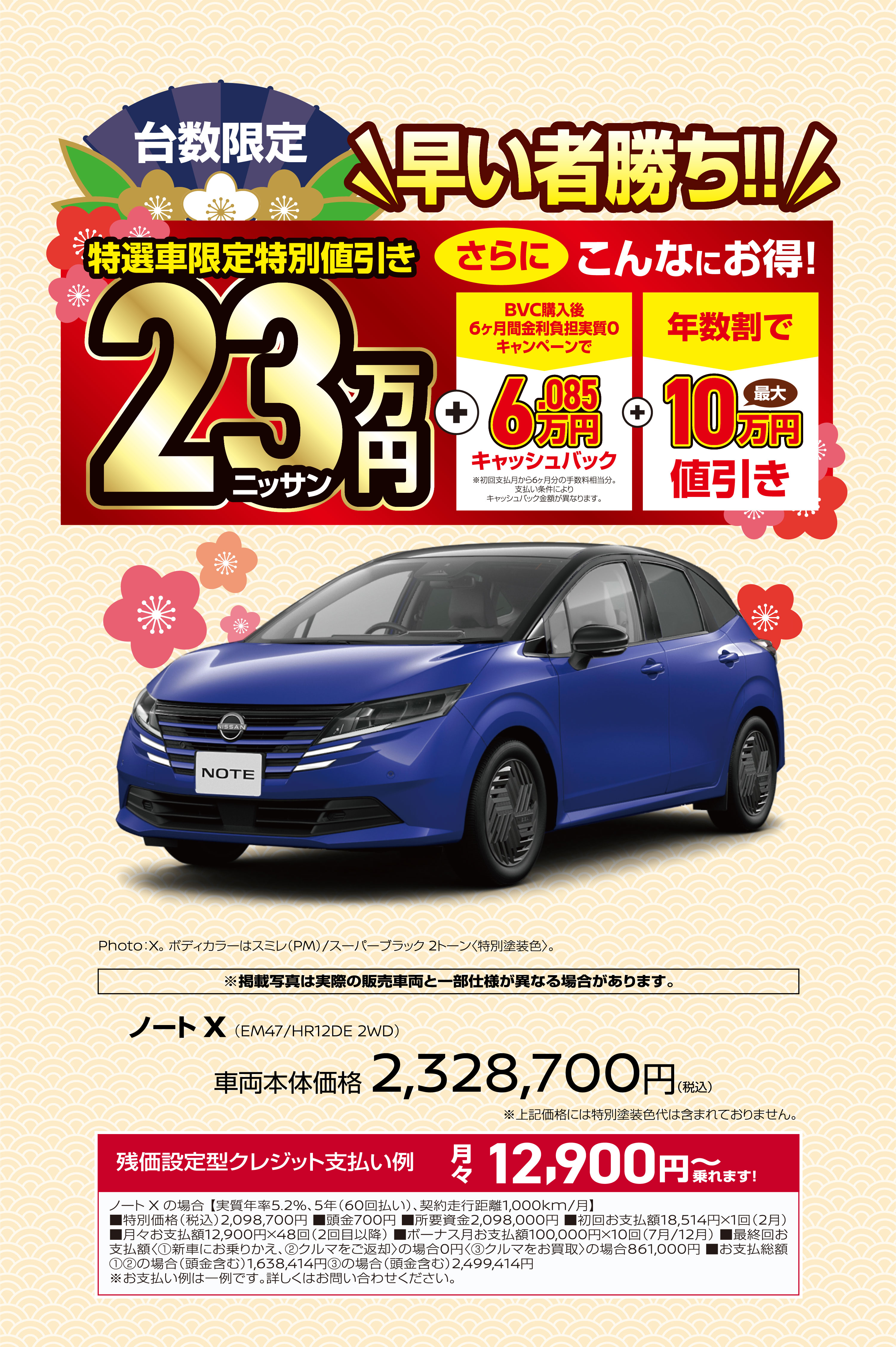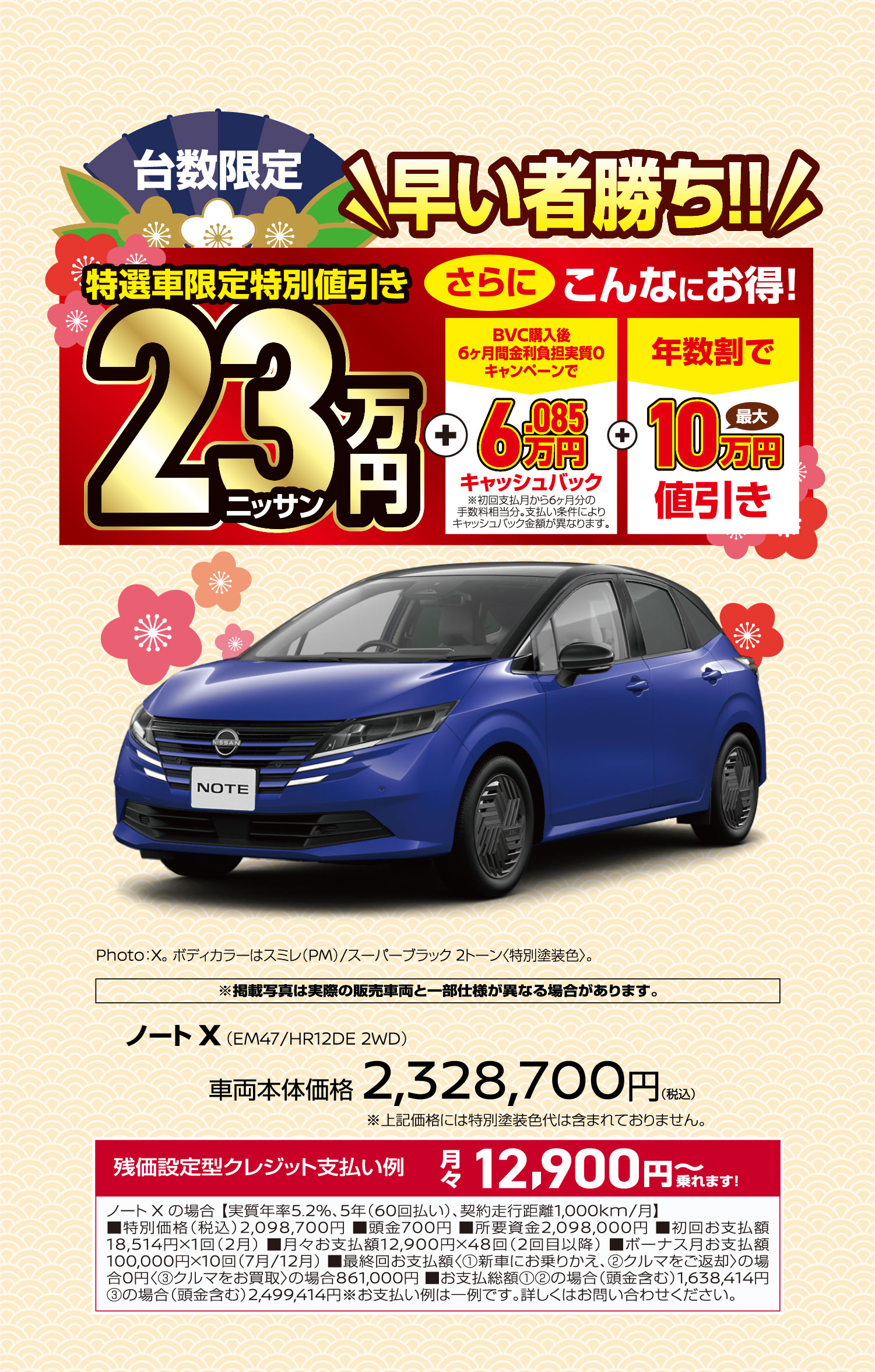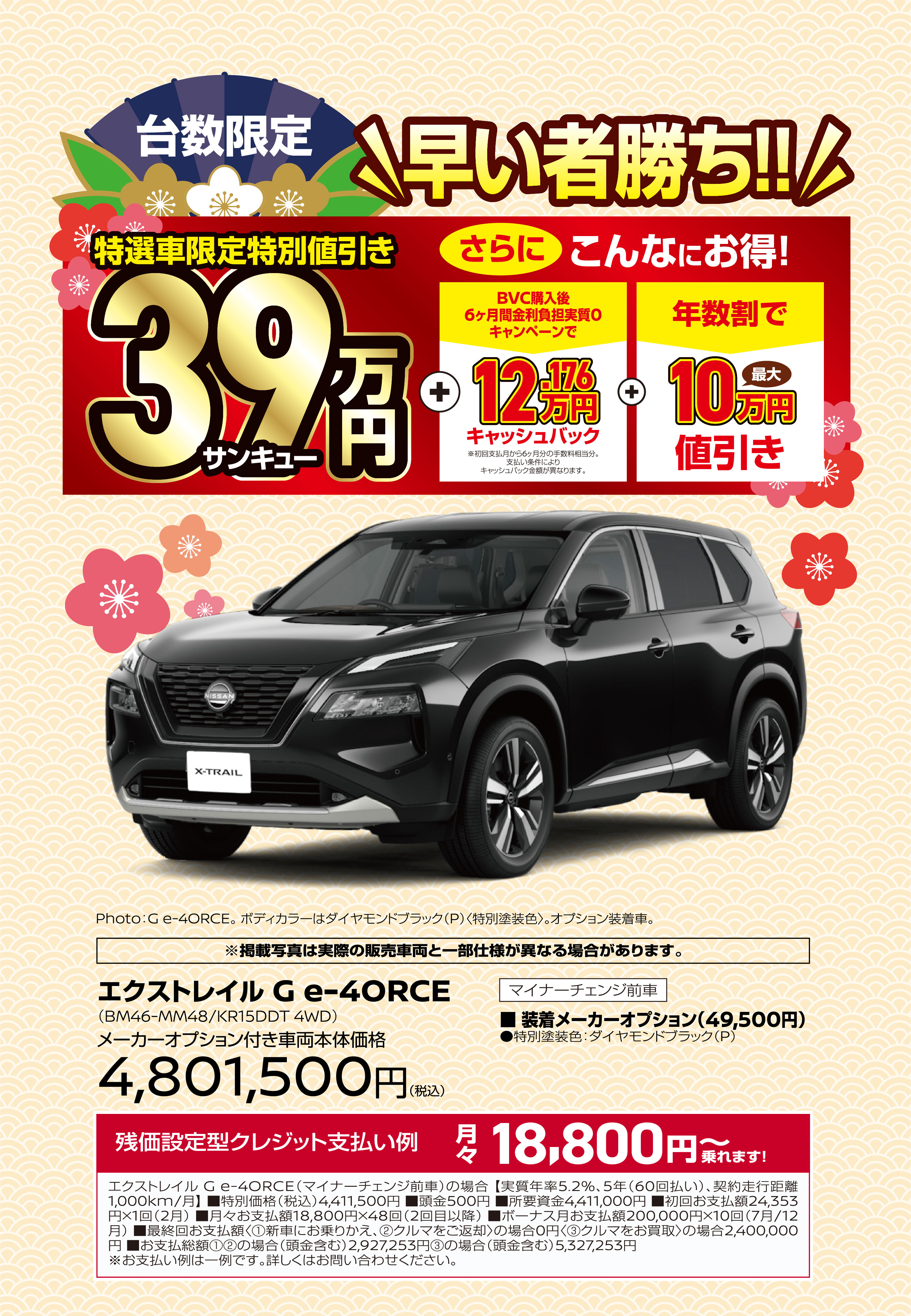 〈残価設定型クレジットについて〉●残価設定型クレジット対象の新車をご成約の方で、㈱日産フィナンシャルサービスをご利用の場合に限らせていただきます。●お支払い回数は3年(36回払い)、4年(48回払い)、5年(60回払い)より、また契約走行距離は1,000km/月、1,500km/月よりそれぞれお選びいただけます。●「日産リーフ」(新車)の場合、お支払い回数は4年(48回払い)、5年(60回払い)、6年(72回払い)よりお選びいただけます。また走行距離は1,000km/月、1,500km/月よりそれぞれお選びいただけますが、6年(72回払い)は1,000km/月のみとなります。●最終回の残価はお支払い回数や契約走行距離により異なります。●本クレジット最終回に新車にお乗りかえ、クルマを返却、クルマをお客さまが買取(残価を現金一括または再クレジットでお支払い)のいずれかをお選びいただけます。なお、車両返却の際、走行距離または内外装減点が「残価保証の条件」に定める基準を超える場合は、査定価格との差額をご負担いただきます。●本クレジットは予告なく終了する場合がございます。あらかじめご了承ください。●お申し込みいただきましても審査の結果お受けできない場合もございます。<価格について>※価格には保険料、税金(消費税を除く)、登録(届出)等に伴う諸費用、リサイル料金、オプション代、特別塗装色代は含まれておりません。別途申し受けます。※表示している価格には消費税が含まれております。※ボディカラー等は実際の色とは異なって見える場合があります。掲載内容は2026年1月9日現在のもので車両等の各情報、内容は予告なく変更または終了する場合があります。詳しくはカーライフアドバイザーにお問い合わせください。
