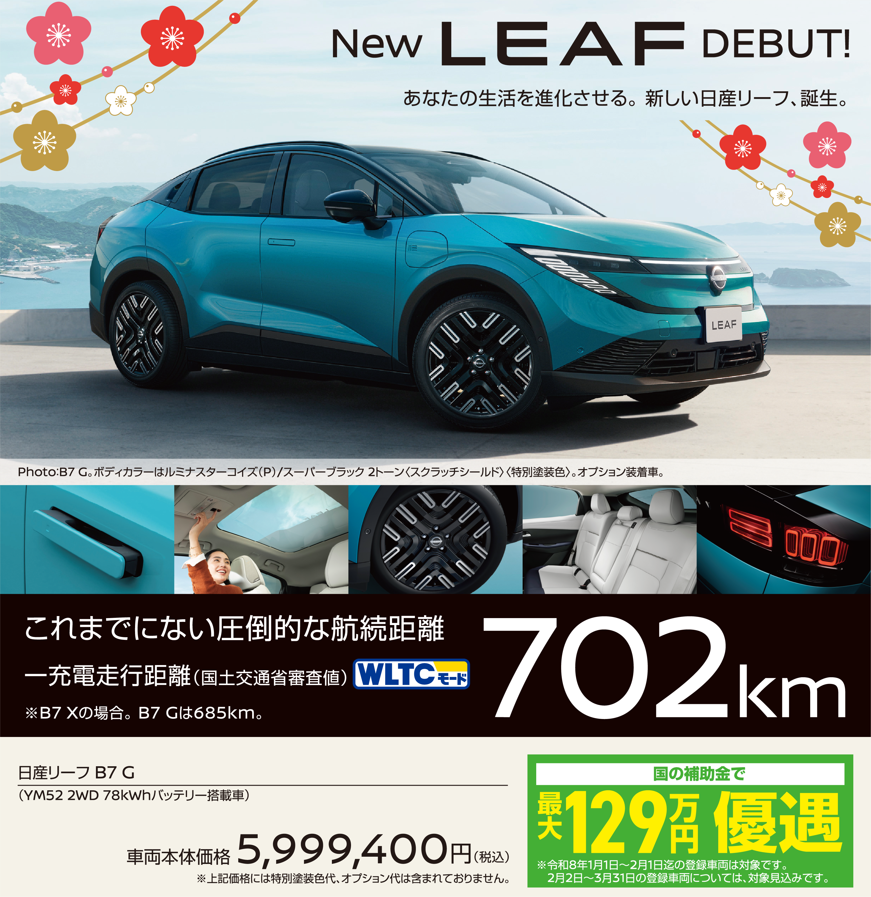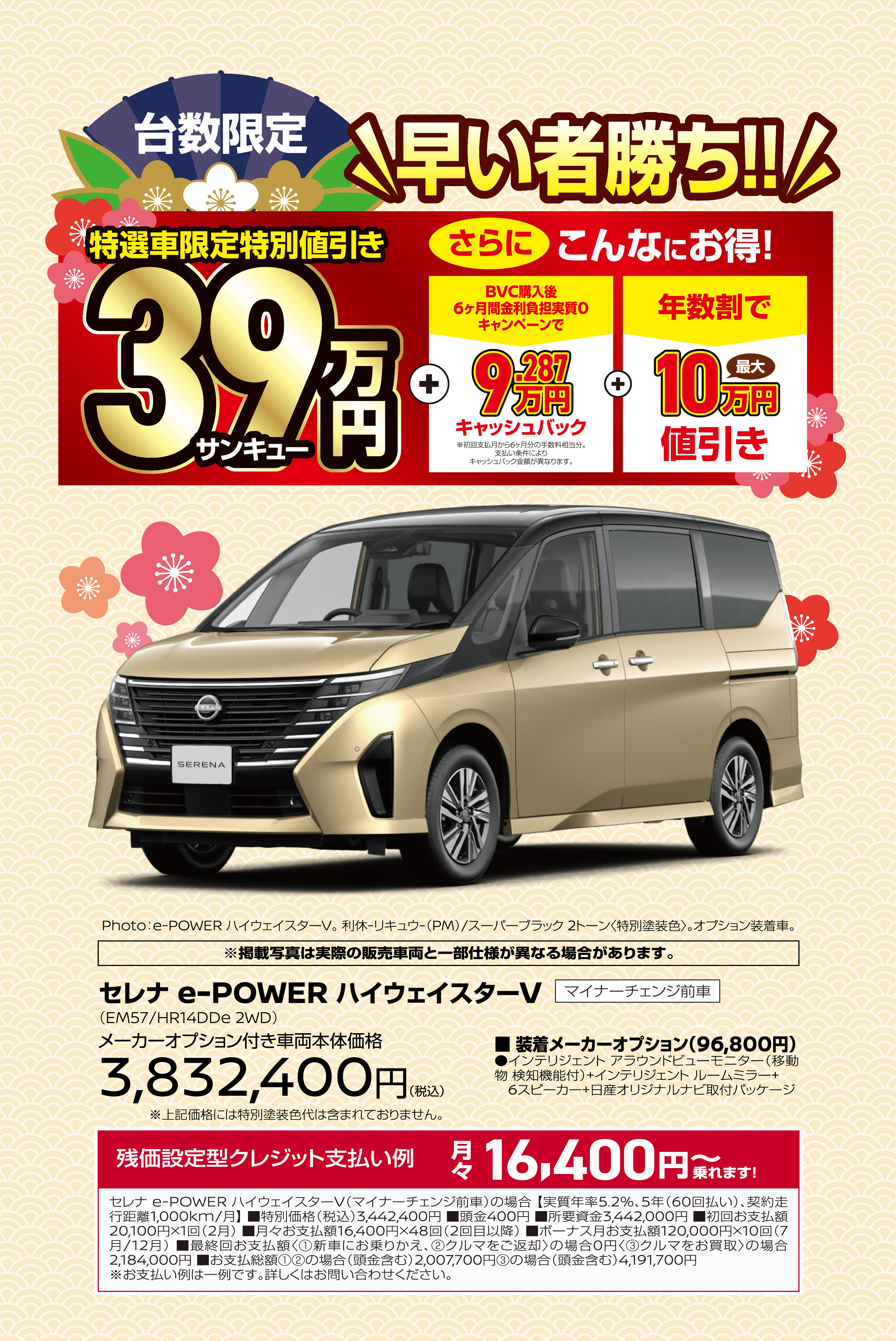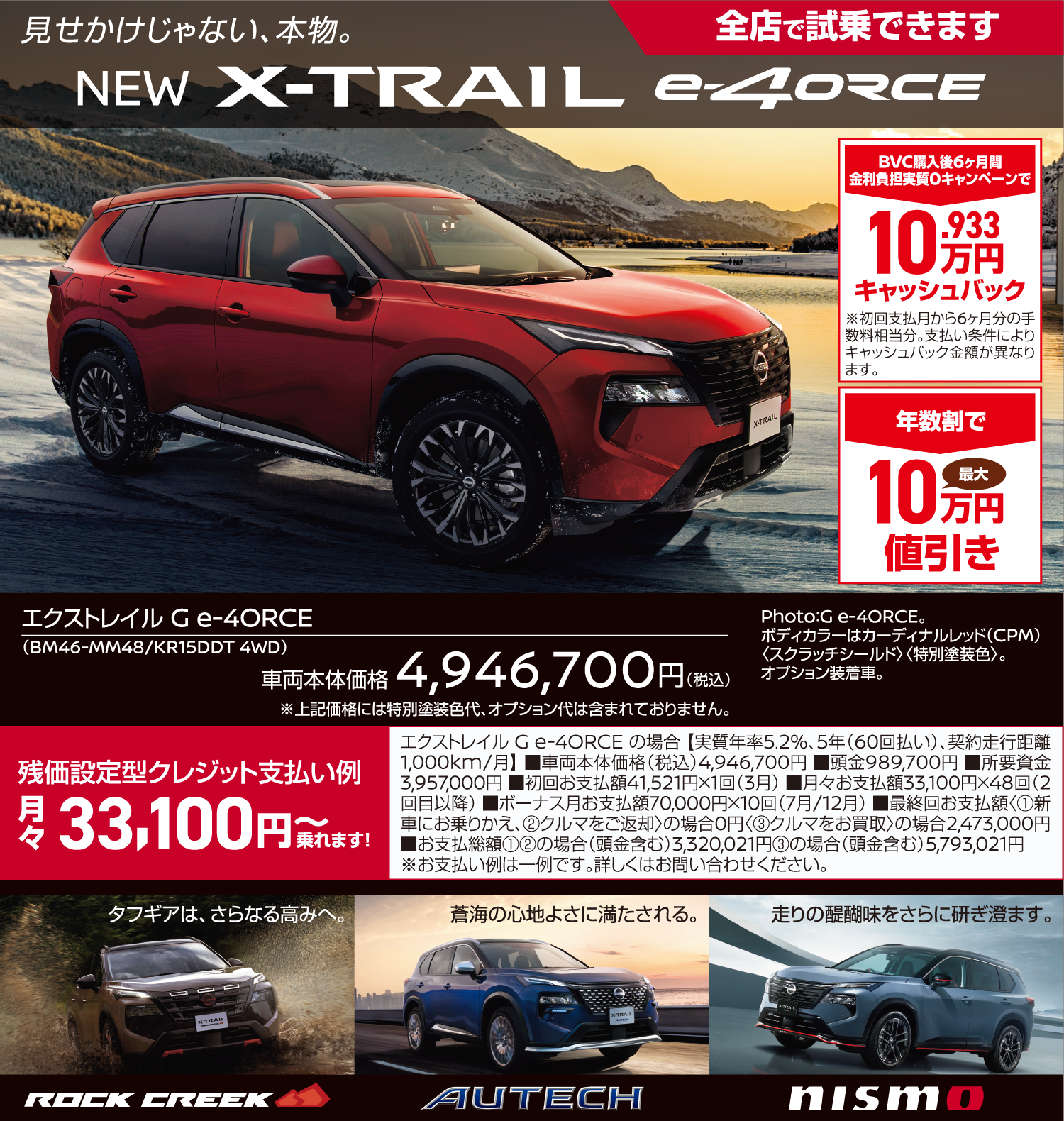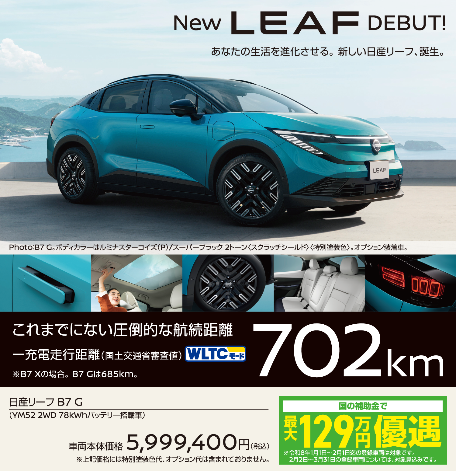 〈残価設定型クレジットについて〉●残価設定型クレジット対象の新車をご成約の方で、㈱日産フィナンシャルサービスをご利用の場合に限らせていただきます。●お支払い回数は3年(36回払い)、4年(48回払い)、5年(60回払い)より、また契約走行距離は1,000km/月、1,500km/月よりそれぞれお選びいただけます。●「日産リーフ」(新車)の場合、お支払い回数は4年(48回払い)、5年(60回払い)、6年(72回払い)よりお選びいただけます。また走行距離は1,000km/月、1,500km/月よりそれぞれお選びいただけますが、6年(72回払い)は1,000km/月のみとなります。●最終回の残価はお支払い回数や契約走行距離により異なります。●本クレジット最終回に新車にお乗りかえ、クルマを返却、クルマをお客さまが買取(残価を現金一括または再クレジットでお支払い)のいずれかをお選びいただけます。なお、車両返却の際、走行距離または内外装減点が「残価保証の条件」に定める基準を超える場合は、査定価格との差額をご負担いただきます。●本クレジットは予告なく終了する場合がございます。あらかじめご了承ください。●お申し込みいただきましても審査の結果お受けできない場合もございます。<価格について>※価格には保険料、税金(消費税を除く)、登録(届出)等に伴う諸費用、リサイル料金、オプション代、特別塗装色代は含まれておりません。別途申し受けます。※表示している価格には消費税が含まれております。※ボディカラー等は実際の色とは異なって見える場合があります。掲載内容は2026年1月9日現在のもので車両等の各情報、内容は予告なく変更または終了する場合があります。詳しくはカーライフアドバイザーにお問い合わせください。