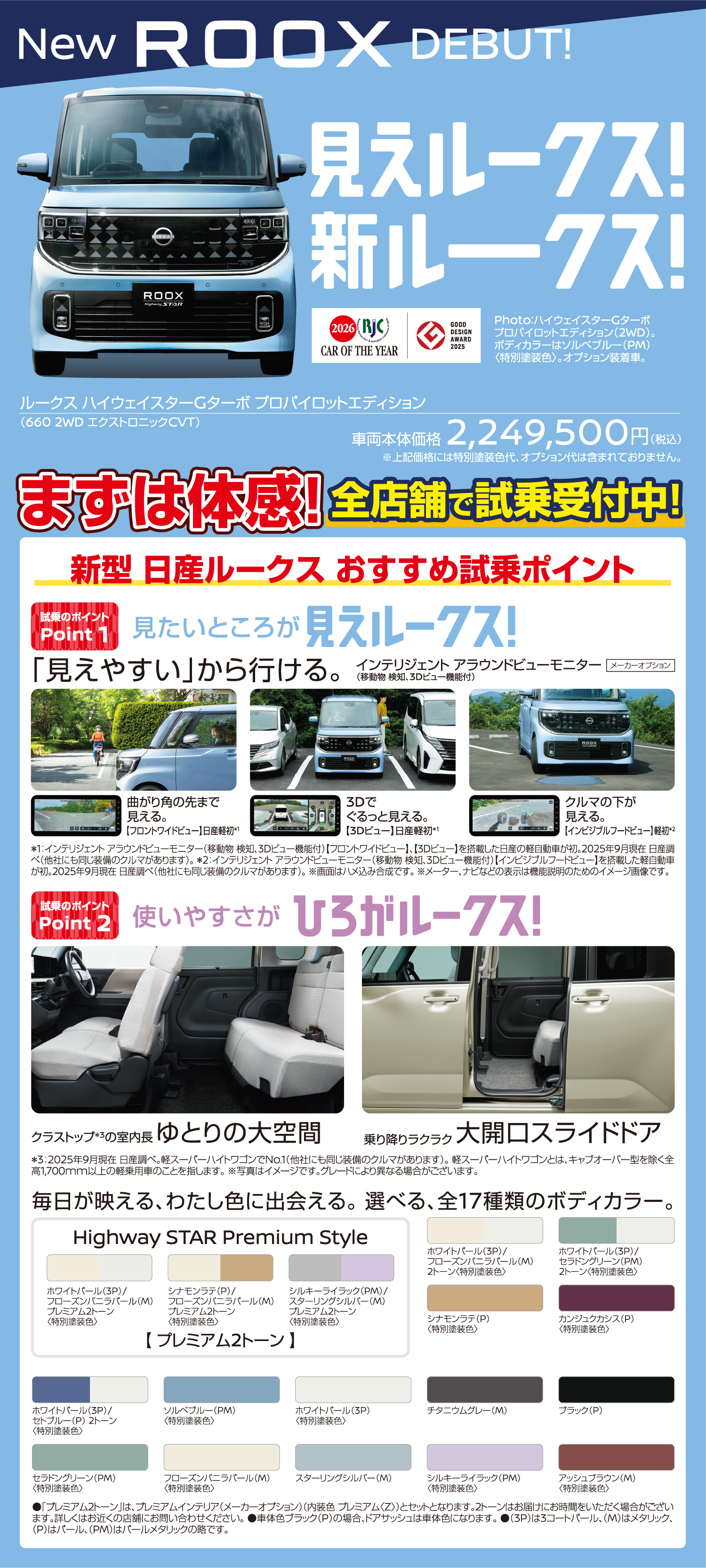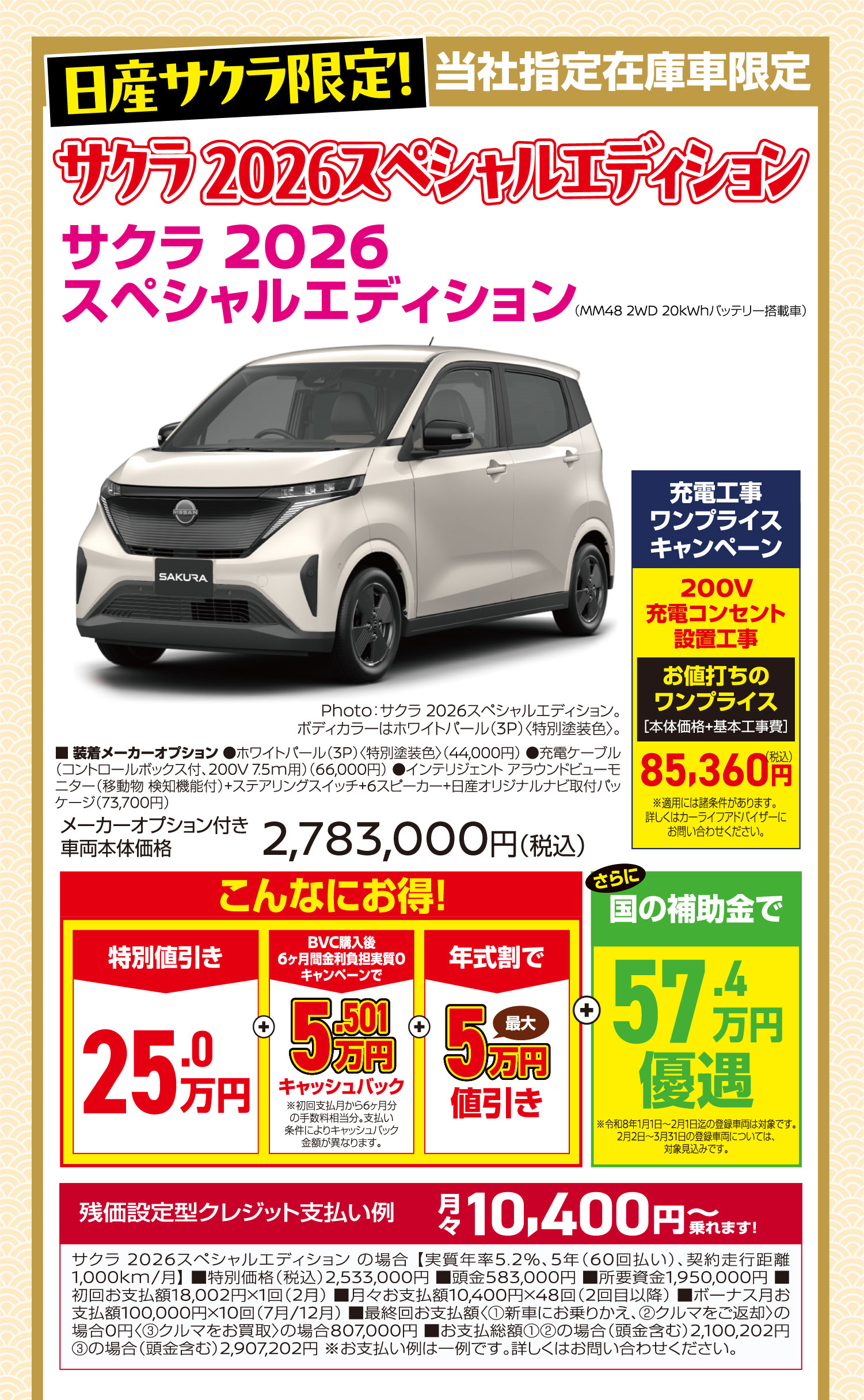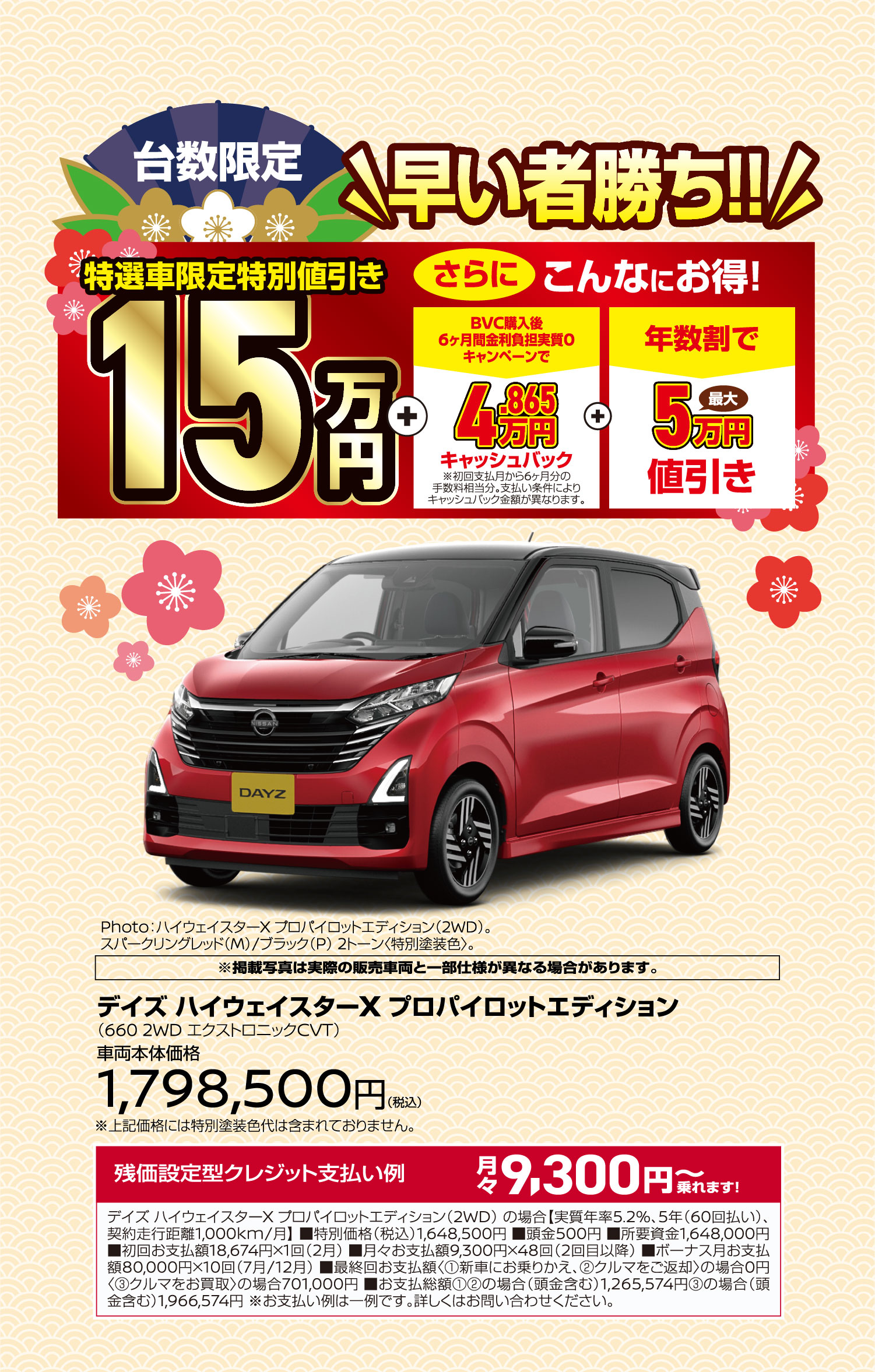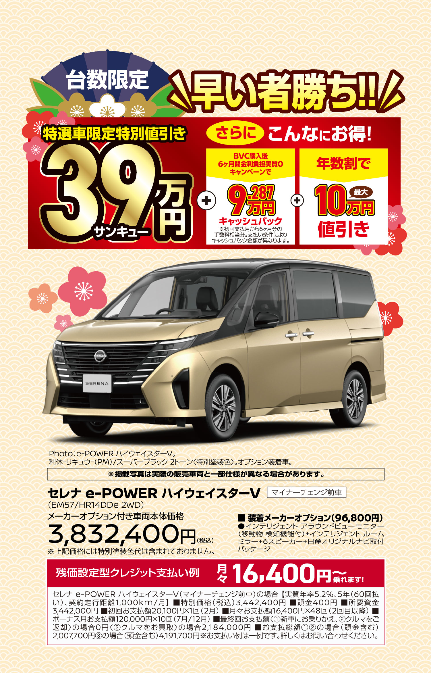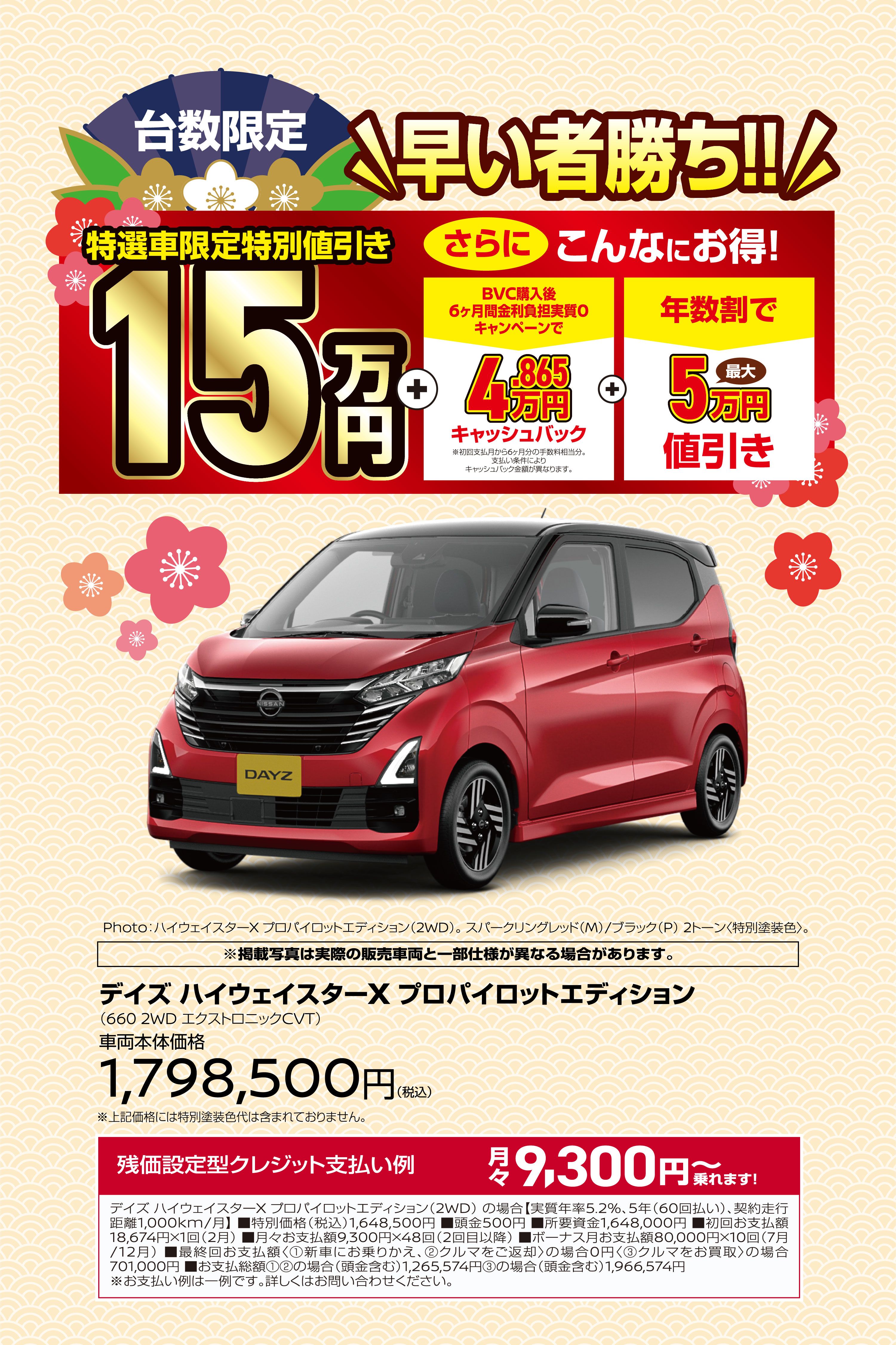 〈残価設定型クレジットについて〉●残価設定型クレジット対象の新車をご成約の方で、㈱日産フィナンシャルサービスをご利用の場合に限らせていただきます。●お支払い回数は3年(36回払い)、4年(48回払い)、5年(60回払い)より、また契約走行距離は1,000km/月、1,500km/月よりそれぞれお選びいただけます。●「日産リーフ」(新車)の場合、お支払い回数は4年(48回払い)、5年(60回払い)、6年(72回払い)よりお選びいただけます。また走行距離は1,000km/月、1,500km/月よりそれぞれお選びいただけますが、6年(72回払い)は1,000km/月のみとなります。●最終回の残価はお支払い回数や契約走行距離により異なります。●本クレジット最終回に新車にお乗りかえ、クルマを返却、クルマをお客さまが買取(残価を現金一括または再クレジットでお支払い)のいずれかをお選びいただけます。なお、車両返却の際、走行距離または内外装減点が「残価保証の条件」に定める基準を超える場合は、査定価格との差額をご負担いただきます。●本クレジットは予告なく終了する場合がございます。あらかじめご了承ください。●お申し込みいただきましても審査の結果お受けできない場合もございます。<価格について>※価格には保険料、税金(消費税を除く)、登録(届出)等に伴う諸費用、リサイル料金、オプション代、特別塗装色代は含まれておりません。別途申し受けます。※表示している価格には消費税が含まれております。※ボディカラー等は実際の色とは異なって見える場合があります。掲載内容は2026年1月9日現在のもので車両等の各情報、内容は予告なく変更または終了する場合があります。詳しくはカーライフアドバイザーにお問い合わせください。