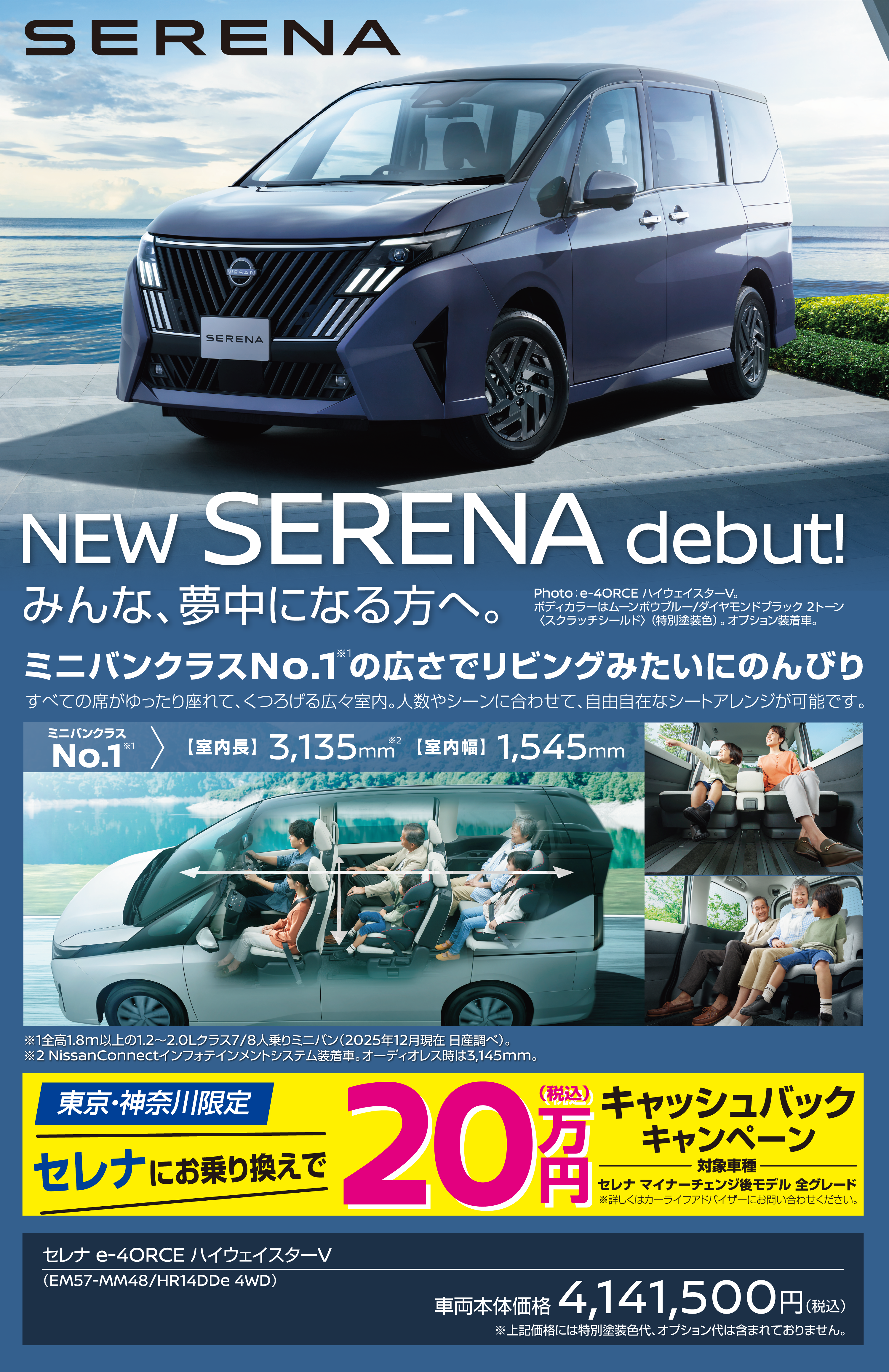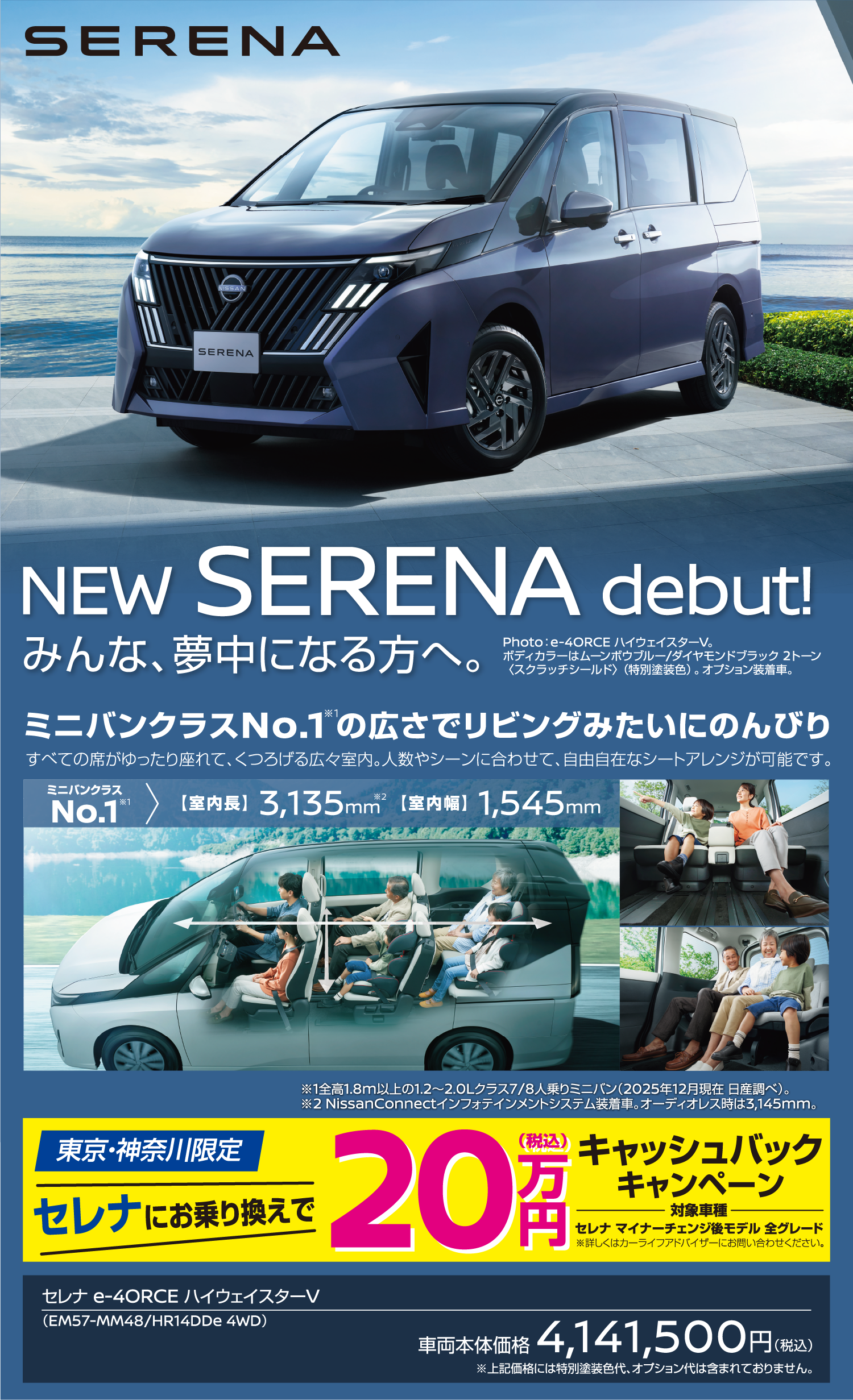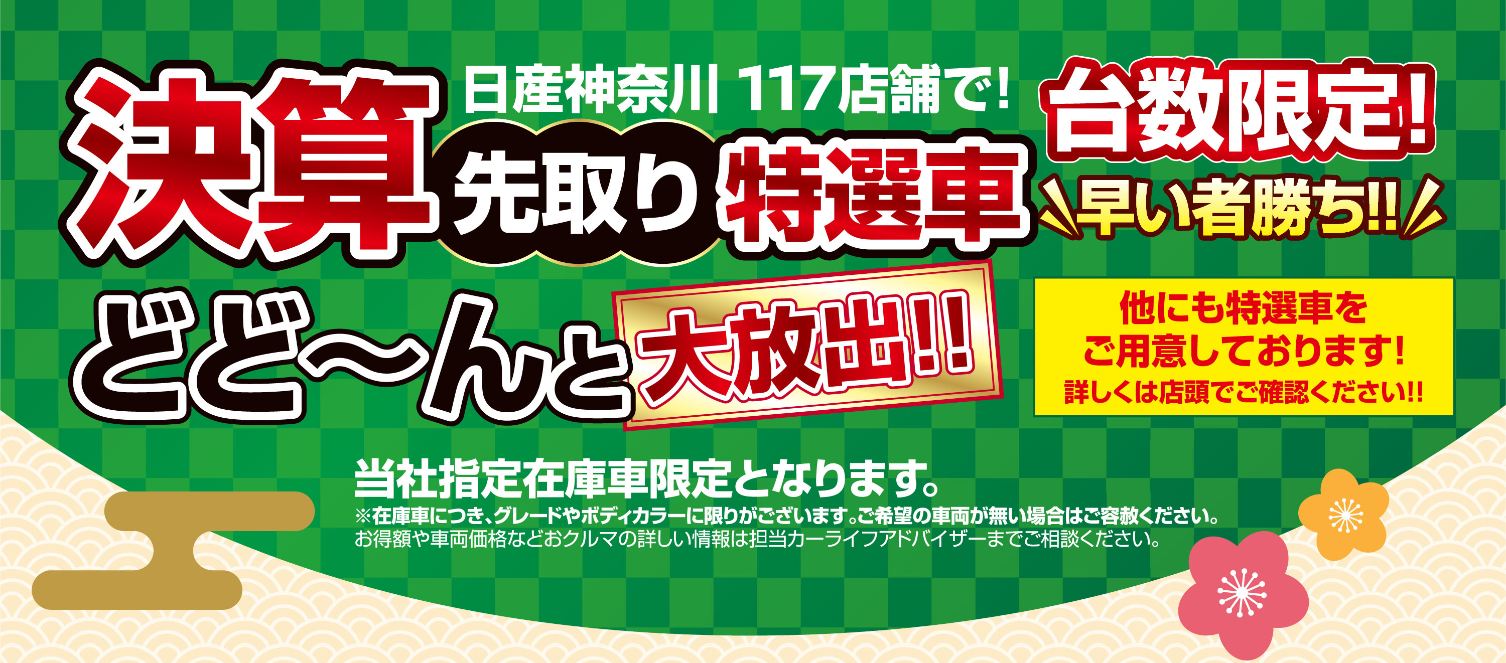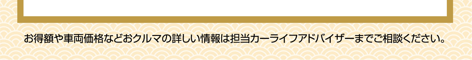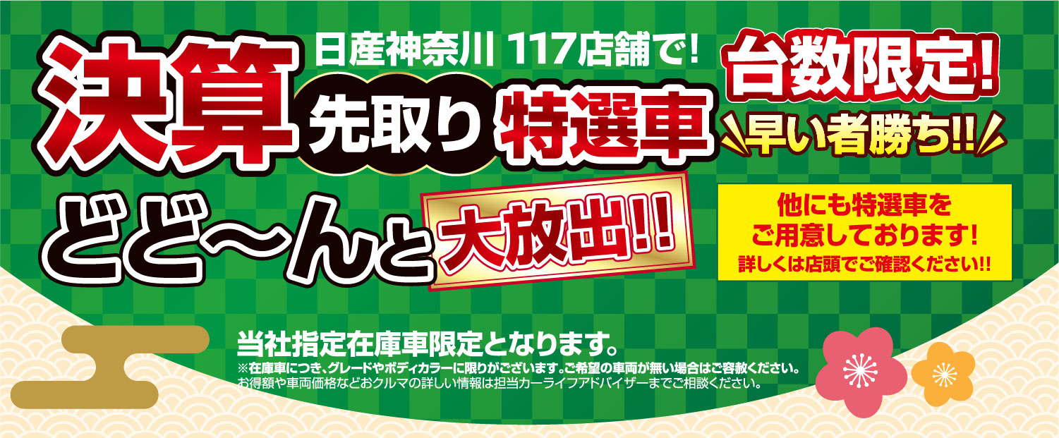 〈残価設定型クレジットについて〉●残価設定型クレジット対象の新車をご成約の方で、㈱日産フィナンシャルサービスをご利用の場合に限らせていただきます。●お支払い回数は3年(36回払い)、4年(48回払い)、5年(60回払い)より、また契約走行距離は1,000km/月、1,500km/月よりそれぞれお選びいただけます。●「日産リーフ」(新車)の場合、お支払い回数は4年(48回払い)、5年(60回払い)、6年(72回払い)よりお選びいただけます。また走行距離は1,000km/月、1,500km/月よりそれぞれお選びいただけますが、6年(72回払い)は1,000km/月のみとなります。●最終回の残価はお支払い回数や契約走行距離により異なります。●本クレジット最終回に新車にお乗りかえ、クルマを返却、クルマをお客さまが買取(残価を現金一括または再クレジットでお支払い)のいずれかをお選びいただけます。なお、車両返却の際、走行距離または内外装減点が「残価保証の条件」に定める基準を超える場合は、査定価格との差額をご負担いただきます。●本クレジットは予告なく終了する場合がございます。あらかじめご了承ください。●お申し込みいただきましても審査の結果お受けできない場合もございます。<価格について>※価格には保険料、税金(消費税を除く)、登録(届出)等に伴う諸費用、リサイル料金、オプション代、特別塗装色代は含まれておりません。別途申し受けます。※表示している価格には消費税が含まれております。※ボディカラー等は実際の色とは異なって見える場合があります。掲載内容は2026年1月9日現在のもので車両等の各情報、内容は予告なく変更または終了する場合があります。詳しくはカーライフアドバイザーにお問い合わせください。