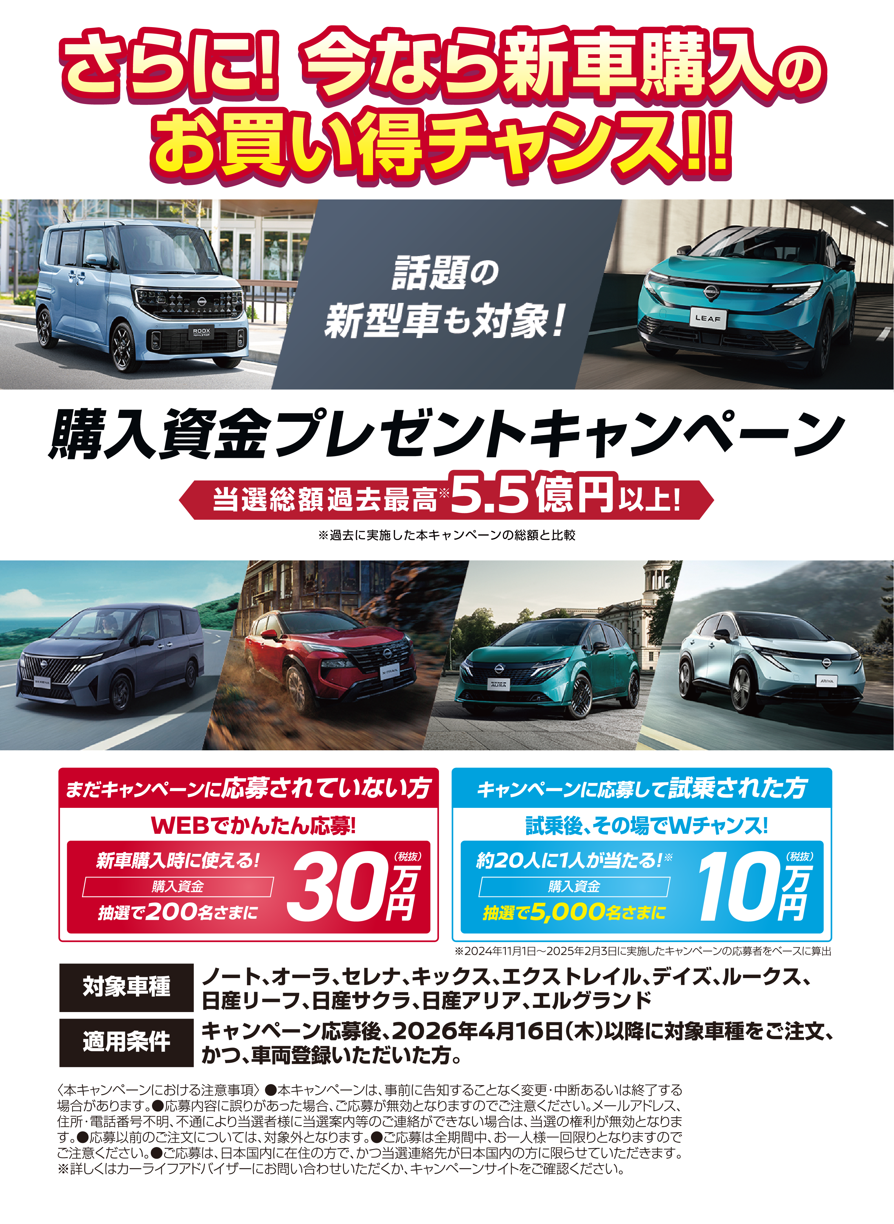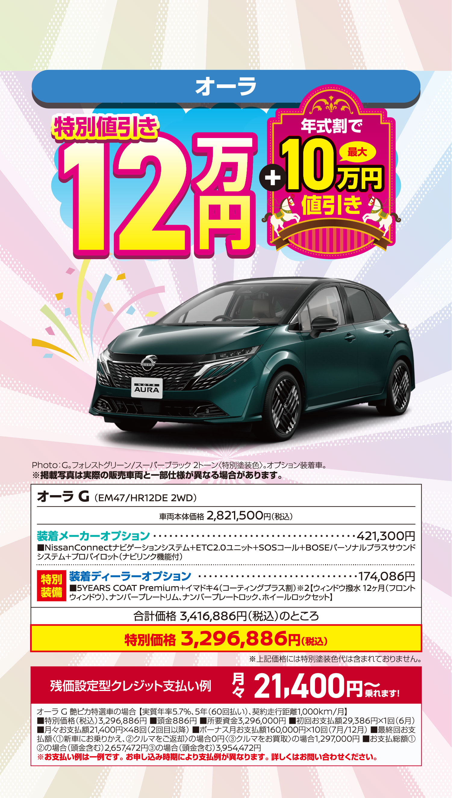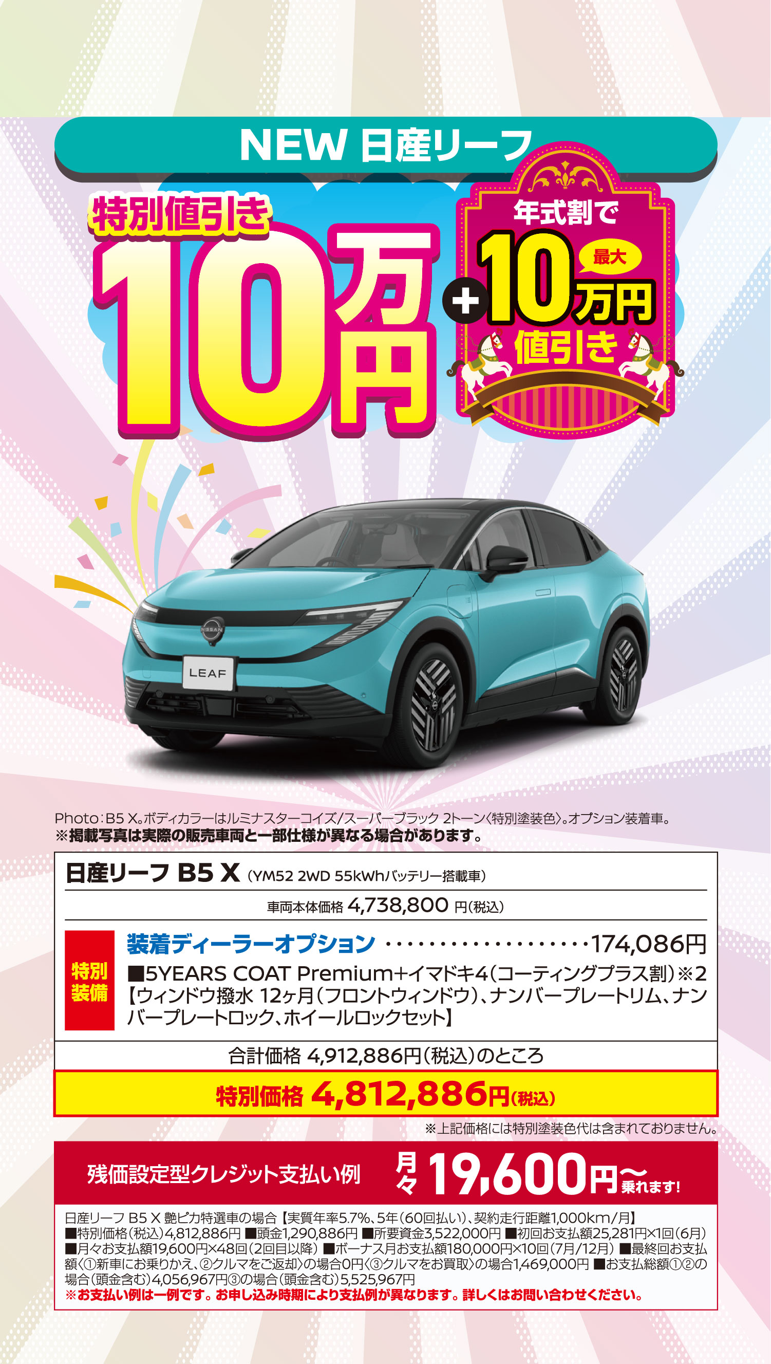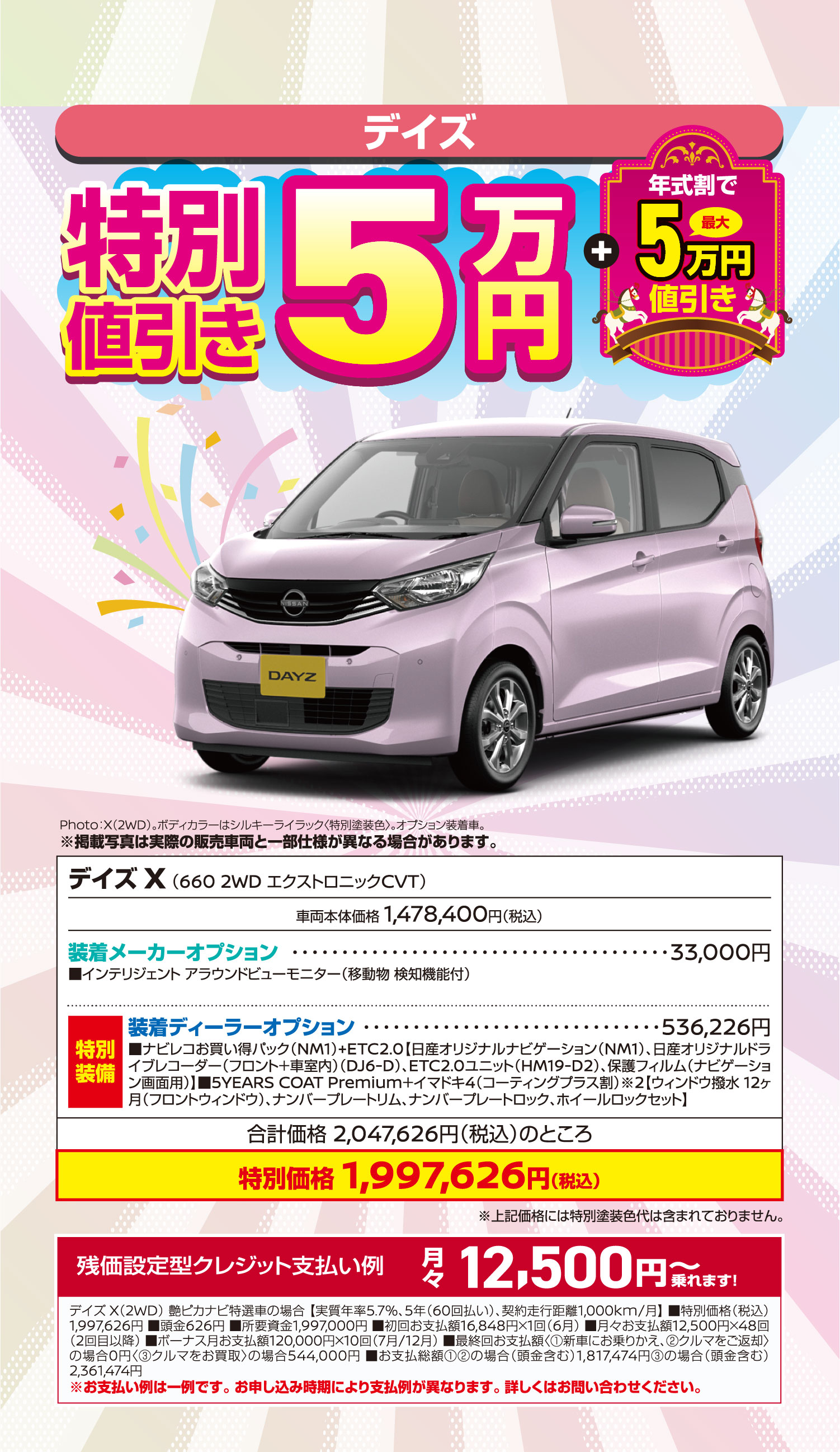 〈残価設定型クレジットについて〉●残価設定型クレジット対象の新車をご成約の方で、㈱日産フィナンシャルサービスをご利用の場合に限らせていただきます。●お支払い回数は3年(36回払い)、4年(48回払い)、5年(60回払い)より、また契約走行距離は1,000km/月、1,500km/月よりそれぞれお選びいただけます。●「日産リーフ」(新車)の場合、お支払い回数は4年(48回払い)、5年(60回払い)、6年(72回払い)よりお選びいただけます。また走行距離は1,000km/月、1,500km/月よりそれぞれお選びいただけますが、6年(72回払い)は1,000km/月のみとなります。●最終回の残価はお支払い回数や契約走行距離により異なります。●本クレジット最終回に新車にお乗りかえ、クルマを返却、クルマをお客さまが買取(残価を現金一括または再クレジットでお支払い)のいずれかをお選びいただけます。なお、車両返却の際、走行距離または内外装減点が「残価保証の条件」に定める基準を超える場合は、査定価格との差額をご負担いただきます。●本クレジットは予告なく終了する場合がございます。あらかじめご了承ください。●お申し込みいただきましても審査の結果お受けできない場合もございます。<価格について>※価格には保険料、税金(消費税を除く)、登録(届出)等に伴う諸費用、リサイル料金、オプション代、特別塗装色代は含まれておりません。別途申し受けます。※表示している価格には消費税が含まれております。※ボディカラー等は実際の色とは異なって見える場合があります。掲載内容は2026年4月24日現在のもので車両等の各情報、内容は予告なく変更または終了する場合があります。詳しくはカーライフアドバイザーにお問い合わせください。
