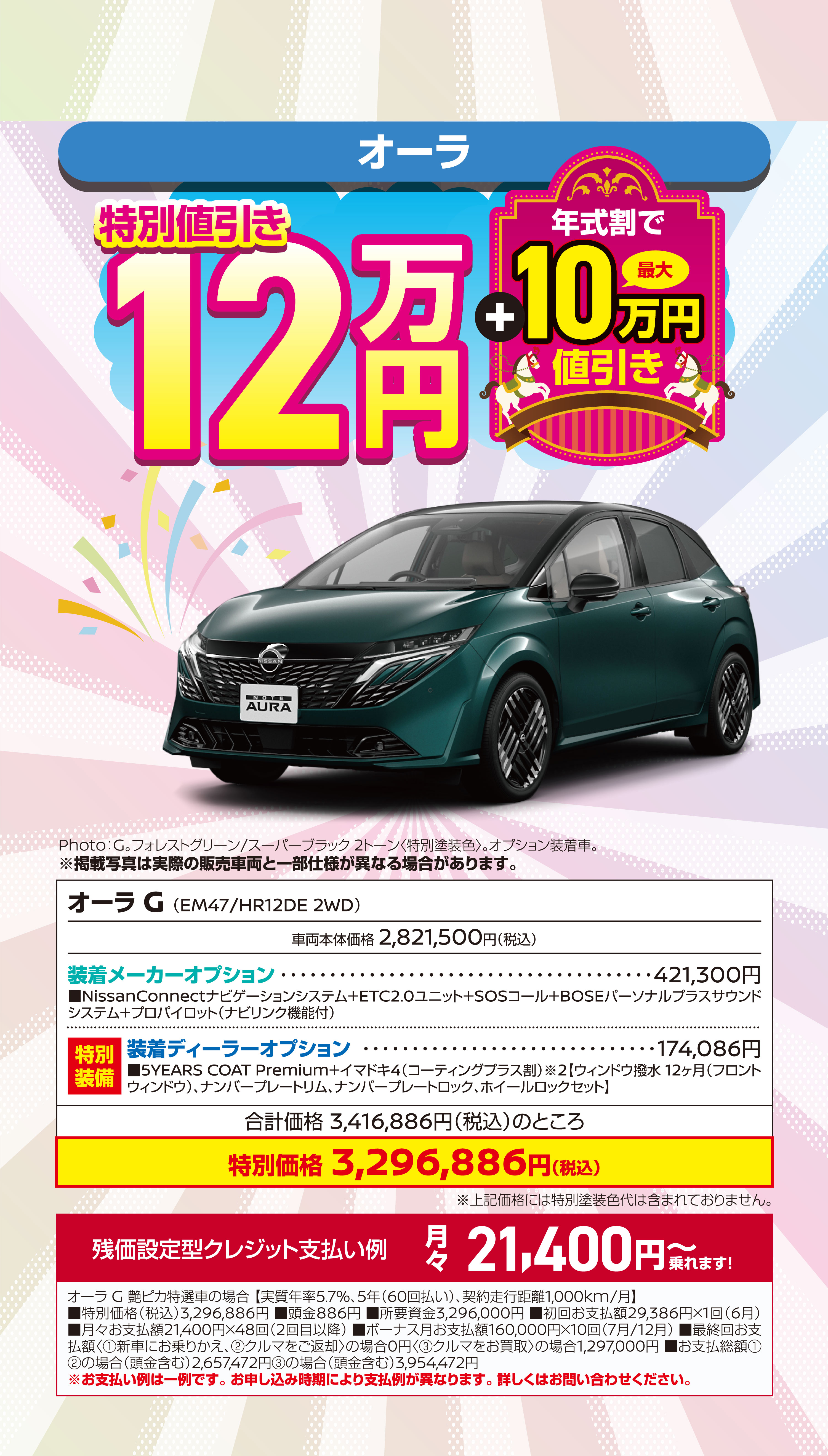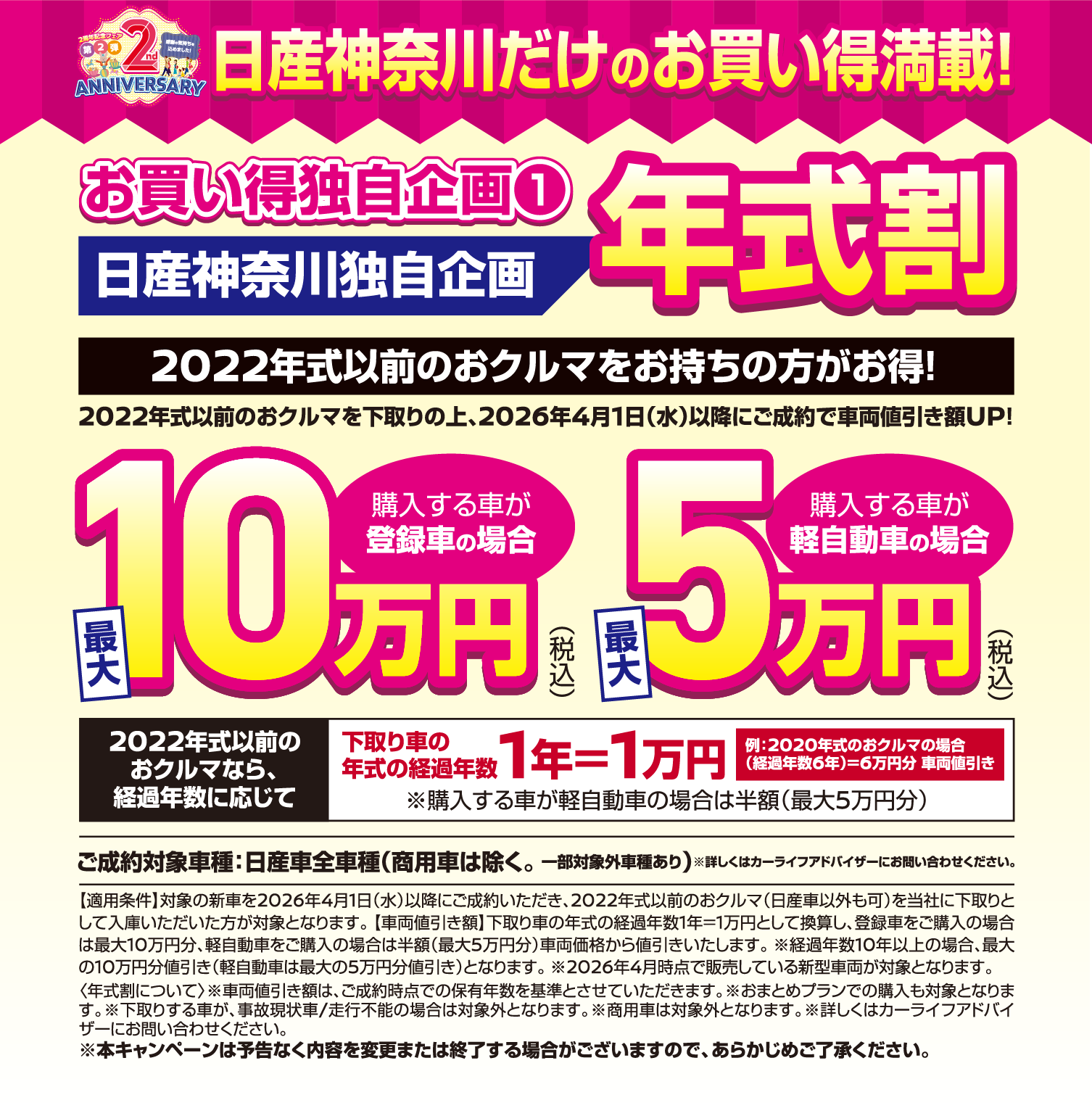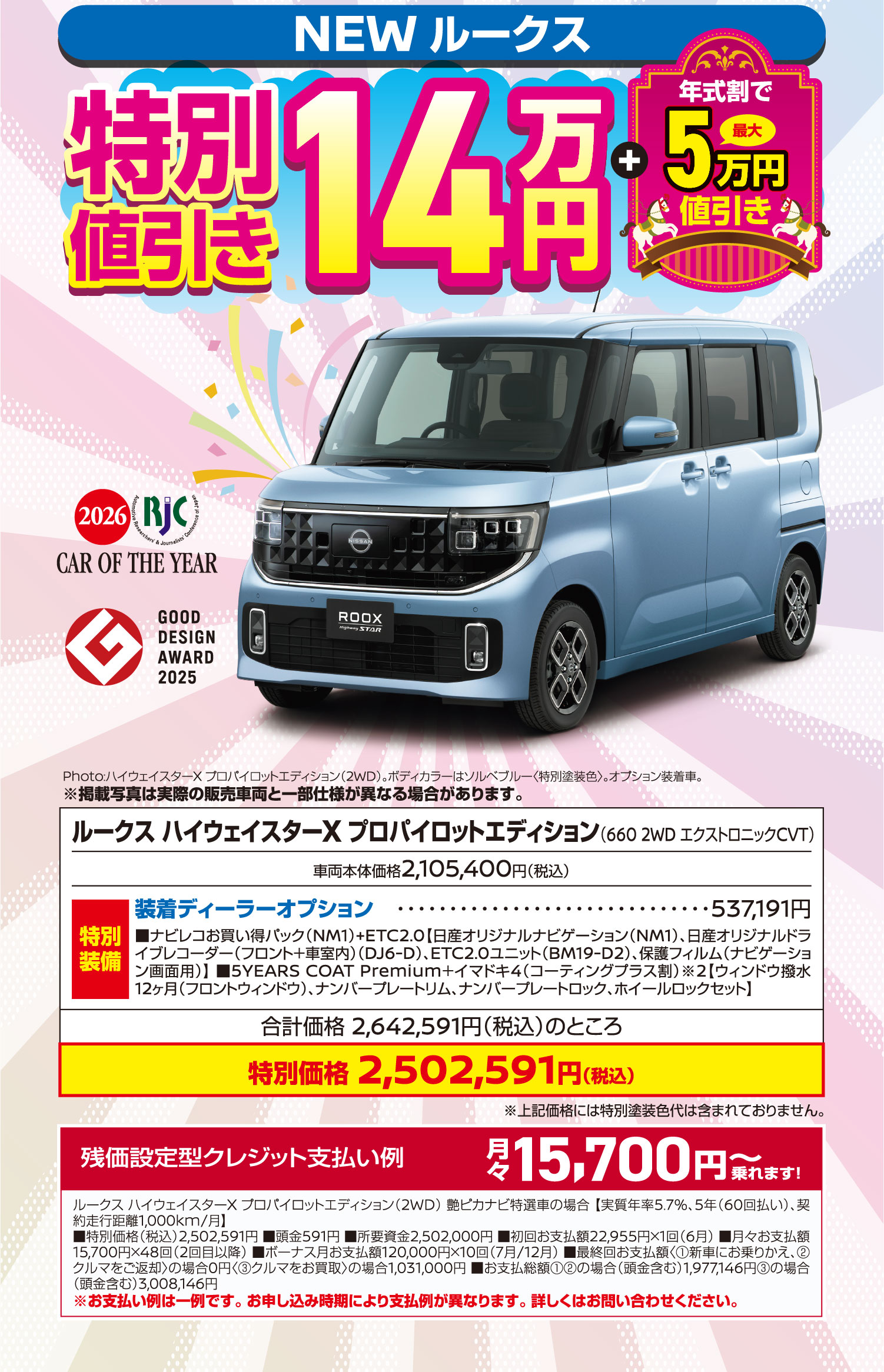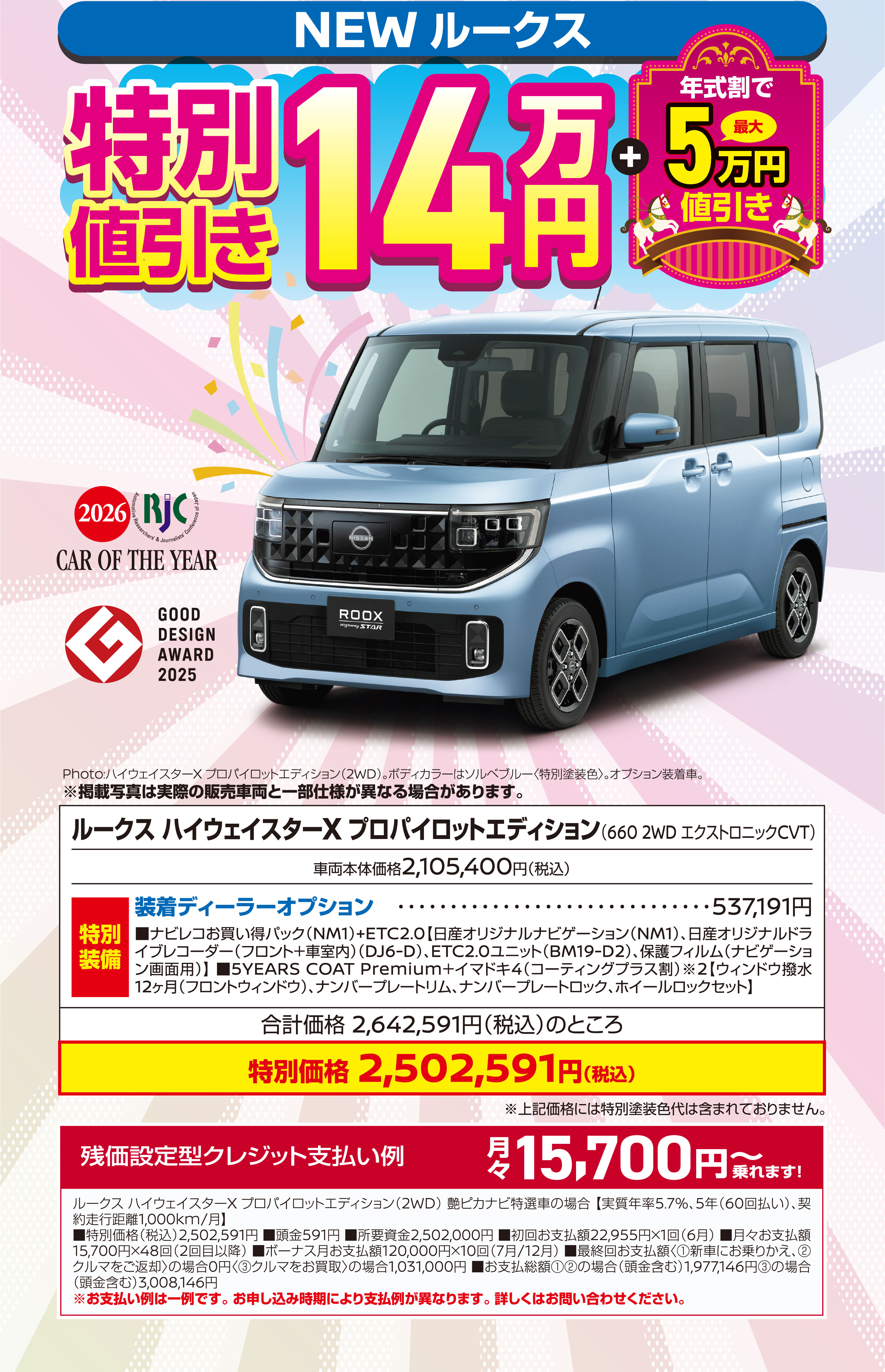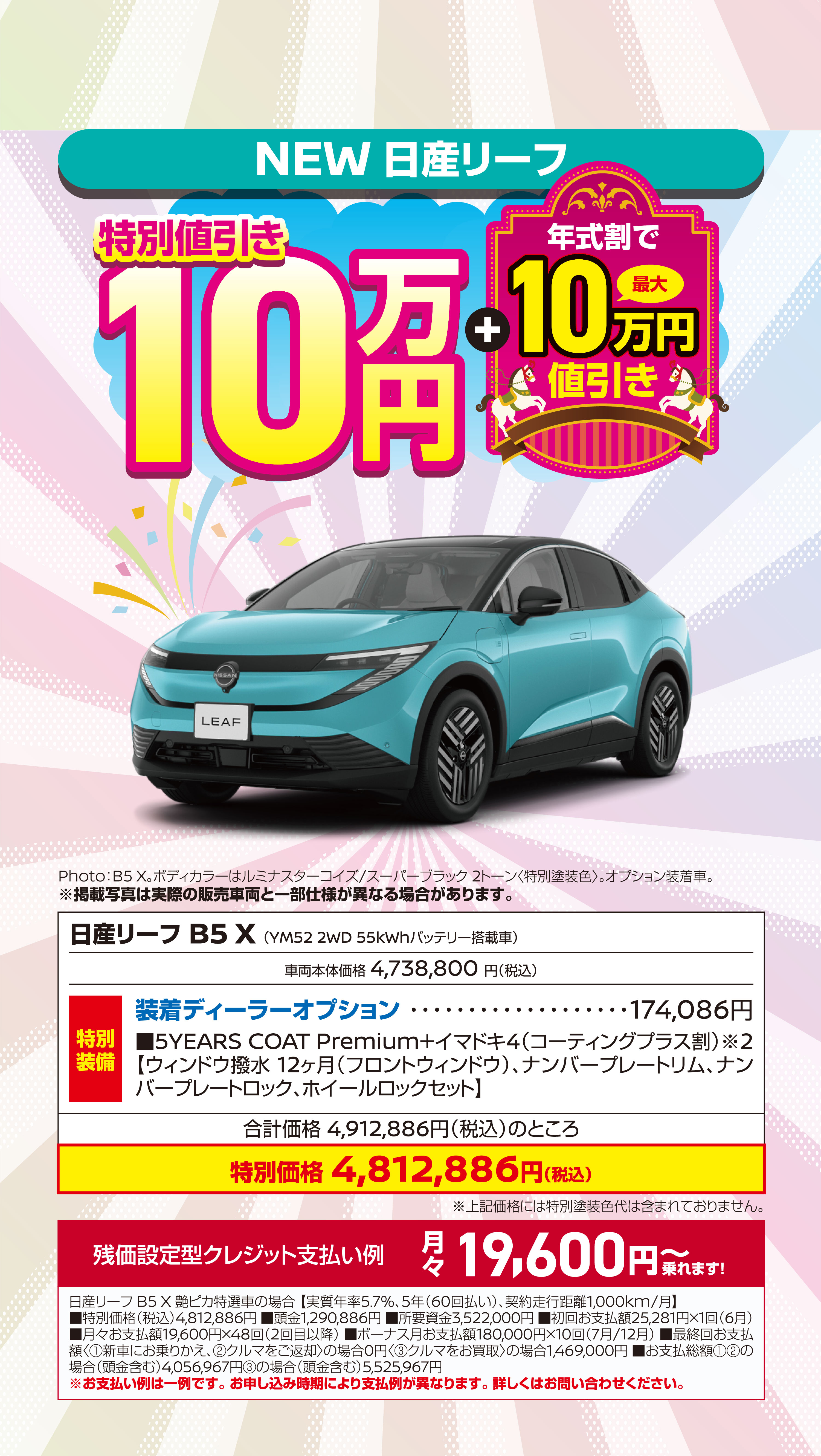 〈残価設定型クレジットについて〉●残価設定型クレジット対象の新車をご成約の方で、㈱日産フィナンシャルサービスをご利用の場合に限らせていただきます。●お支払い回数は3年(36回払い)、4年(48回払い)、5年(60回払い)より、また契約走行距離は1,000km/月、1,500km/月よりそれぞれお選びいただけます。●「日産リーフ」(新車)の場合、お支払い回数は4年(48回払い)、5年(60回払い)、6年(72回払い)よりお選びいただけます。また走行距離は1,000km/月、1,500km/月よりそれぞれお選びいただけますが、6年(72回払い)は1,000km/月のみとなります。●最終回の残価はお支払い回数や契約走行距離により異なります。●本クレジット最終回に新車にお乗りかえ、クルマを返却、クルマをお客さまが買取(残価を現金一括または再クレジットでお支払い)のいずれかをお選びいただけます。なお、車両返却の際、走行距離または内外装減点が「残価保証の条件」に定める基準を超える場合は、査定価格との差額をご負担いただきます。●本クレジットは予告なく終了する場合がございます。あらかじめご了承ください。●お申し込みいただきましても審査の結果お受けできない場合もございます。<価格について>※価格には保険料、税金(消費税を除く)、登録(届出)等に伴う諸費用、リサイル料金、オプション代、特別塗装色代は含まれておりません。別途申し受けます。※表示している価格には消費税が含まれております。※ボディカラー等は実際の色とは異なって見える場合があります。掲載内容は2026年4月24日現在のもので車両等の各情報、内容は予告なく変更または終了する場合があります。詳しくはカーライフアドバイザーにお問い合わせください。