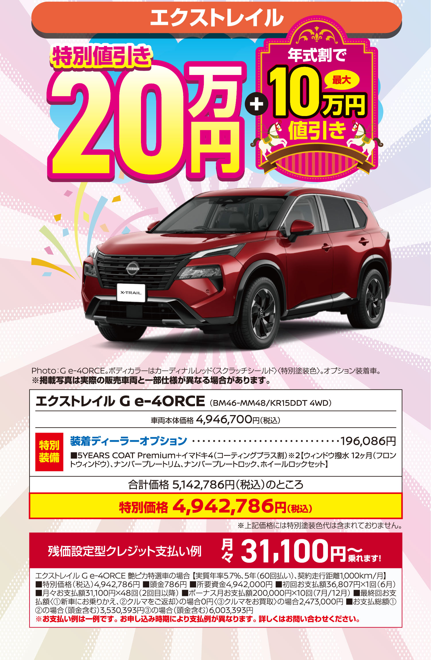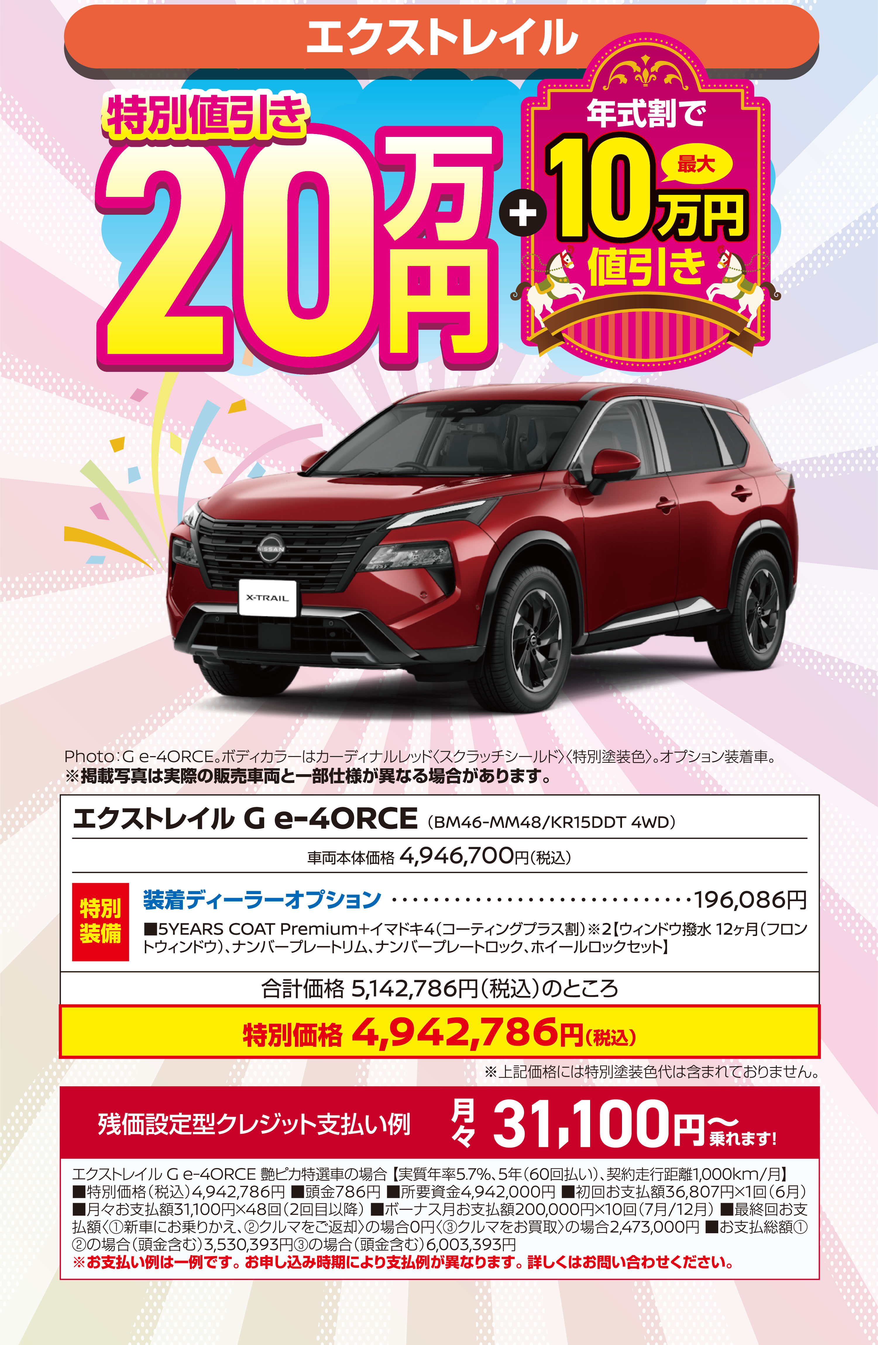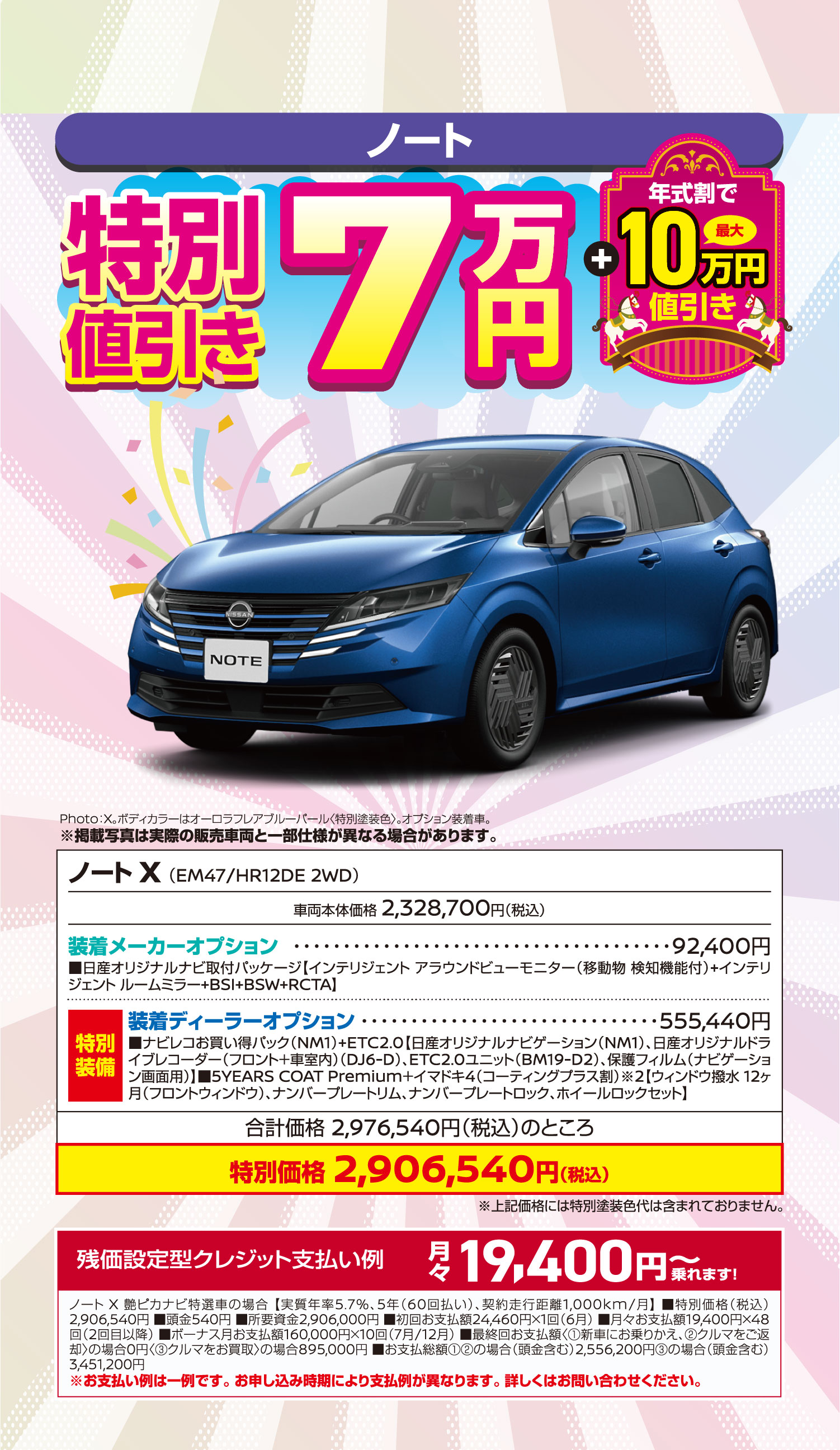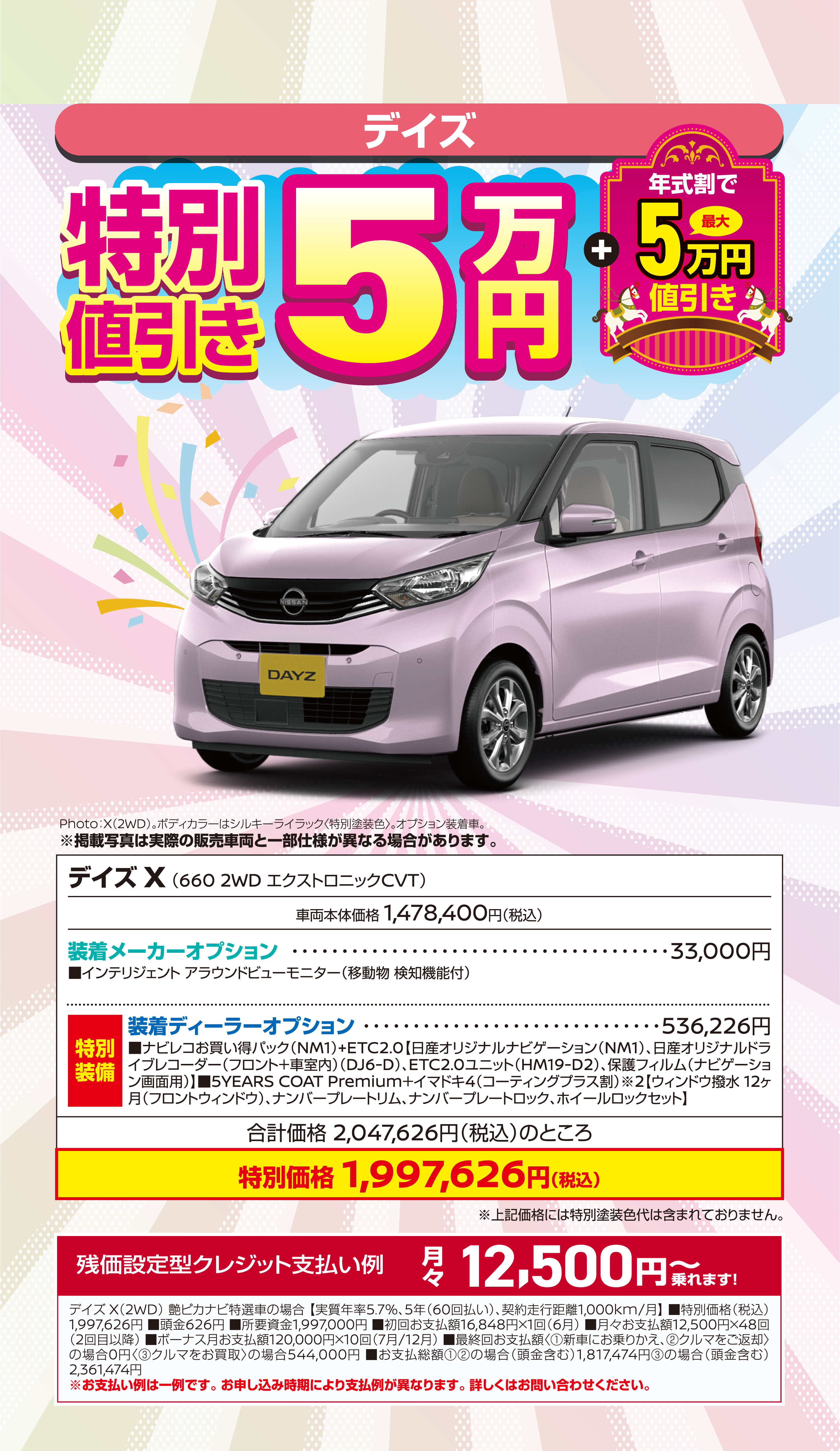 〈残価設定型クレジットについて〉●残価設定型クレジット対象の新車をご成約の方で、㈱日産フィナンシャルサービスをご利用の場合に限らせていただきます。●お支払い回数は3年(36回払い)、4年(48回払い)、5年(60回払い)より、また契約走行距離は1,000km/月、1,500km/月よりそれぞれお選びいただけます。●「日産リーフ」(新車)の場合、お支払い回数は4年(48回払い)、5年(60回払い)、6年(72回払い)よりお選びいただけます。また走行距離は1,000km/月、1,500km/月よりそれぞれお選びいただけますが、6年(72回払い)は1,000km/月のみとなります。●最終回の残価はお支払い回数や契約走行距離により異なります。●本クレジット最終回に新車にお乗りかえ、クルマを返却、クルマをお客さまが買取(残価を現金一括または再クレジットでお支払い)のいずれかをお選びいただけます。なお、車両返却の際、走行距離または内外装減点が「残価保証の条件」に定める基準を超える場合は、査定価格との差額をご負担いただきます。●本クレジットは予告なく終了する場合がございます。あらかじめご了承ください。●お申し込みいただきましても審査の結果お受けできない場合もございます。<価格について>※価格には保険料、税金(消費税を除く)、登録(届出)等に伴う諸費用、リサイル料金、オプション代、特別塗装色代は含まれておりません。別途申し受けます。※表示している価格には消費税が含まれております。※ボディカラー等は実際の色とは異なって見える場合があります。掲載内容は2026年4月24日現在のもので車両等の各情報、内容は予告なく変更または終了する場合があります。詳しくはカーライフアドバイザーにお問い合わせください。