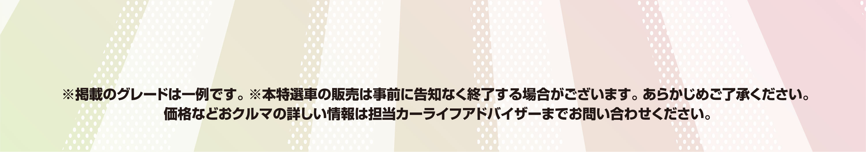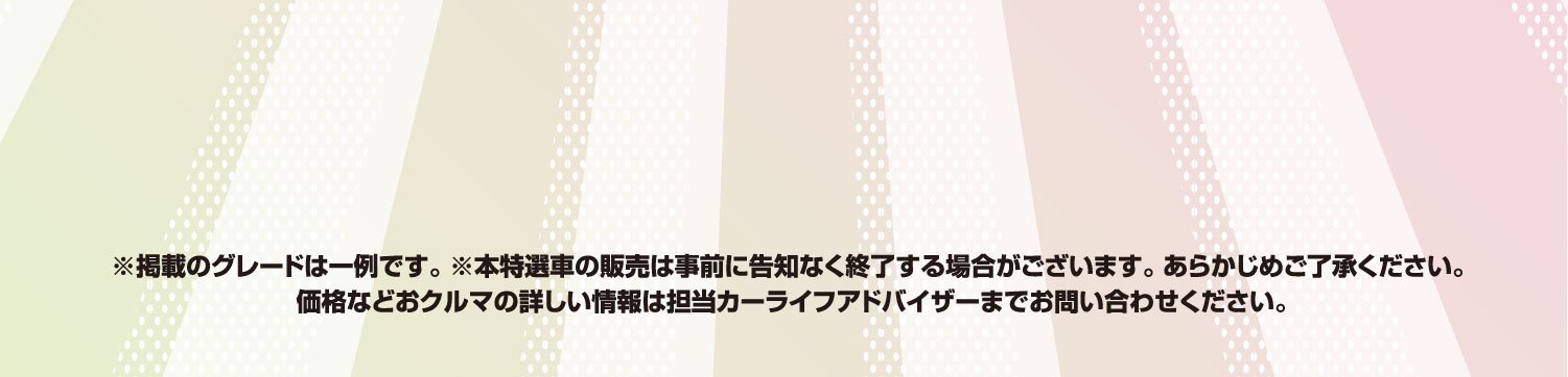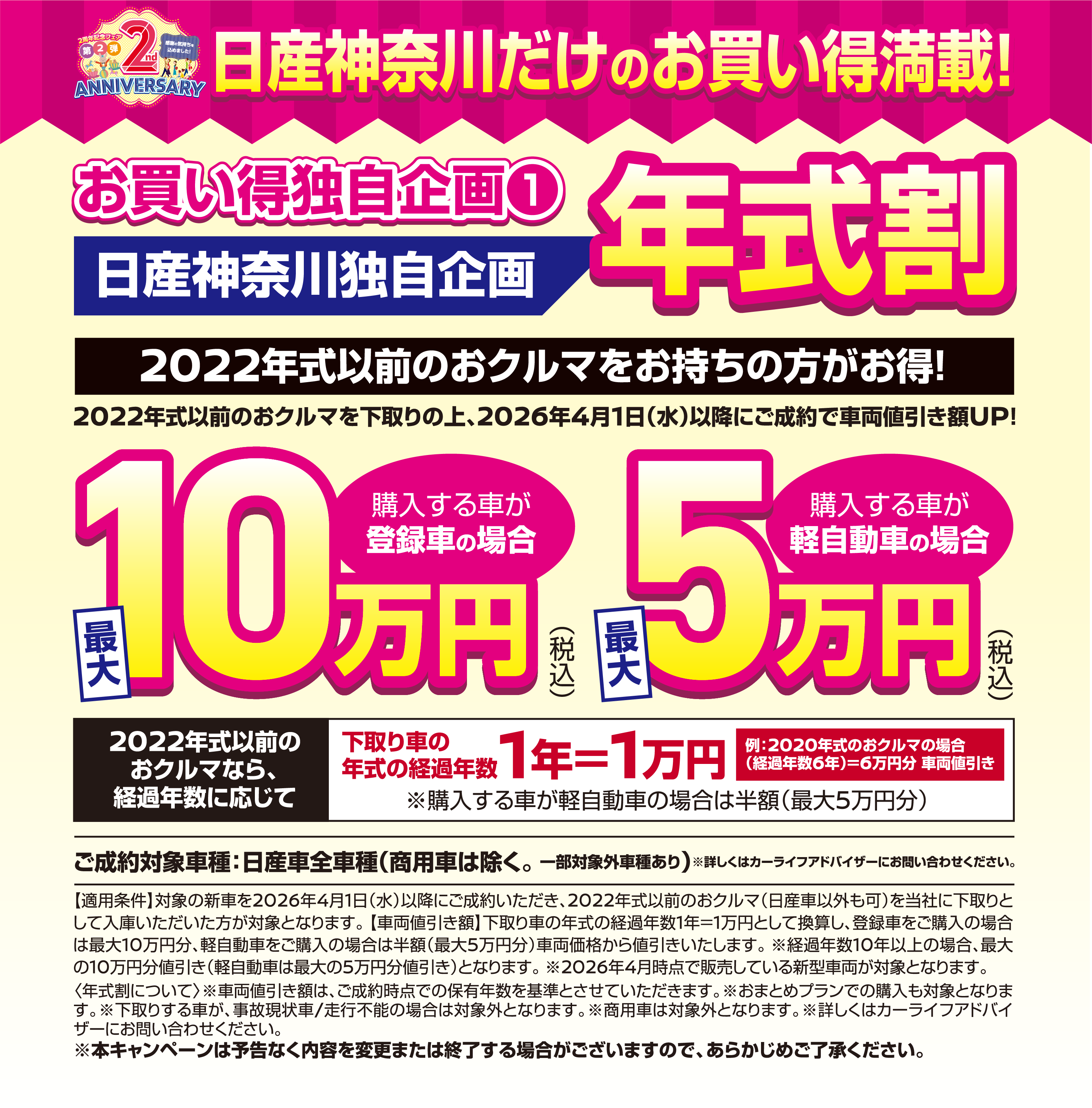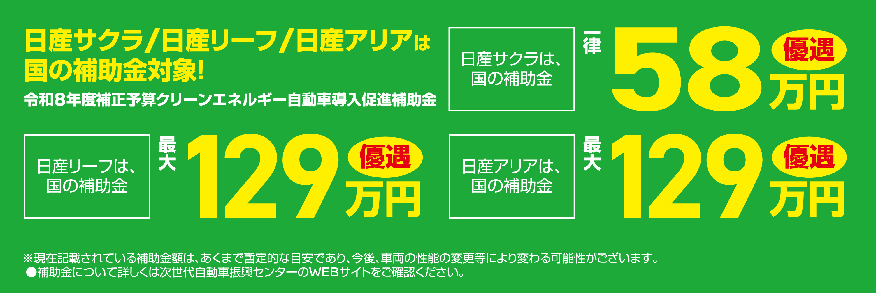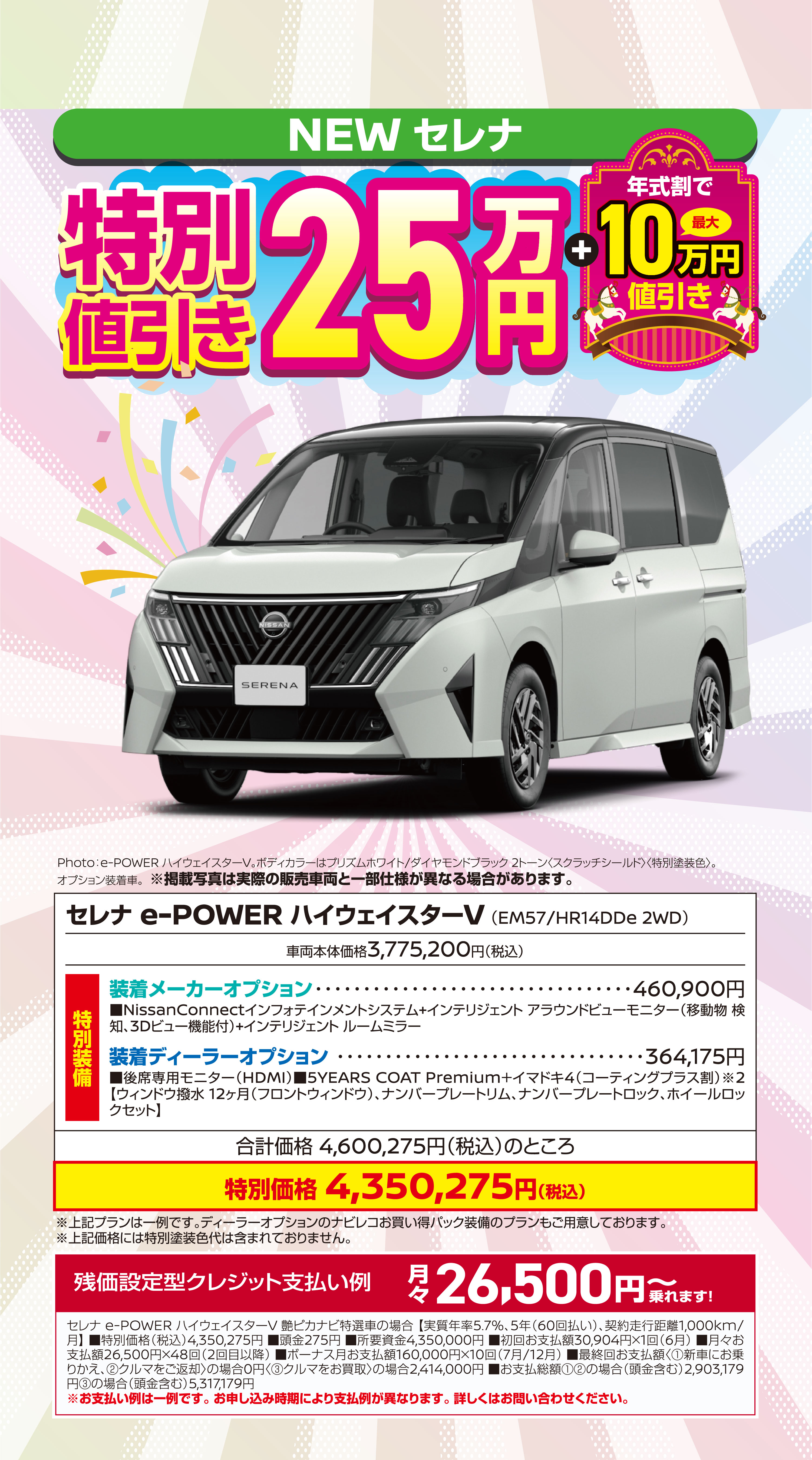 〈残価設定型クレジットについて〉●残価設定型クレジット対象の新車をご成約の方で、㈱日産フィナンシャルサービスをご利用の場合に限らせていただきます。●お支払い回数は3年(36回払い)、4年(48回払い)、5年(60回払い)より、また契約走行距離は1,000km/月、1,500km/月よりそれぞれお選びいただけます。●「日産リーフ」(新車)の場合、お支払い回数は4年(48回払い)、5年(60回払い)、6年(72回払い)よりお選びいただけます。また走行距離は1,000km/月、1,500km/月よりそれぞれお選びいただけますが、6年(72回払い)は1,000km/月のみとなります。●最終回の残価はお支払い回数や契約走行距離により異なります。●本クレジット最終回に新車にお乗りかえ、クルマを返却、クルマをお客さまが買取(残価を現金一括または再クレジットでお支払い)のいずれかをお選びいただけます。なお、車両返却の際、走行距離または内外装減点が「残価保証の条件」に定める基準を超える場合は、査定価格との差額をご負担いただきます。●本クレジットは予告なく終了する場合がございます。あらかじめご了承ください。●お申し込みいただきましても審査の結果お受けできない場合もございます。<価格について>※価格には保険料、税金(消費税を除く)、登録(届出)等に伴う諸費用、リサイル料金、オプション代、特別塗装色代は含まれておりません。別途申し受けます。※表示している価格には消費税が含まれております。※ボディカラー等は実際の色とは異なって見える場合があります。掲載内容は2026年4月24日現在のもので車両等の各情報、内容は予告なく変更または終了する場合があります。詳しくはカーライフアドバイザーにお問い合わせください。