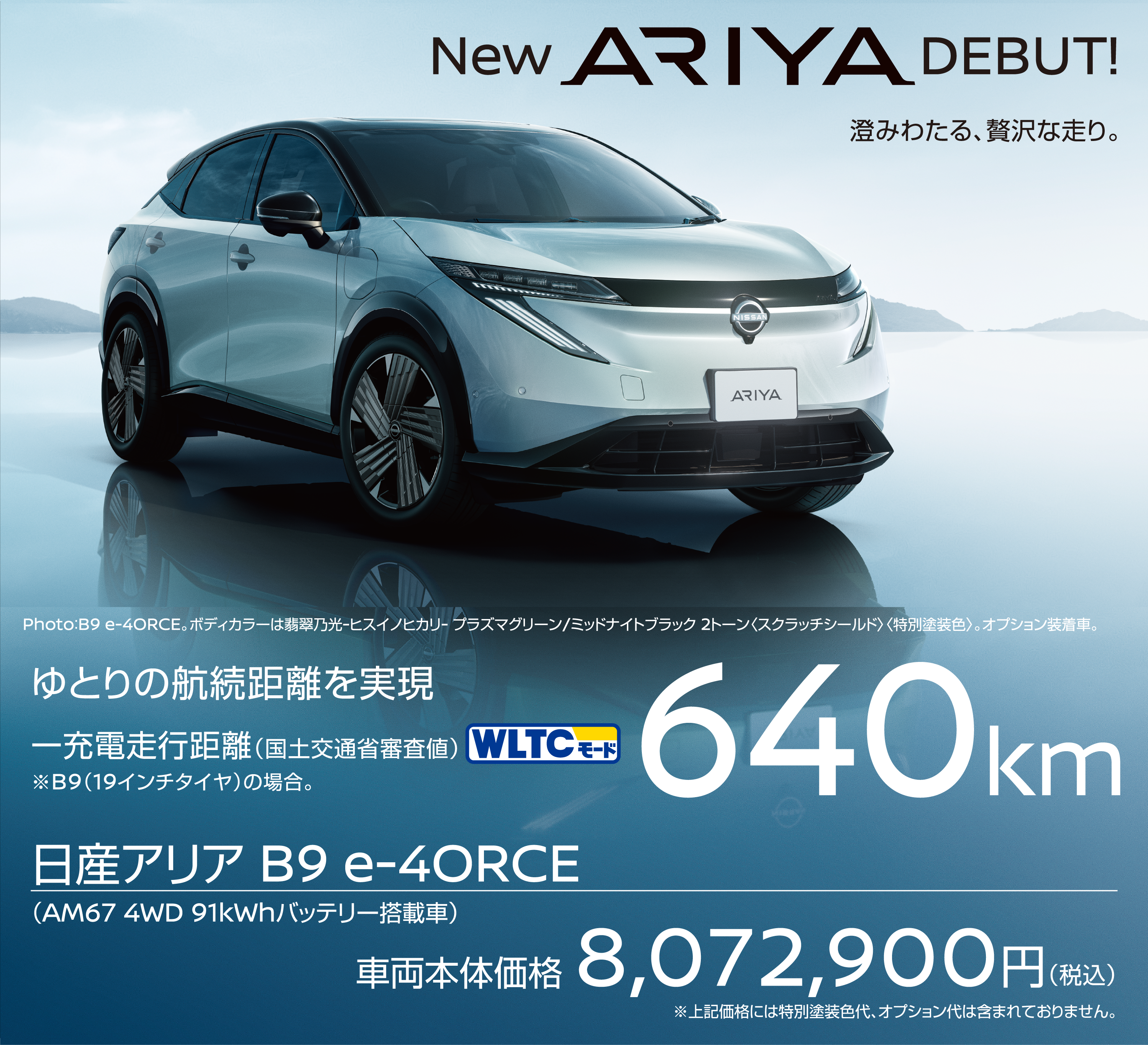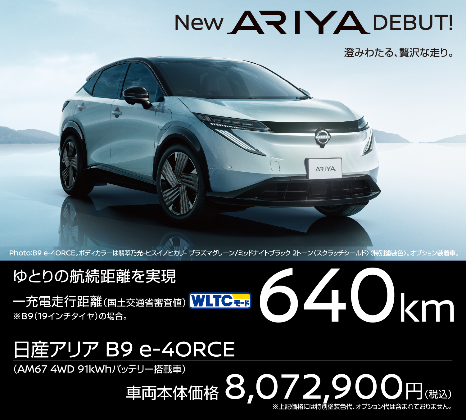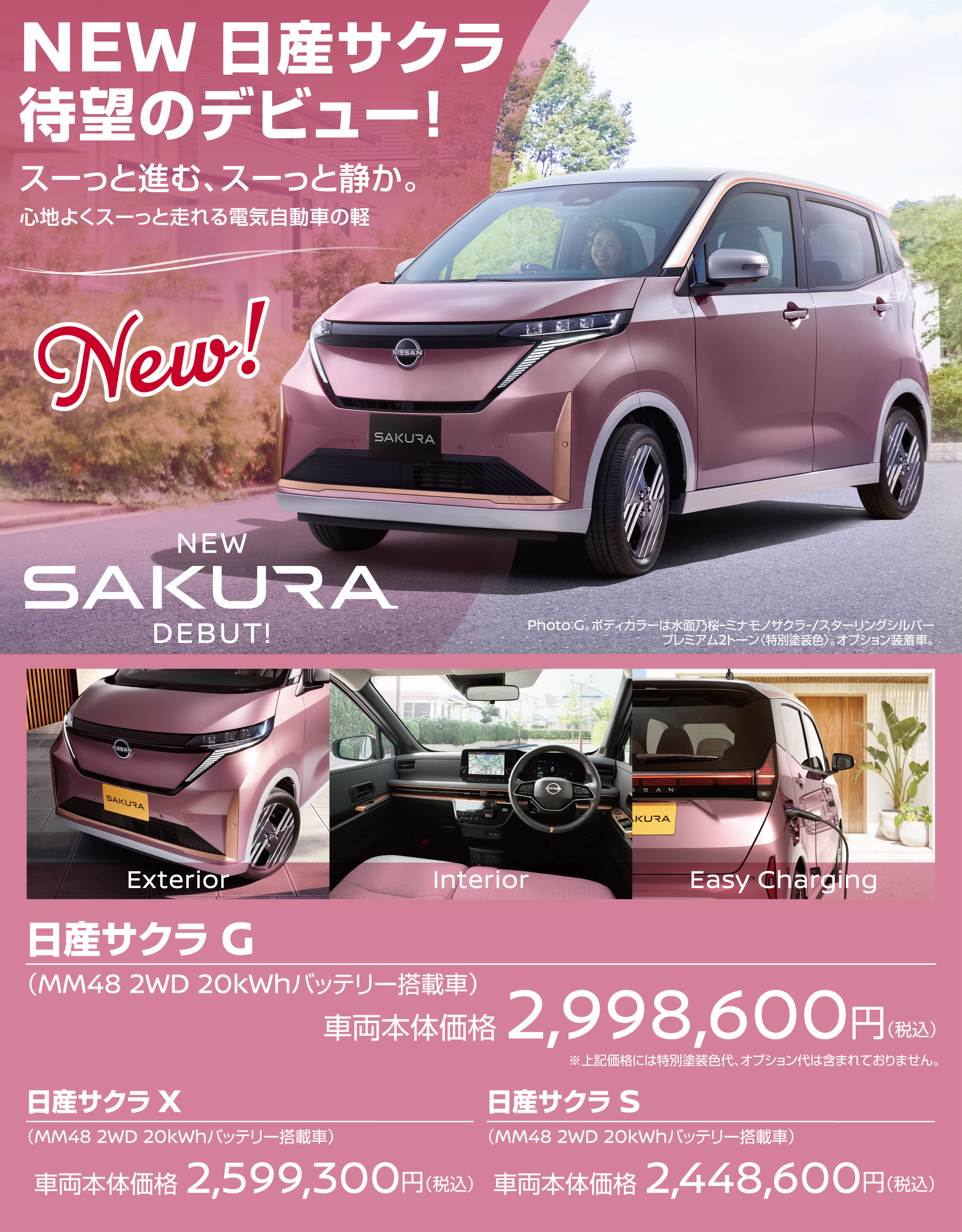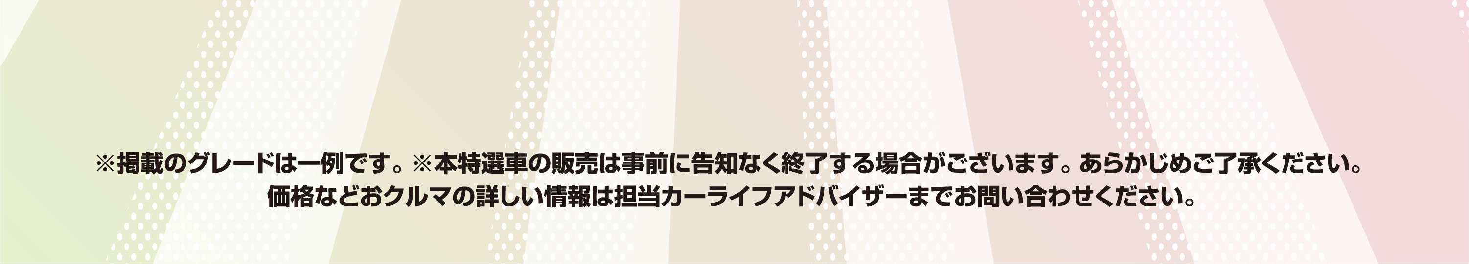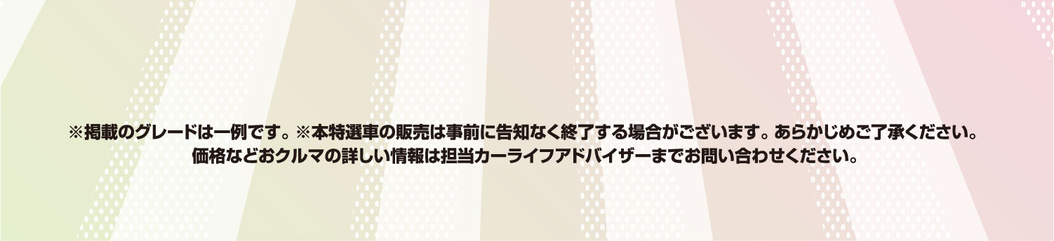 〈残価設定型クレジットについて〉●残価設定型クレジット対象の新車をご成約の方で、㈱日産フィナンシャルサービスをご利用の場合に限らせていただきます。●お支払い回数は3年(36回払い)、4年(48回払い)、5年(60回払い)より、また契約走行距離は1,000km/月、1,500km/月よりそれぞれお選びいただけます。●「日産リーフ」(新車)の場合、お支払い回数は4年(48回払い)、5年(60回払い)、6年(72回払い)よりお選びいただけます。また走行距離は1,000km/月、1,500km/月よりそれぞれお選びいただけますが、6年(72回払い)は1,000km/月のみとなります。●最終回の残価はお支払い回数や契約走行距離により異なります。●本クレジット最終回に新車にお乗りかえ、クルマを返却、クルマをお客さまが買取(残価を現金一括または再クレジットでお支払い)のいずれかをお選びいただけます。なお、車両返却の際、走行距離または内外装減点が「残価保証の条件」に定める基準を超える場合は、査定価格との差額をご負担いただきます。●本クレジットは予告なく終了する場合がございます。あらかじめご了承ください。●お申し込みいただきましても審査の結果お受けできない場合もございます。<価格について>※価格には保険料、税金(消費税を除く)、登録(届出)等に伴う諸費用、リサイル料金、オプション代、特別塗装色代は含まれておりません。別途申し受けます。※表示している価格には消費税が含まれております。※ボディカラー等は実際の色とは異なって見える場合があります。掲載内容は2026年4月24日現在のもので車両等の各情報、内容は予告なく変更または終了する場合があります。詳しくはカーライフアドバイザーにお問い合わせください。