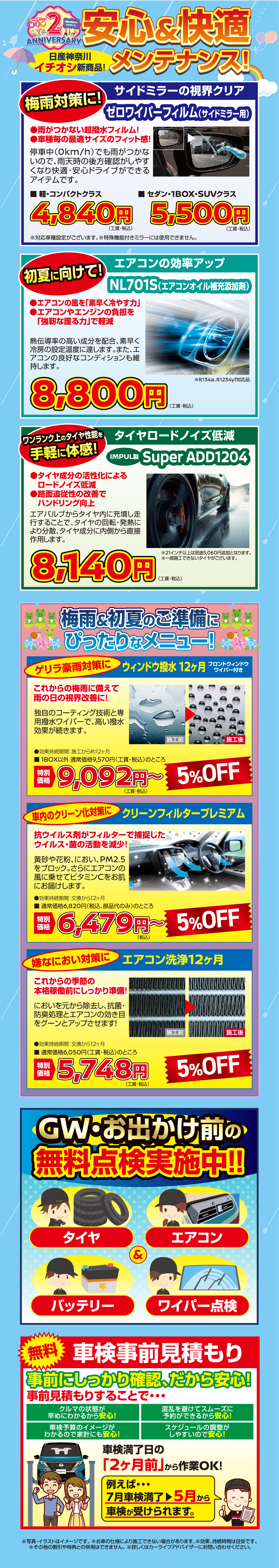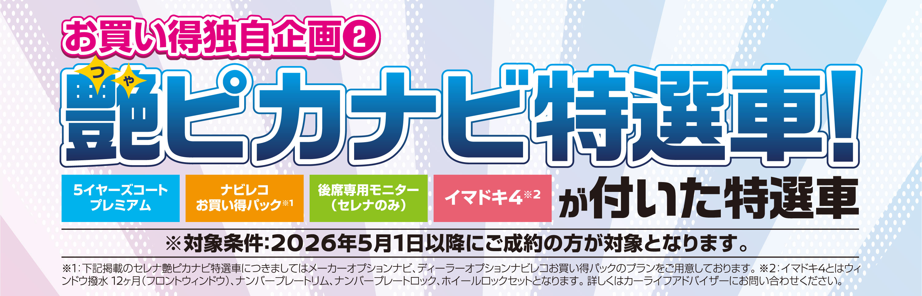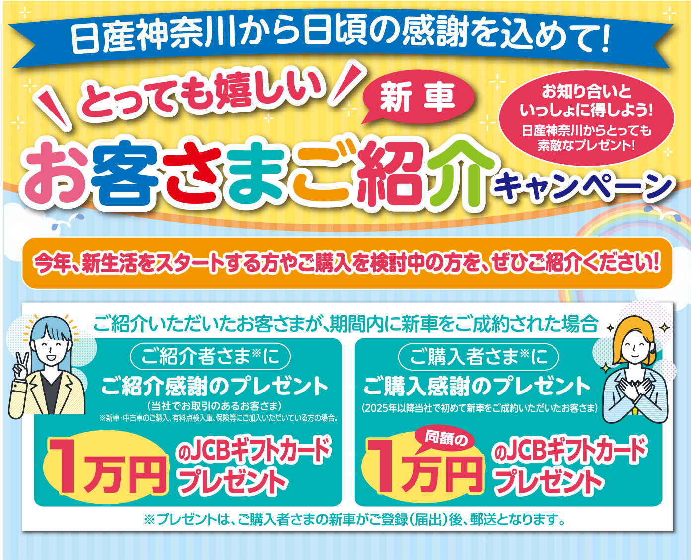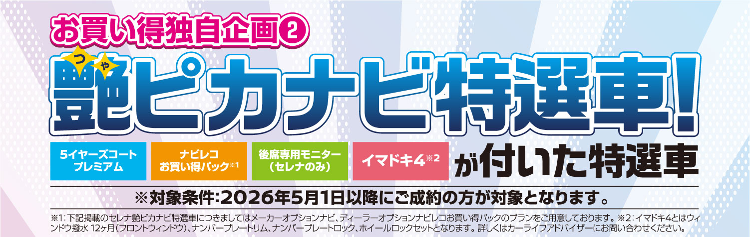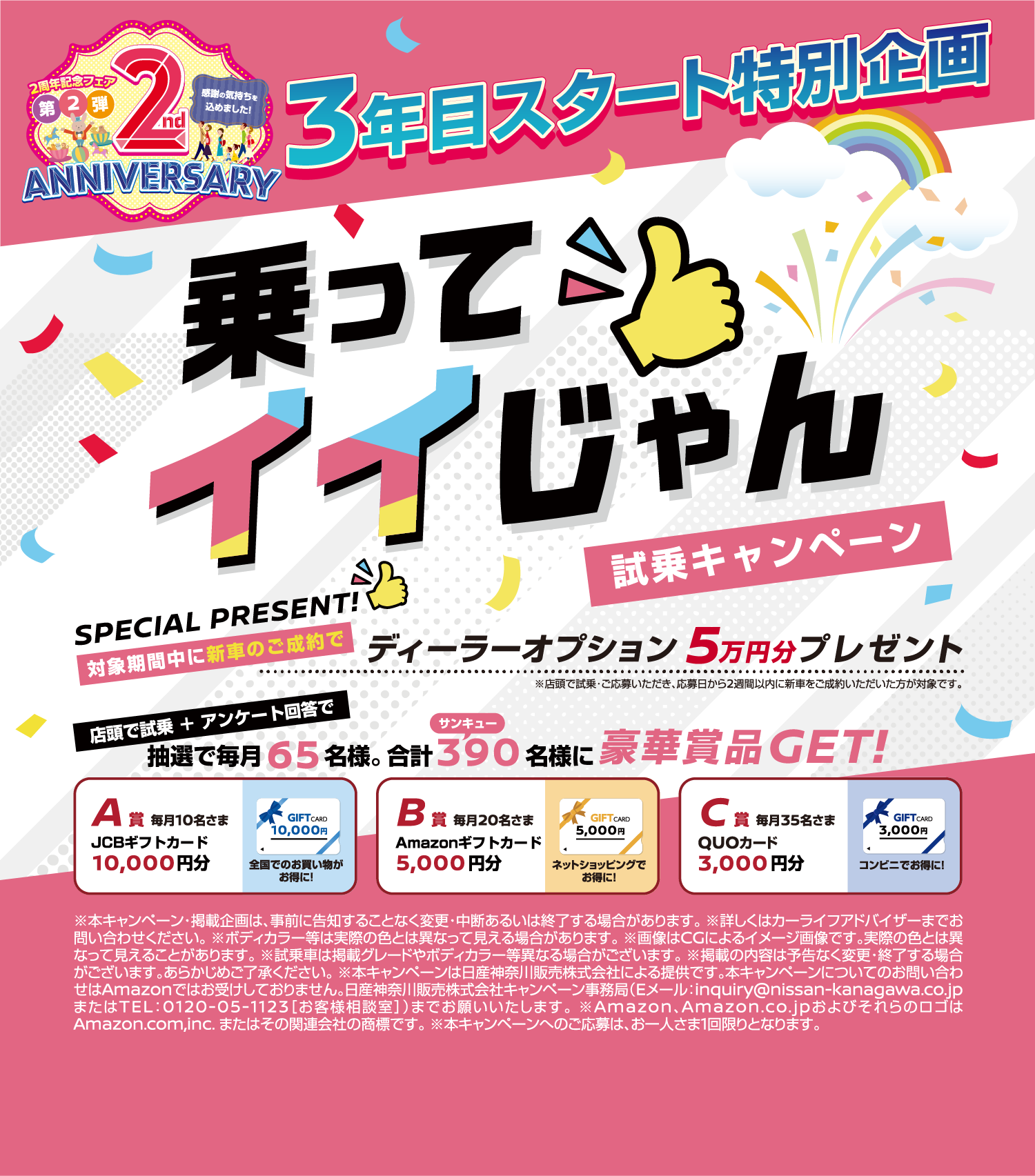 〈残価設定型クレジットについて〉●残価設定型クレジット対象の新車をご成約の方で、㈱日産フィナンシャルサービスをご利用の場合に限らせていただきます。●お支払い回数は3年(36回払い)、4年(48回払い)、5年(60回払い)より、また契約走行距離は1,000km/月、1,500km/月よりそれぞれお選びいただけます。●「日産リーフ」(新車)の場合、お支払い回数は4年(48回払い)、5年(60回払い)、6年(72回払い)よりお選びいただけます。また走行距離は1,000km/月、1,500km/月よりそれぞれお選びいただけますが、6年(72回払い)は1,000km/月のみとなります。●最終回の残価はお支払い回数や契約走行距離により異なります。●本クレジット最終回に新車にお乗りかえ、クルマを返却、クルマをお客さまが買取(残価を現金一括または再クレジットでお支払い)のいずれかをお選びいただけます。なお、車両返却の際、走行距離または内外装減点が「残価保証の条件」に定める基準を超える場合は、査定価格との差額をご負担いただきます。●本クレジットは予告なく終了する場合がございます。あらかじめご了承ください。●お申し込みいただきましても審査の結果お受けできない場合もございます。<価格について>※価格には保険料、税金(消費税を除く)、登録(届出)等に伴う諸費用、リサイル料金、オプション代、特別塗装色代は含まれておりません。別途申し受けます。※表示している価格には消費税が含まれております。※ボディカラー等は実際の色とは異なって見える場合があります。掲載内容は2026年4月24日現在のもので車両等の各情報、内容は予告なく変更または終了する場合があります。詳しくはカーライフアドバイザーにお問い合わせください。